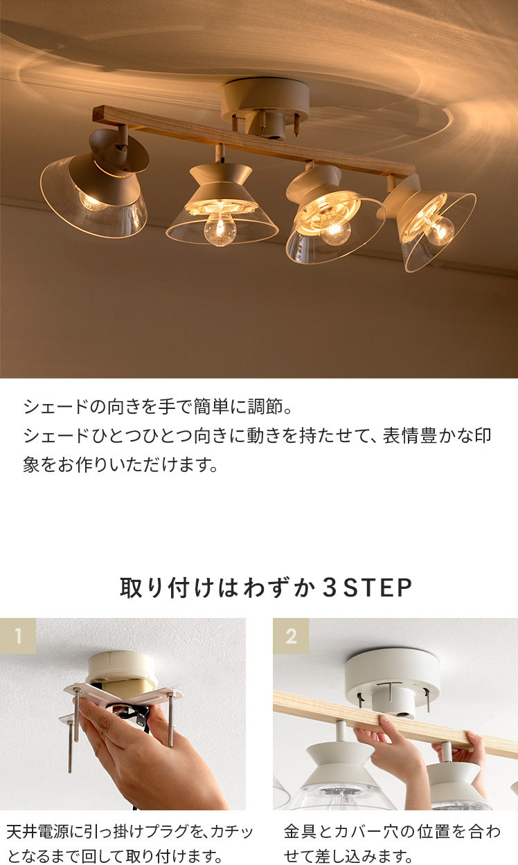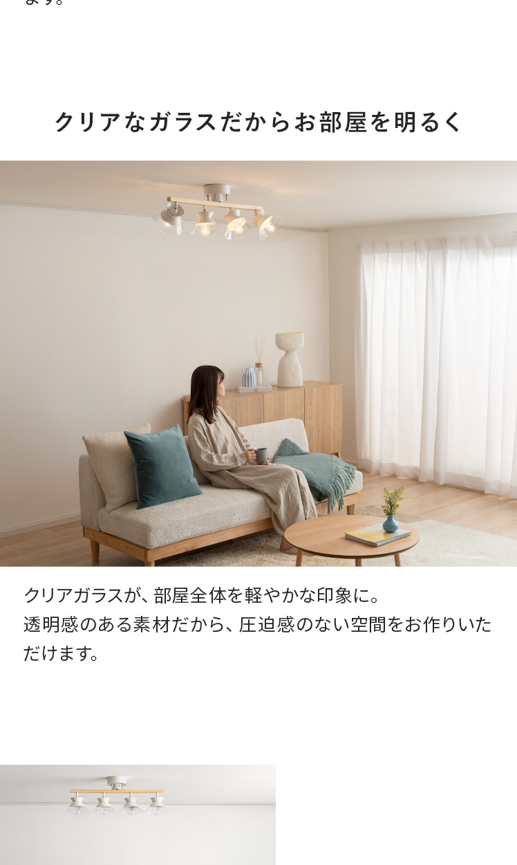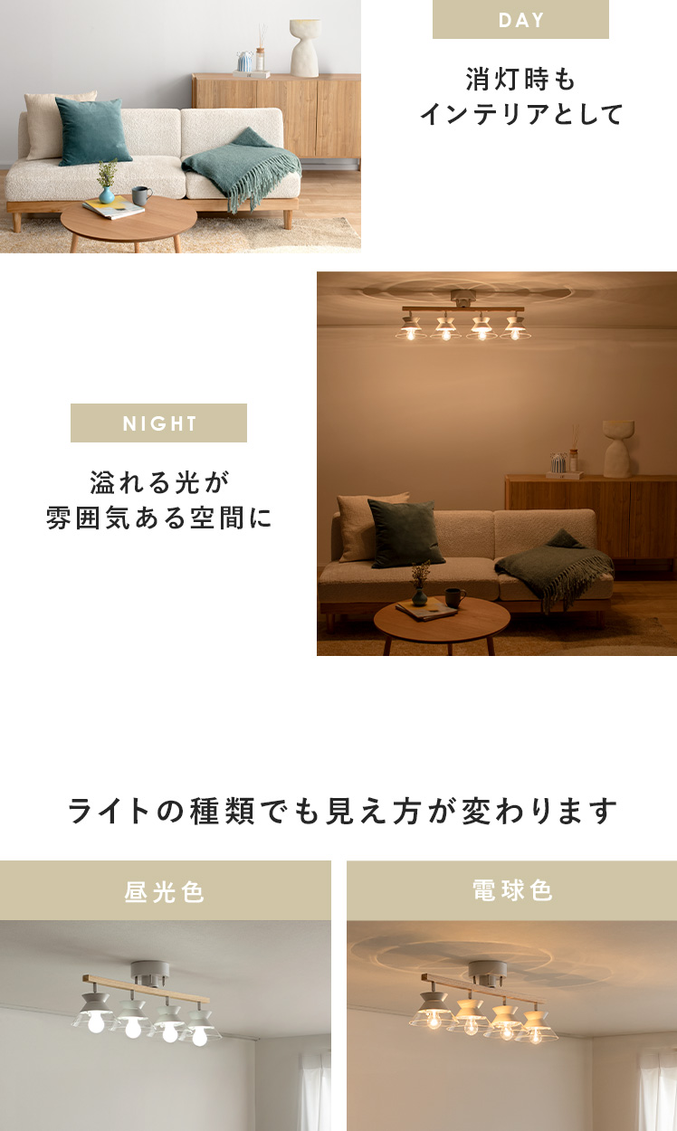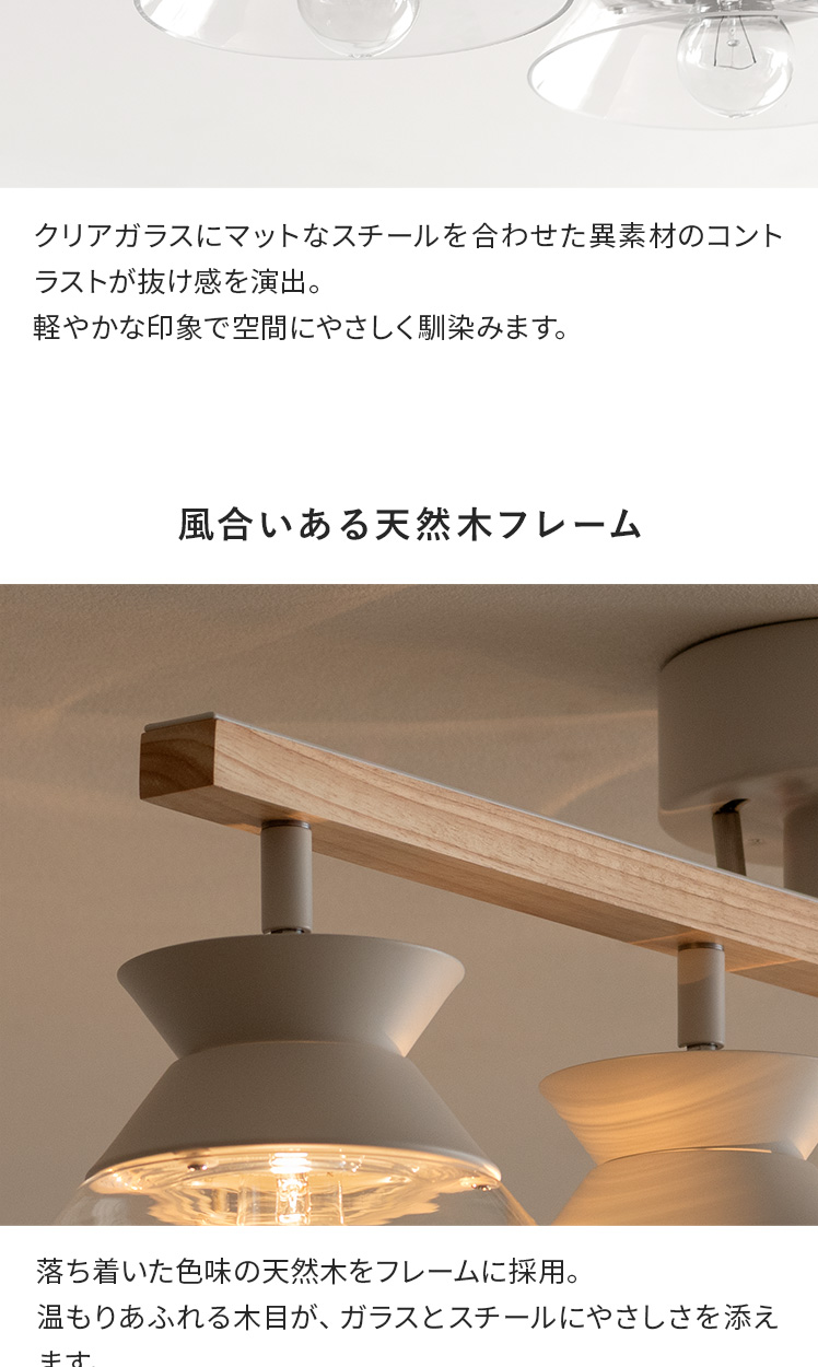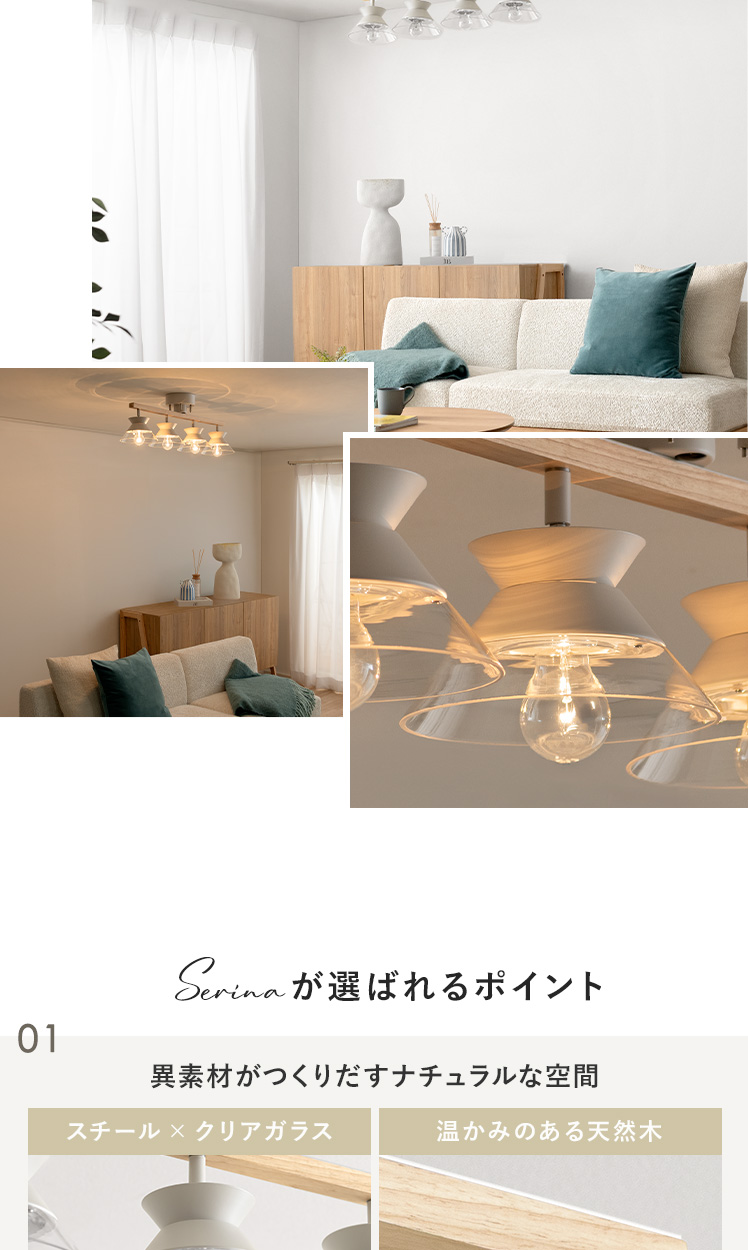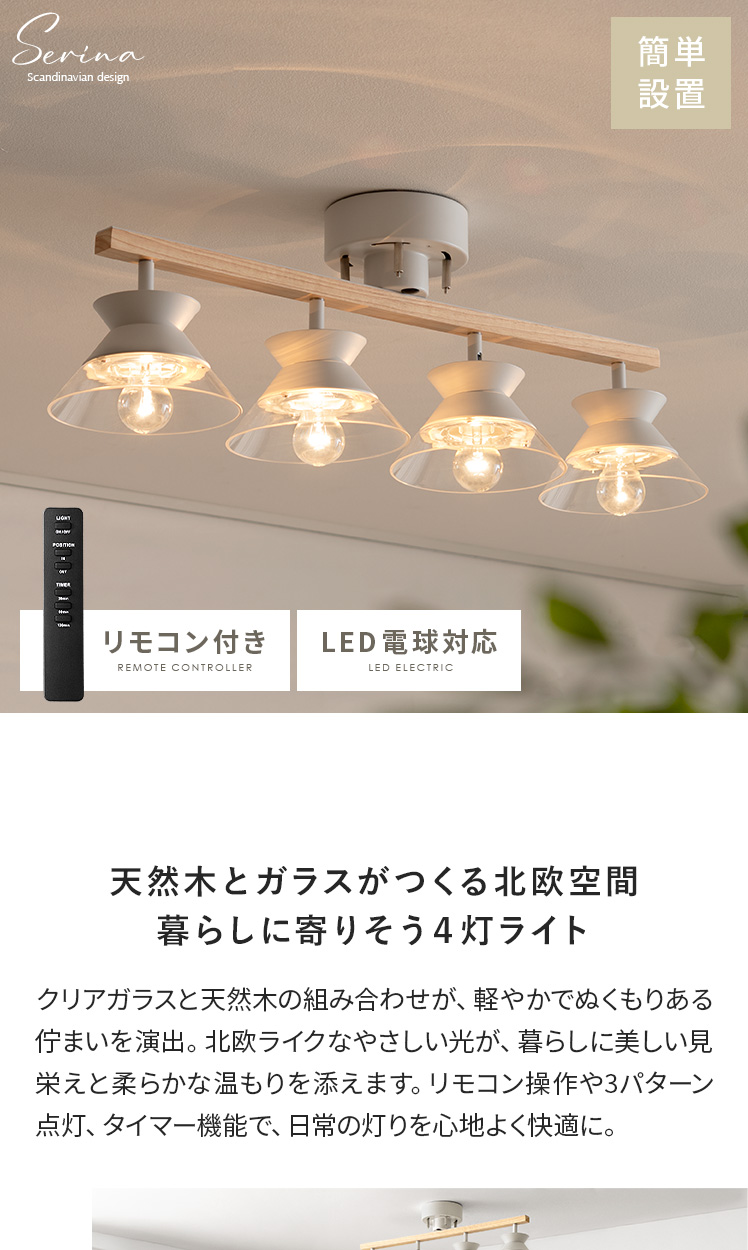 4灯シーリングライト Serina〔セリナ〕/クリアガラスと天然木の組み合わせが、軽やかでぬくもりある佇まいを演出。北欧ライクなやさしい光が、暮らしに美しい見栄えと柔らかな温もりを添えます。リモコン操作や3パターン点灯、タイマー機能で、日常の灯りを心地よく快適に。