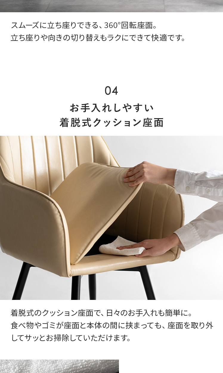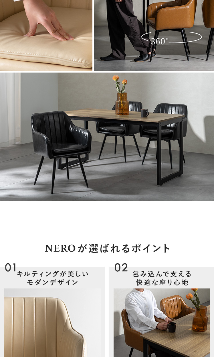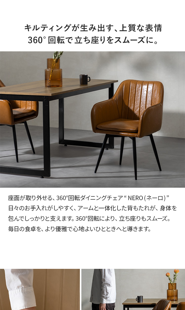 ダイニングチェアNERO〔ネーロ〕1脚単品販売/座面が取り外せる、360°回転ダイニングチェア“NERO(ネーロ)”日々のお手入れがしやすく、アームと一体化した背もたれが、身体を包んでしっかりと支えます。360°回転により、立ち座りもスムーズ。毎日の食卓を、より優雅で心地よいひとときへと導きます。
