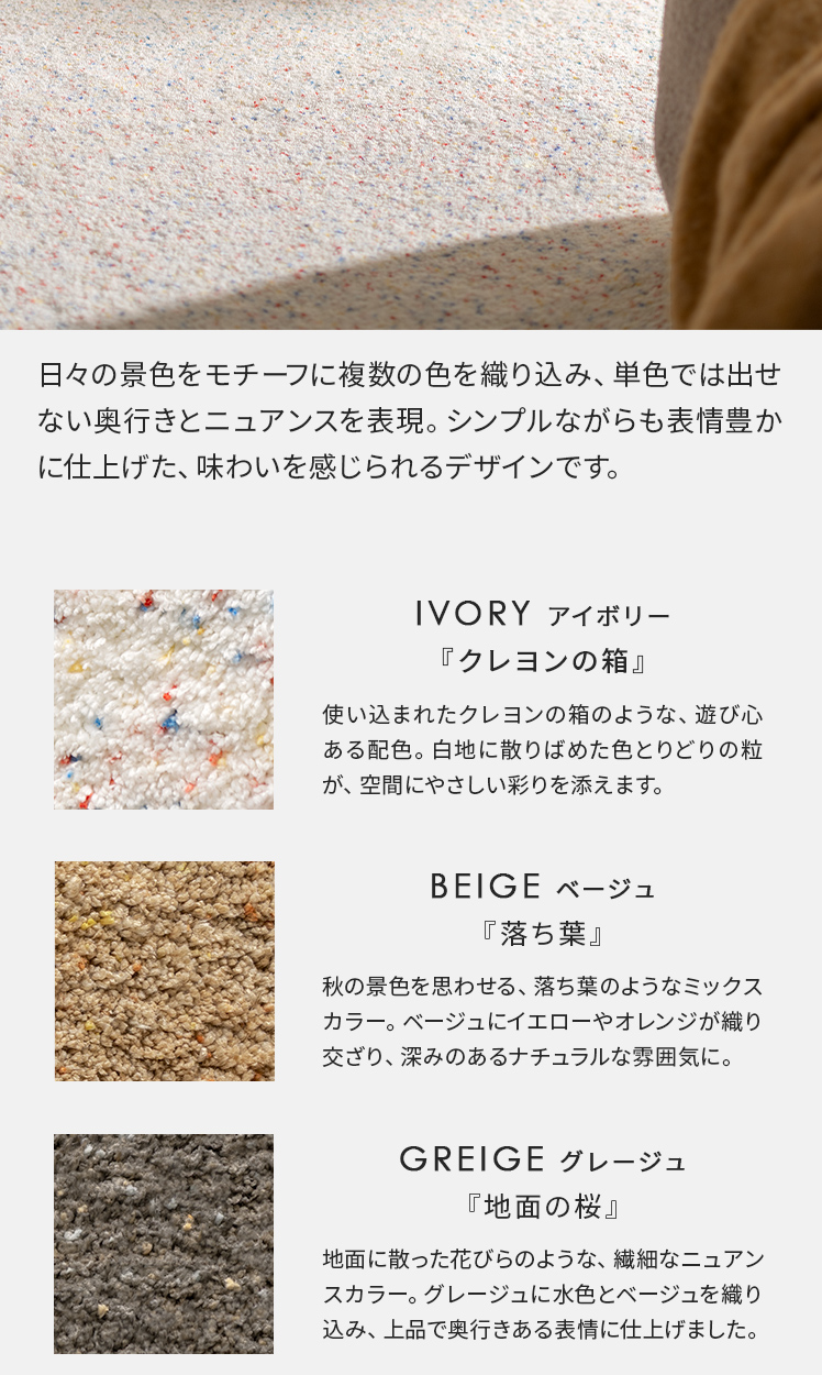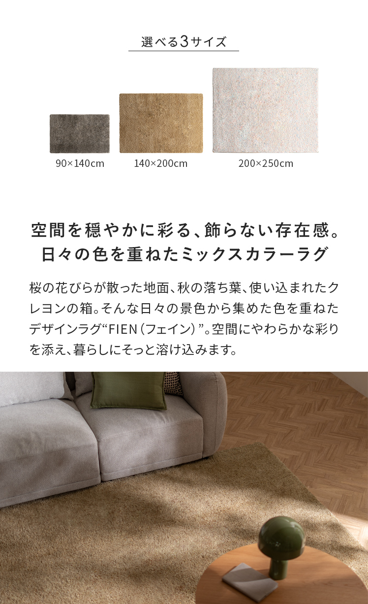 FIEN〔フィエン〕 ミックスラグ 200×250cm/桜の花びらが散った地面、秋の落ち葉、使い込まれたクレヨンの箱。そんな日々の景色から集めた色を重ねたデザインラグ“FIEN(フェイン)”。空間にやわらかな彩りを添え、暮らしにそっと溶け込みます。飾らないのに、どこか印象的にお部屋を彩ります。