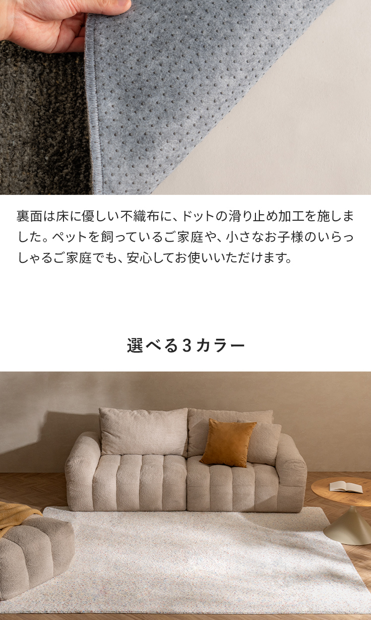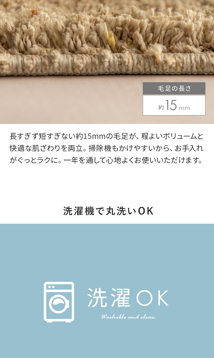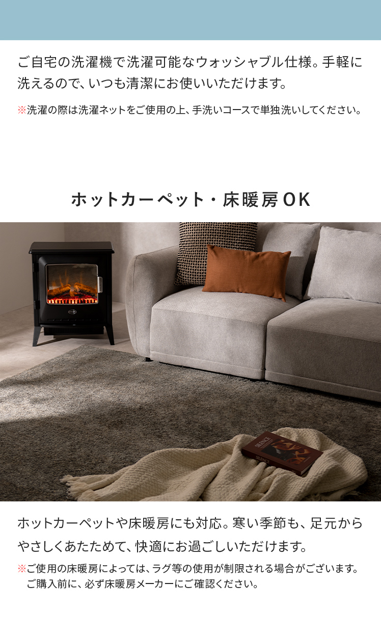 | 備考 | 手洗い可能、滑り止め加工付き ※ケバが付着致しますので、衣類等と一緒に洗わないで単独で洗濯して下さい。 ※洗濯の際はご家庭の洗濯機の容量をお確かめ下さい。 ※洗濯機を使用する際は、手洗いコースで洗濯してください。 床暖房の上で使用される際は、ご購入前に床暖房メーカーへご確認をお願いいたします。 |