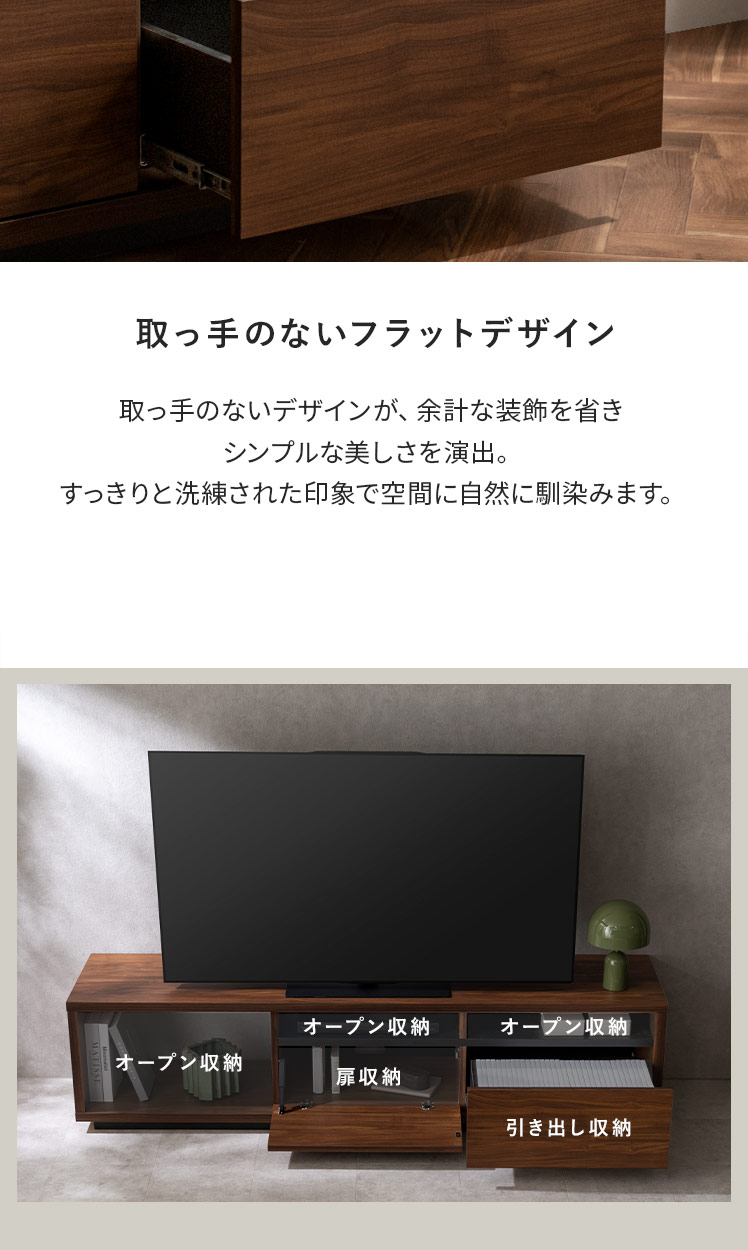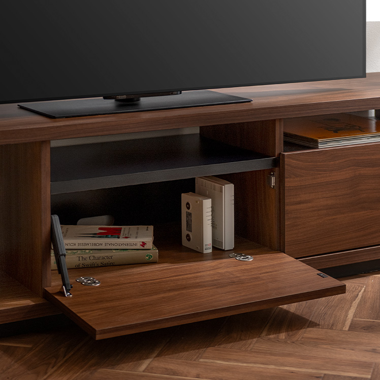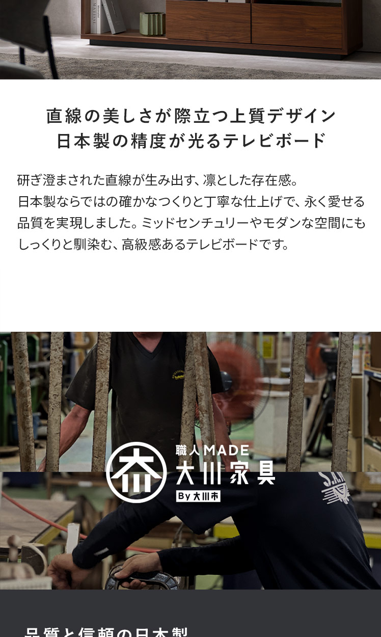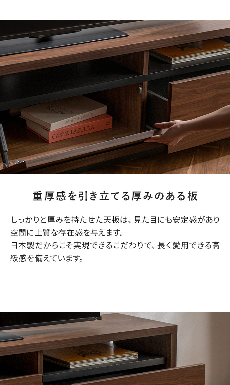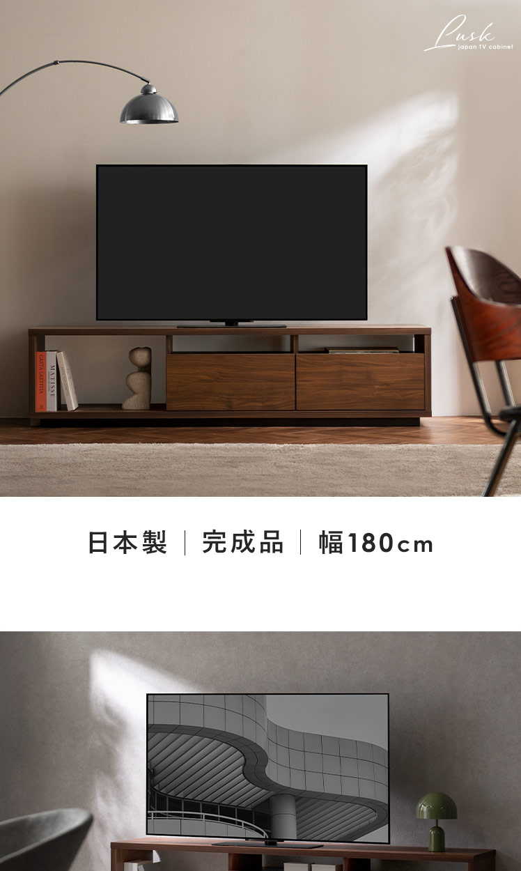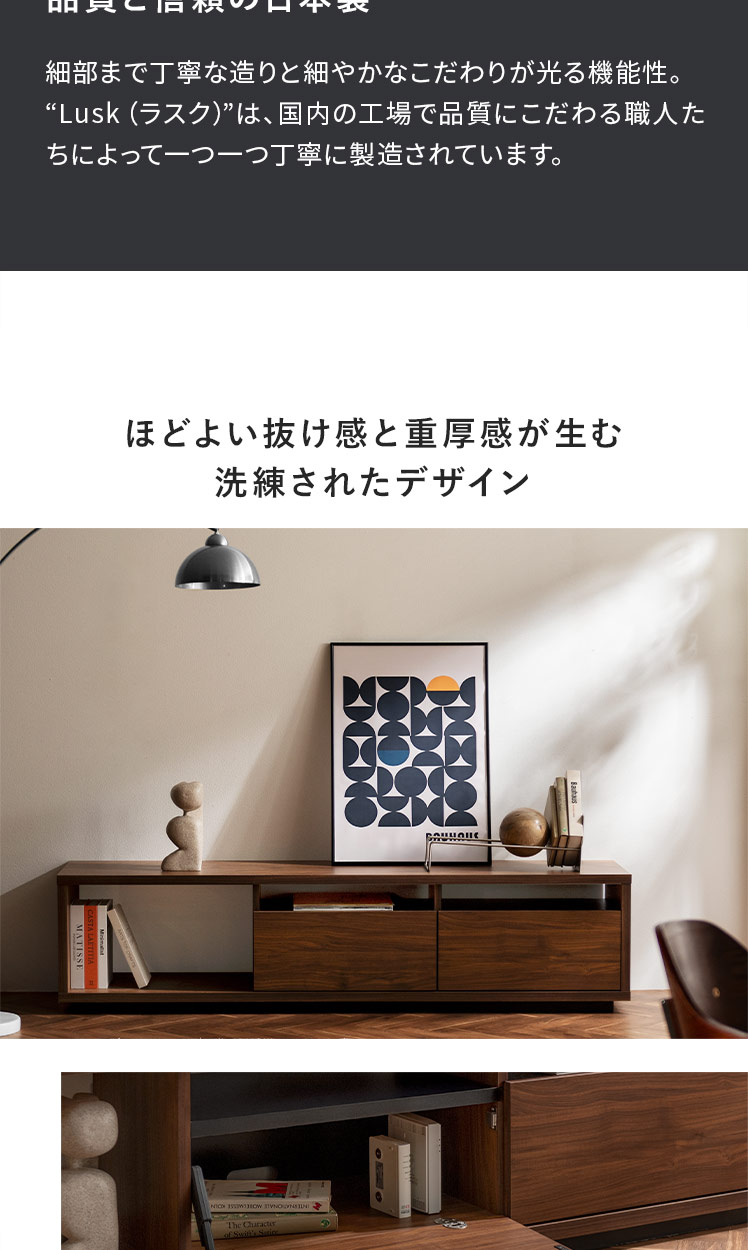 日本製テレビボードLusk〔ラスク〕/研ぎ澄まされた直線が生み出す、凛とした存在感。日本製ならではの確かなつくりと丁寧な仕上げで、永く愛せる品質を実現しました。ミッドセンチュリーやモダンな空間にもしっくりと馴染む、高級感あるテレビボードです。
