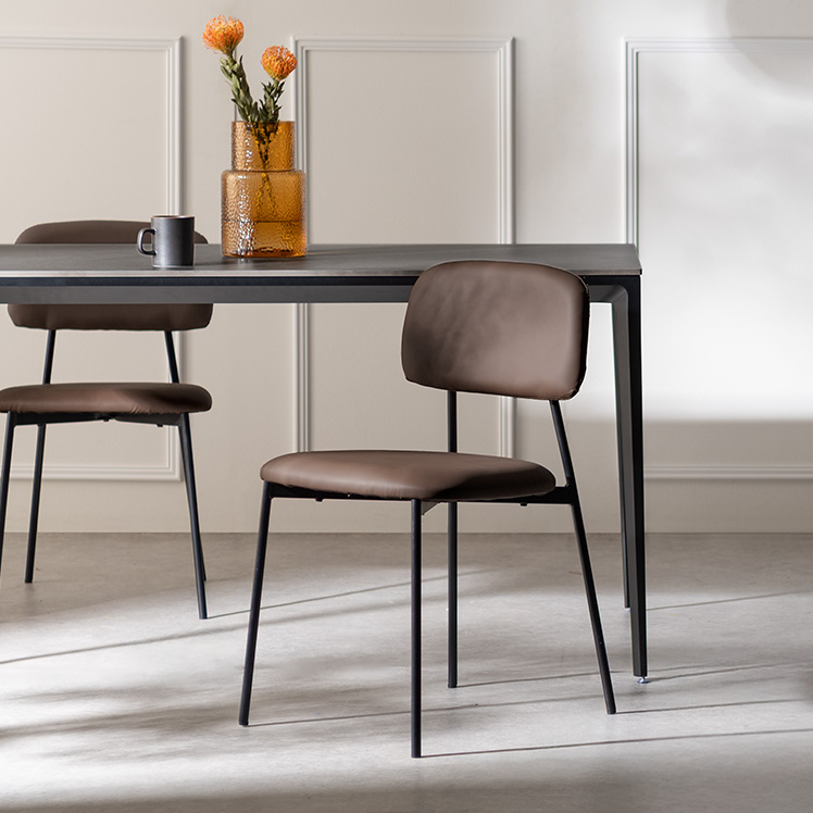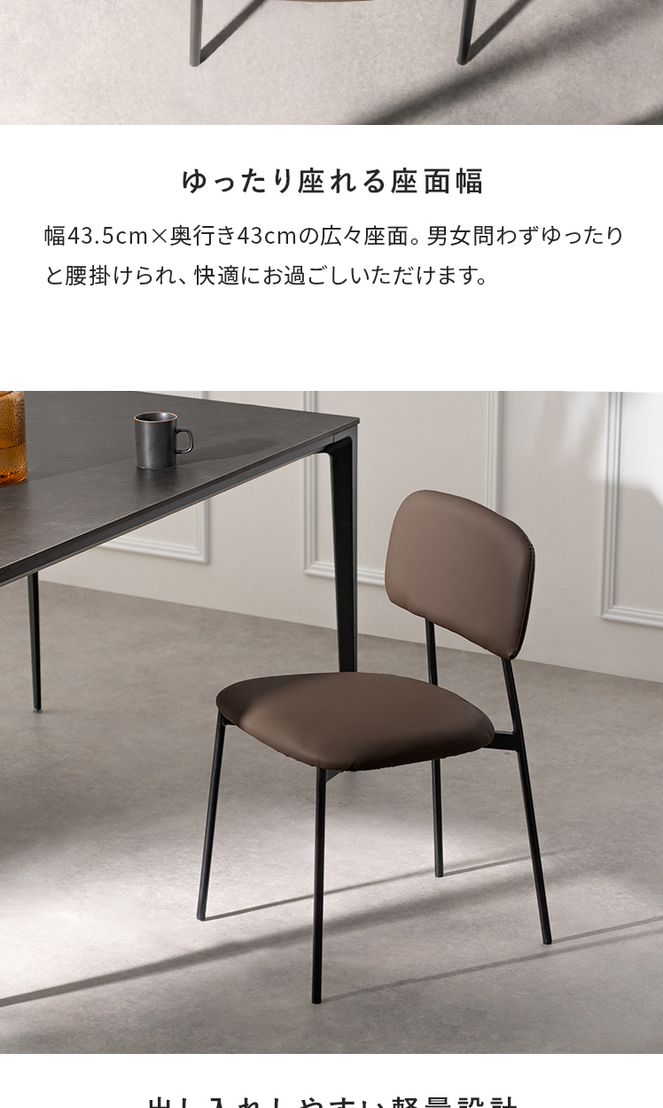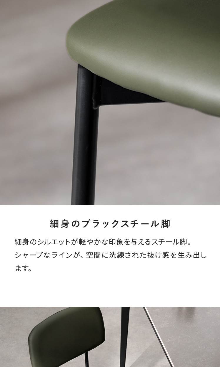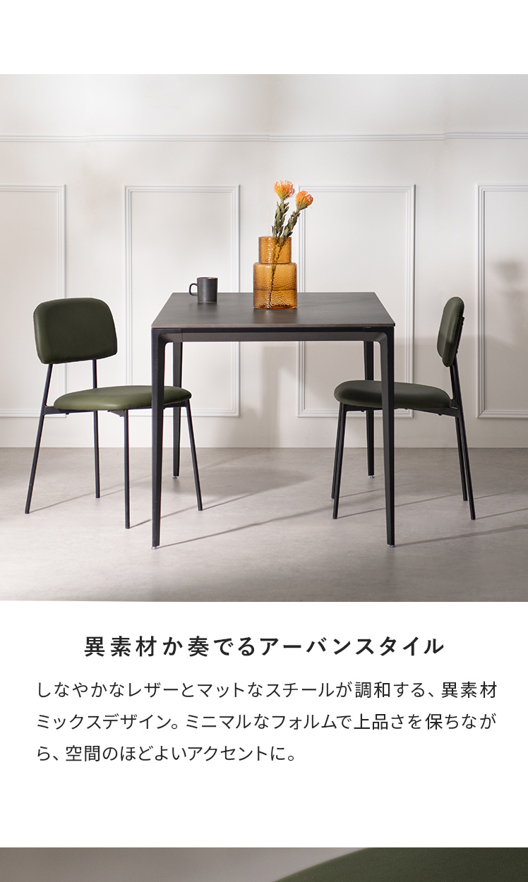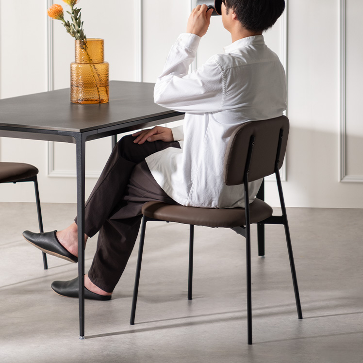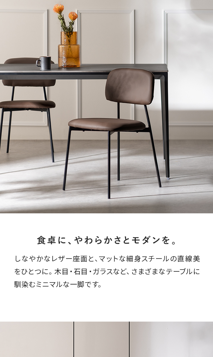ダイニングチェア KANT〔カント〕 2脚セット/しなやかなレザー座面と、マットな細身スチールの直線美をひとつに。木目・石目・ガラスなど、さまざまなテーブルに馴染むミニマルな一脚です。