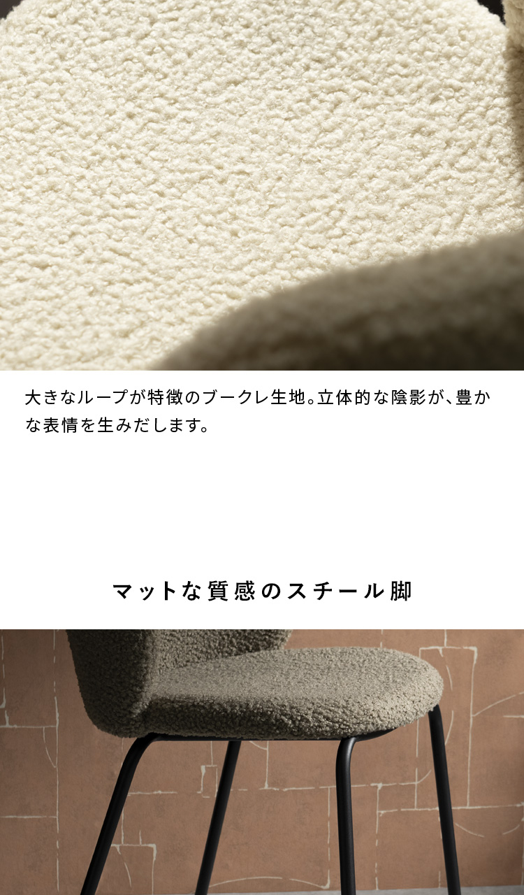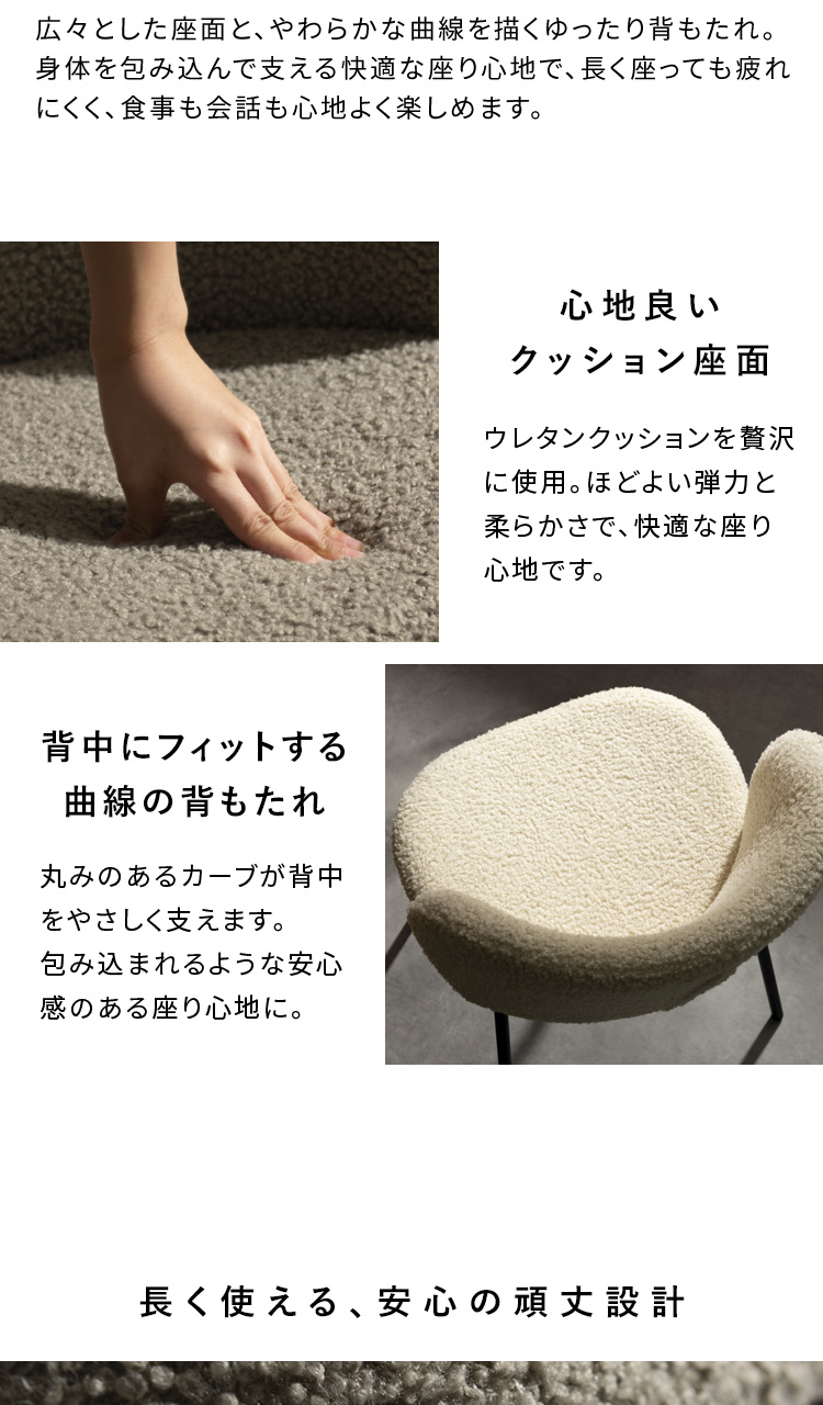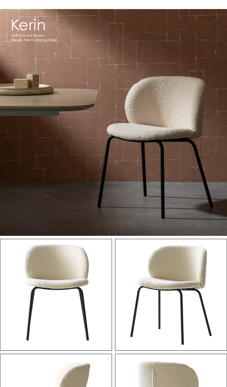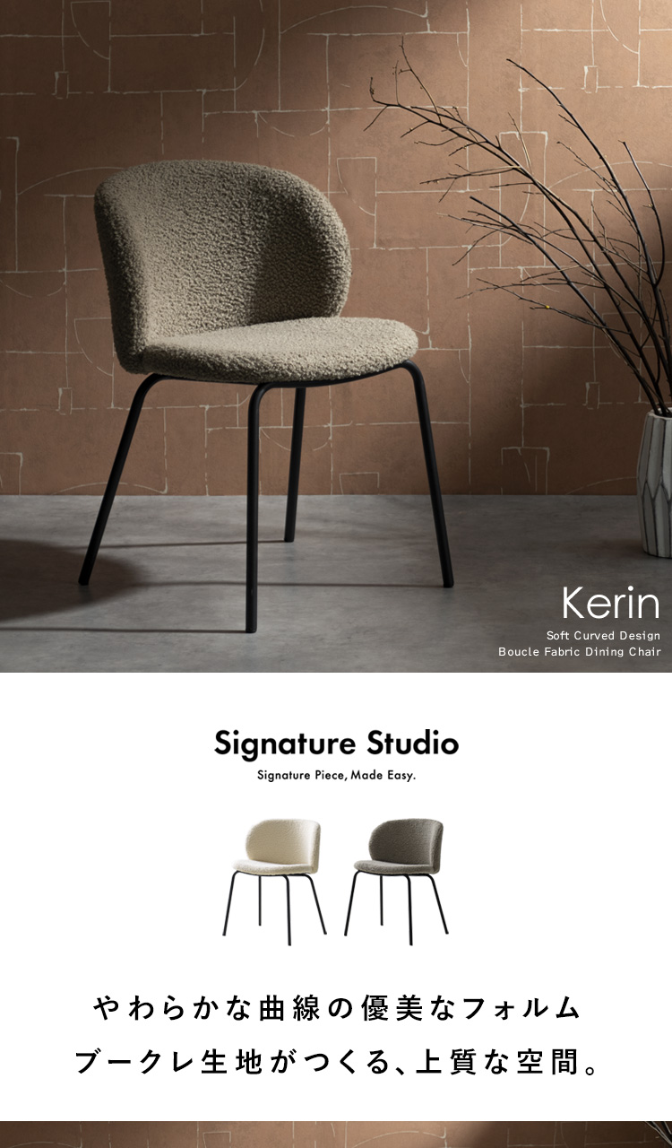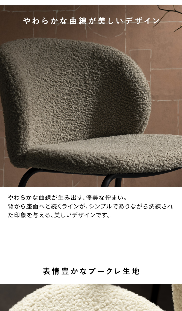 ダイニングチェア Kerin〔カリン〕2脚セット/やわらかな曲線が美しい、ダイニングチェア『Kerin(カリン)』。光の角度によって表情を変えるブークレ生地が、空間に上質な印象を与えます。身体を包み込む背もたれとゆったりとした座面が、長く座っても疲れにくい、快適な座り心地を実現。毎日の食卓を、より優雅で心地よいひとときへと導きます。