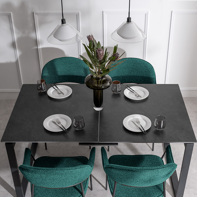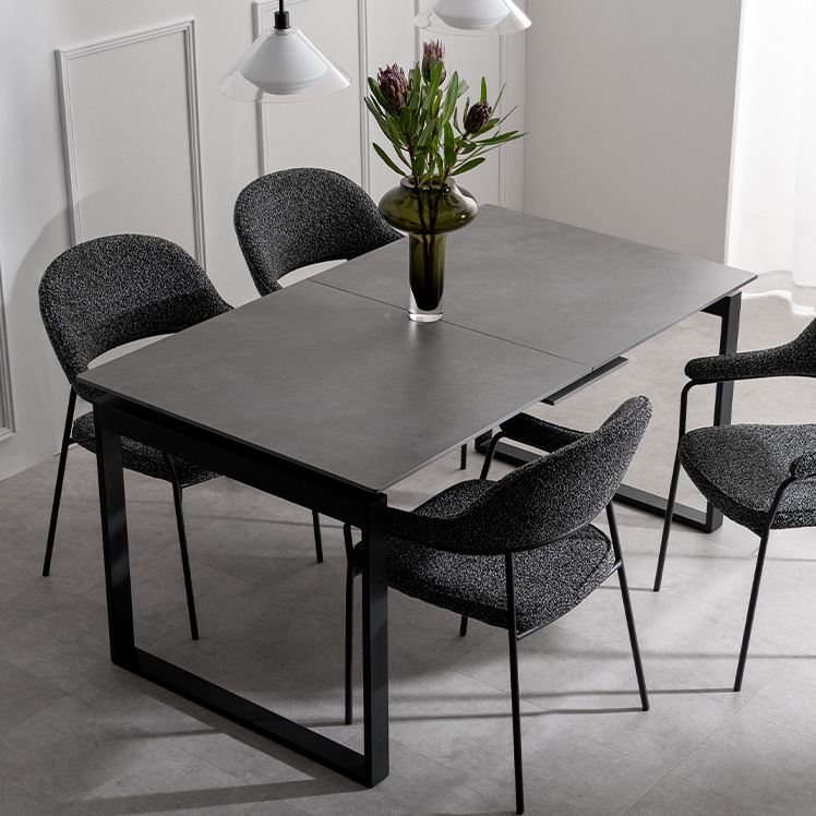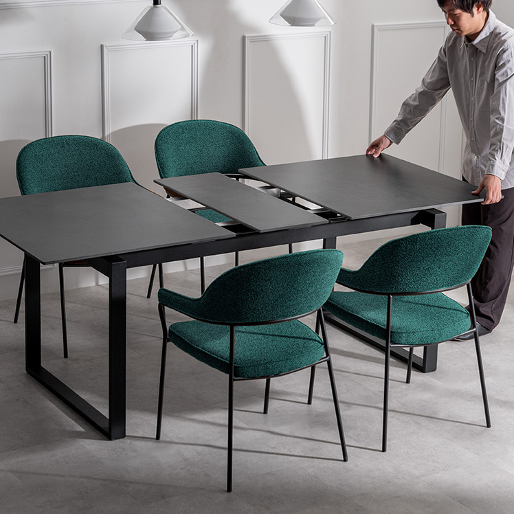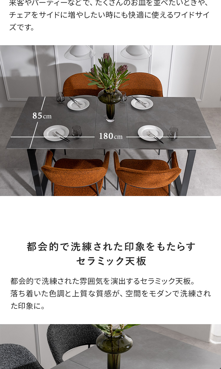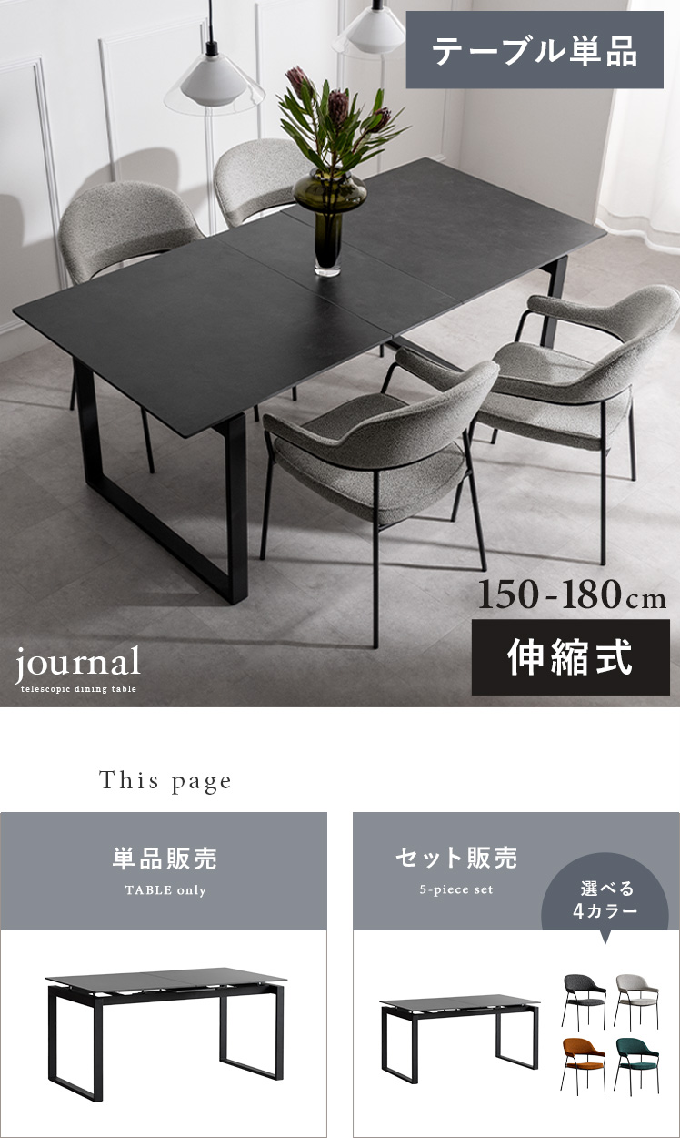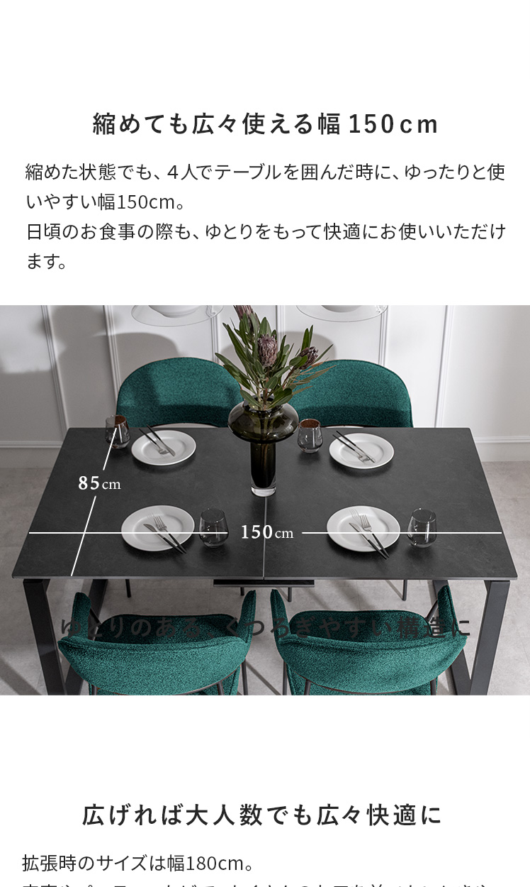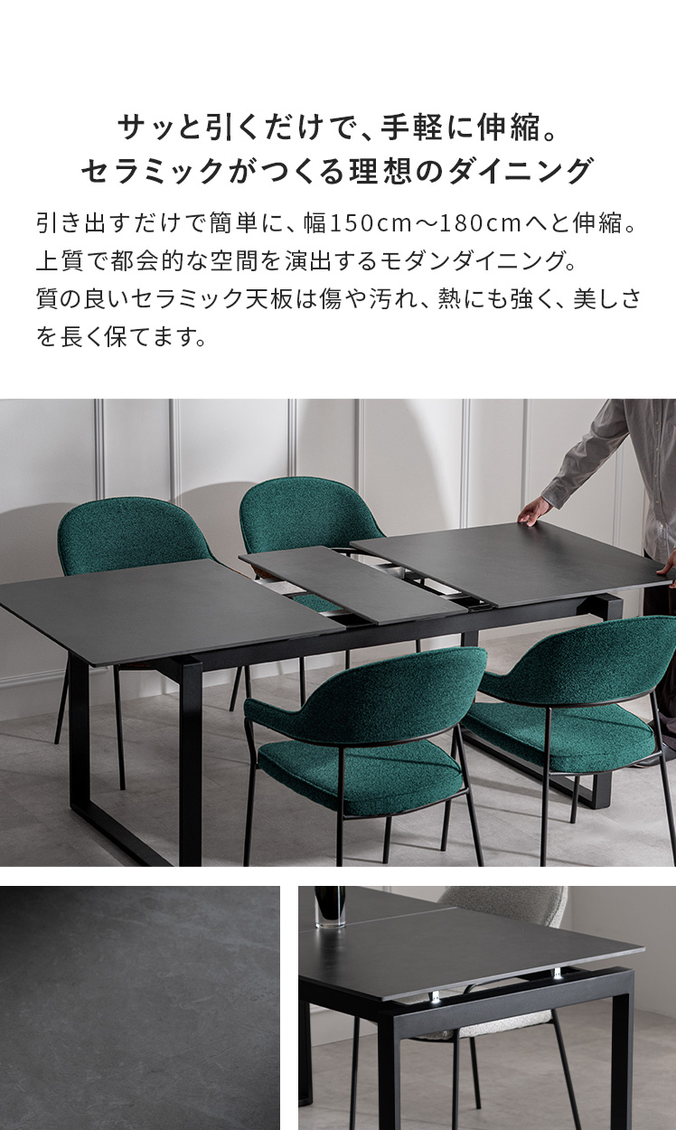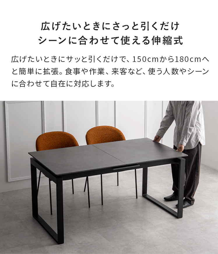 伸長式ダイニングテーブル journal〔ジャーナル〕/引き出すだけで簡単に、幅150cm〜180cmへと伸縮。上質で都会的な空間を演出するモダンダイニング。質の良いセラミック天板は傷や汚れ、熱にも強く、美しさを長く保てます。