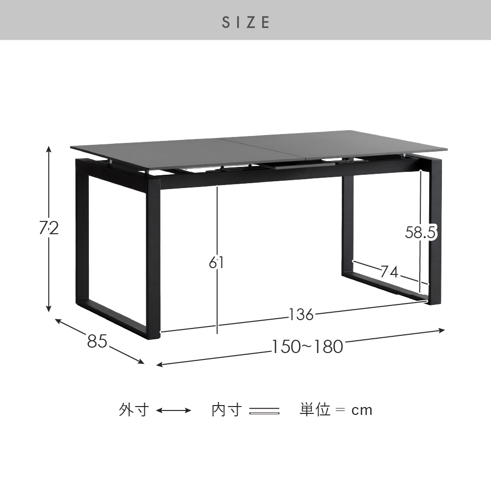 | サイズ | 約幅150/180×奥行き80×高さ72cm ※伸長時に幅201.5cmのスペースが必要です。  |