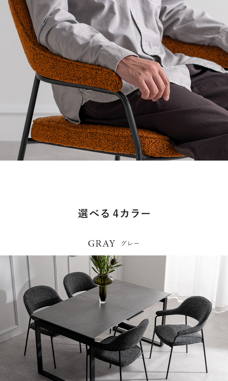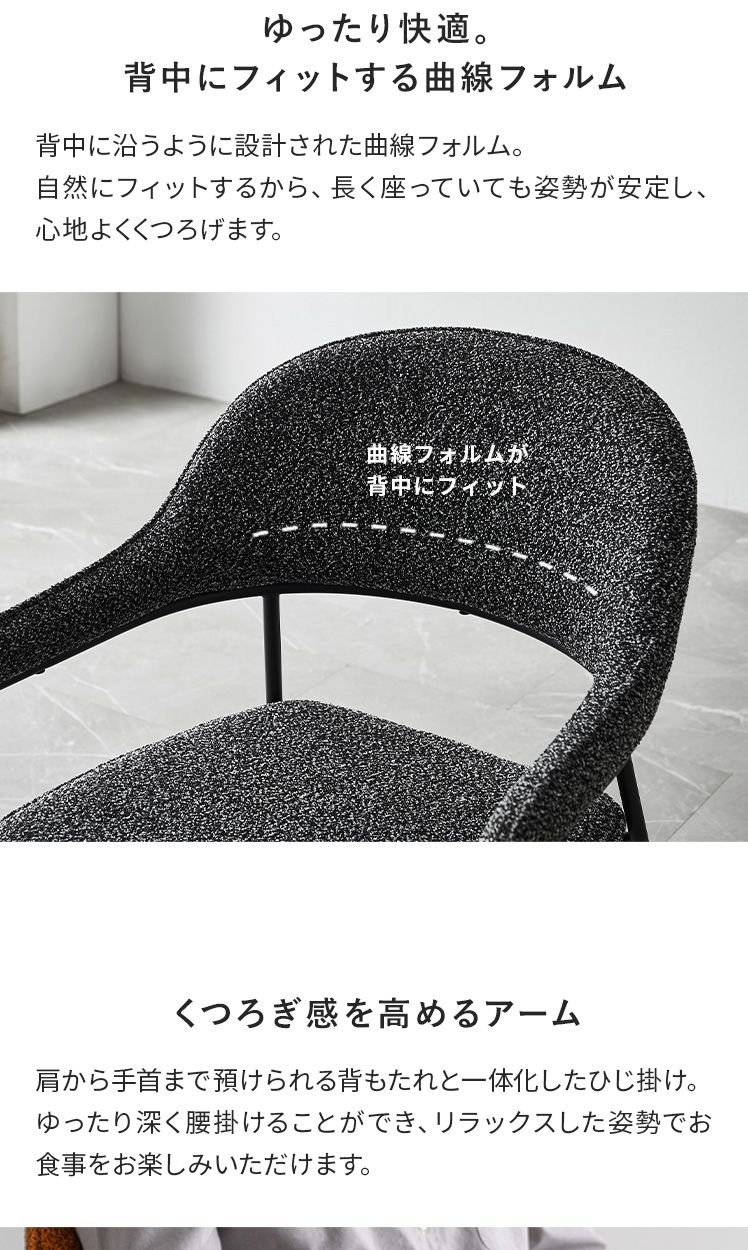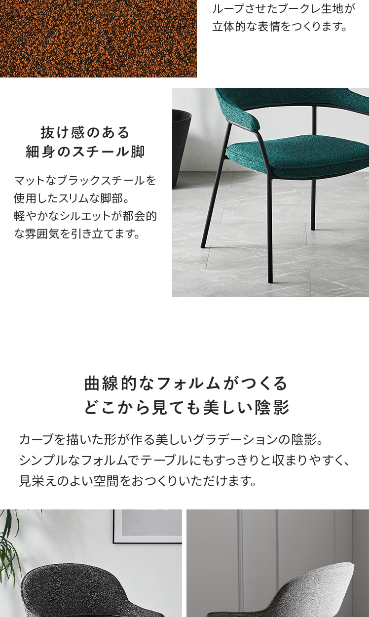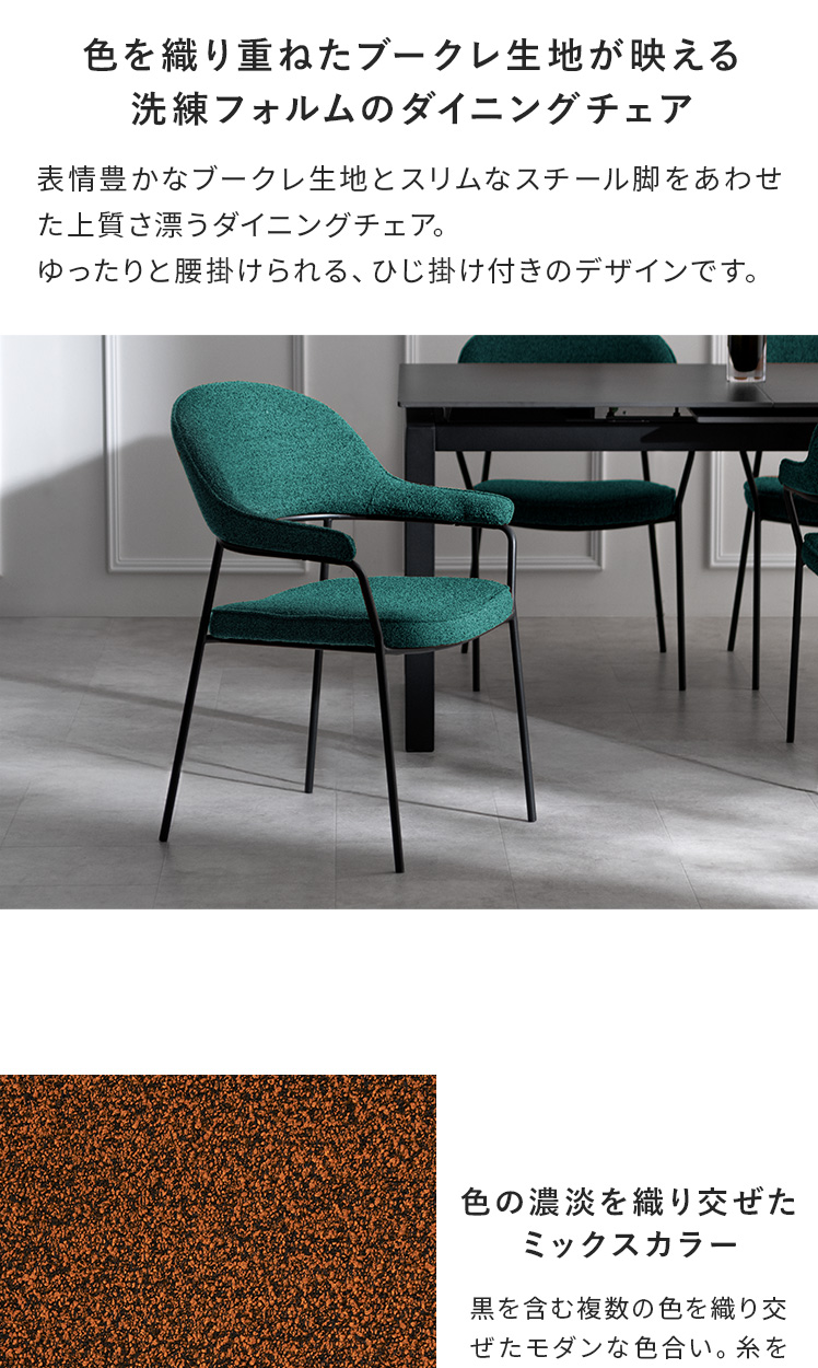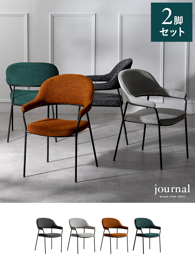ダイニングチェア journal〔ジャーナル〕2脚セット/表情豊かなブークレ生地とスリムなスチール脚をあわせた上質さ漂うダイニングチェア。ゆったりと腰掛けられる、ひじ掛け付きのデザインです。