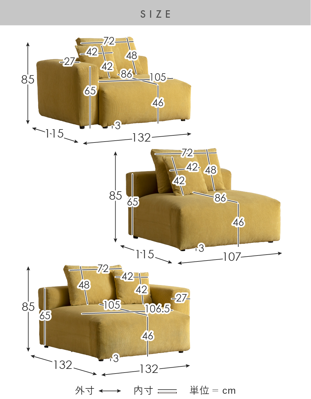 | サイズ | Rソファ/約幅132×奥行き115×高さ85cm 1Pソファ/約幅107×奥行き115×高さ85cm Lソファ/約幅132×奥行き132×高さ85cm |