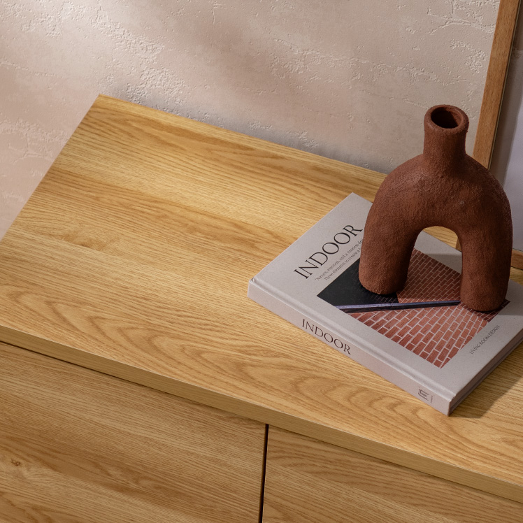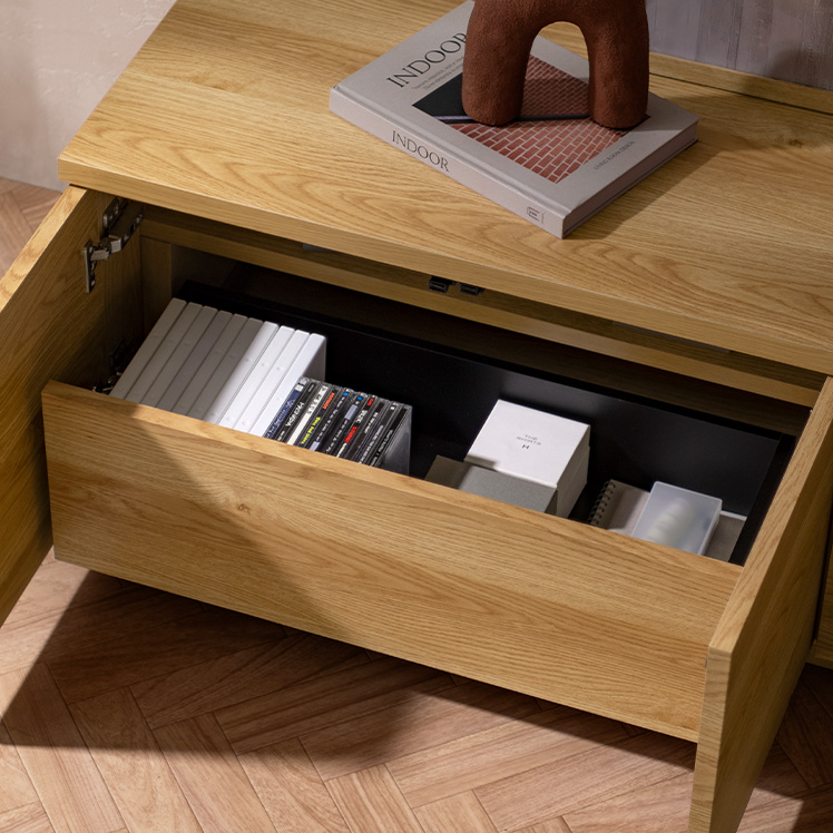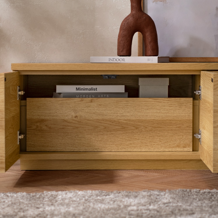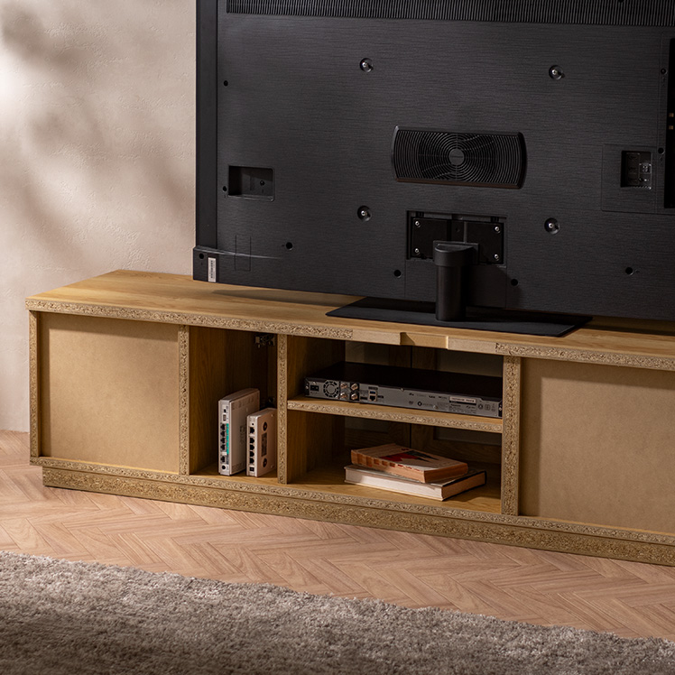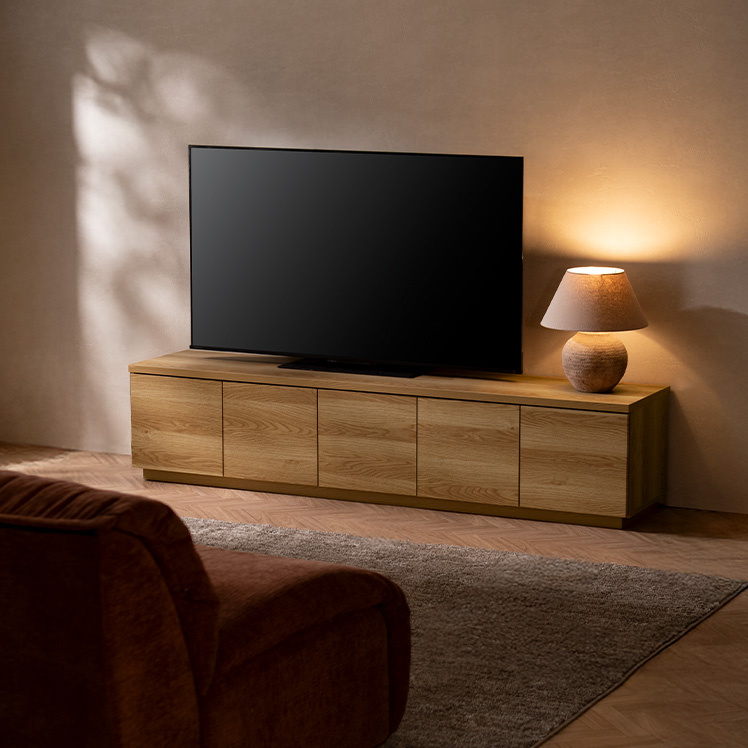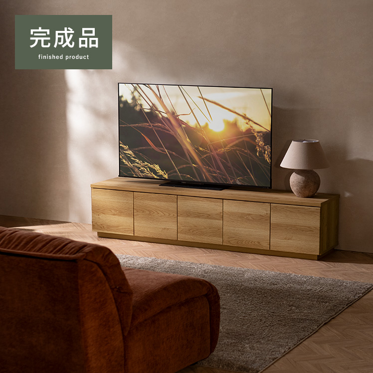 テレビボード YUNO〔ユノ〕/まるで無垢の木箱のような、凛とした重厚感。シンプルなフォルムに繊細な木目が引き立つテレビボード“YUNO(ユノ)”。扉で生活感を隠し、空間をすっきりと美しく整えます。