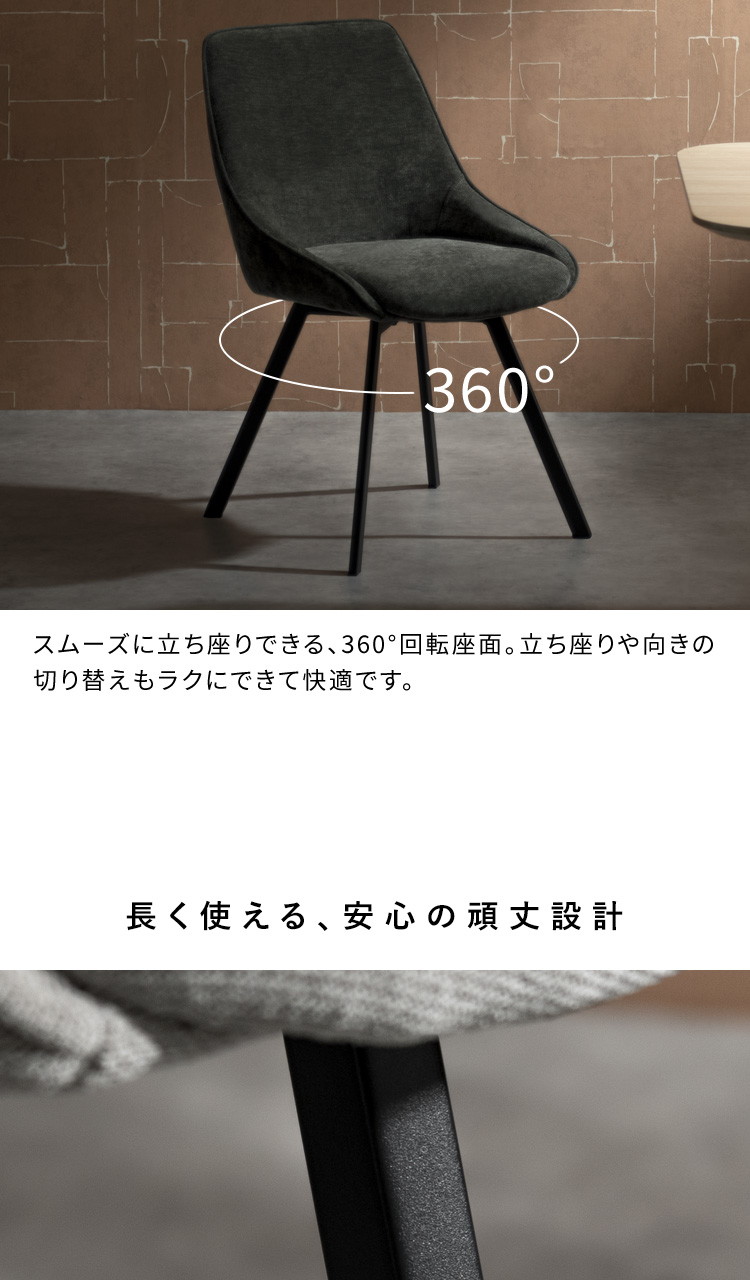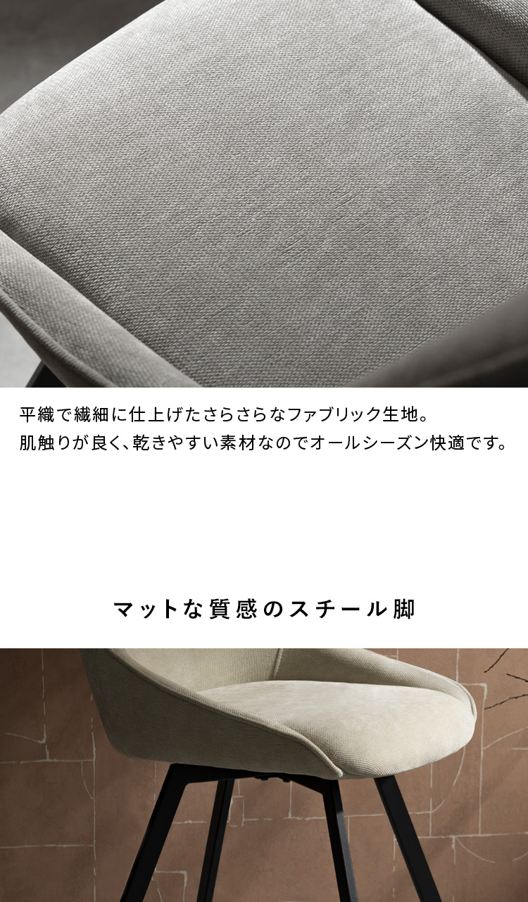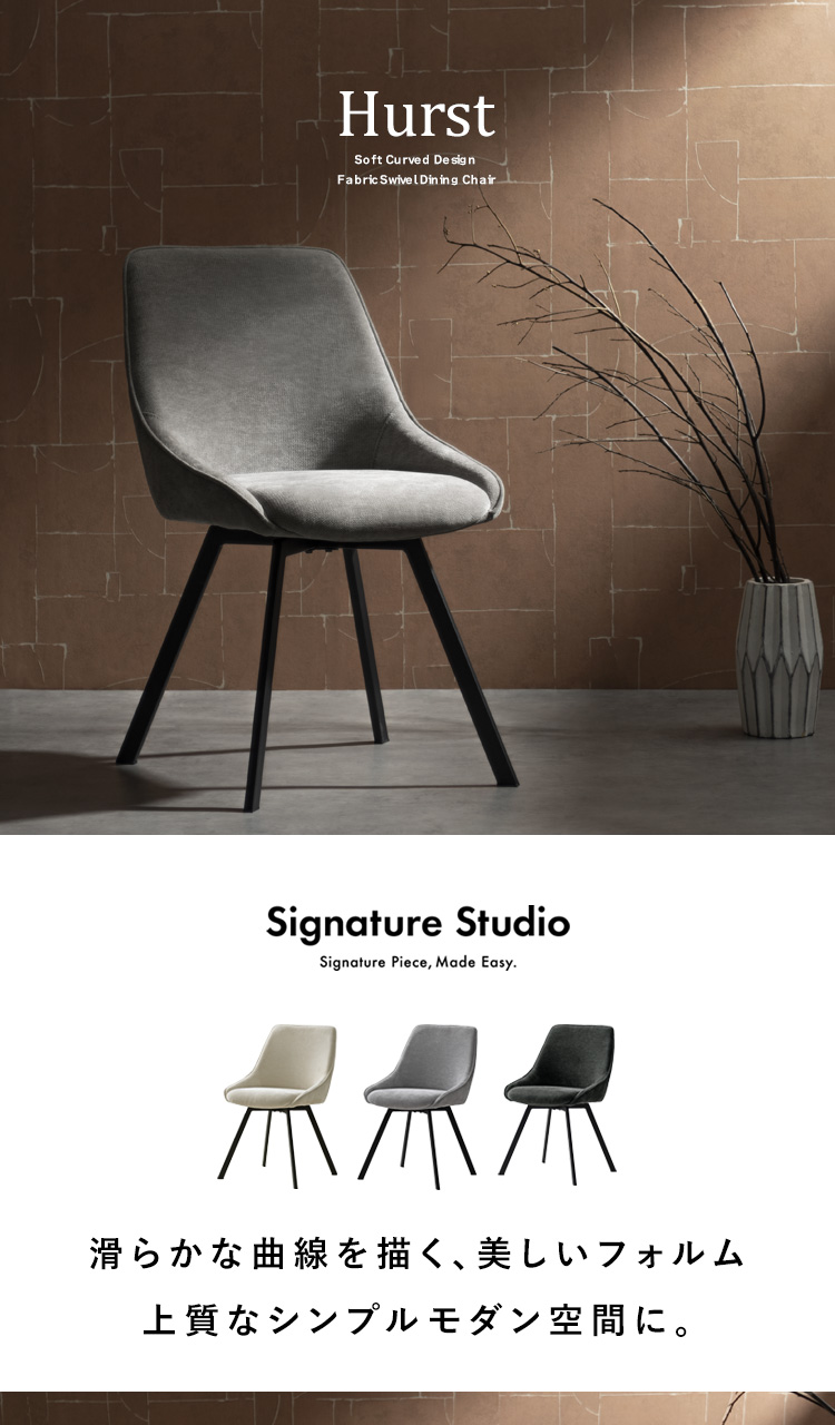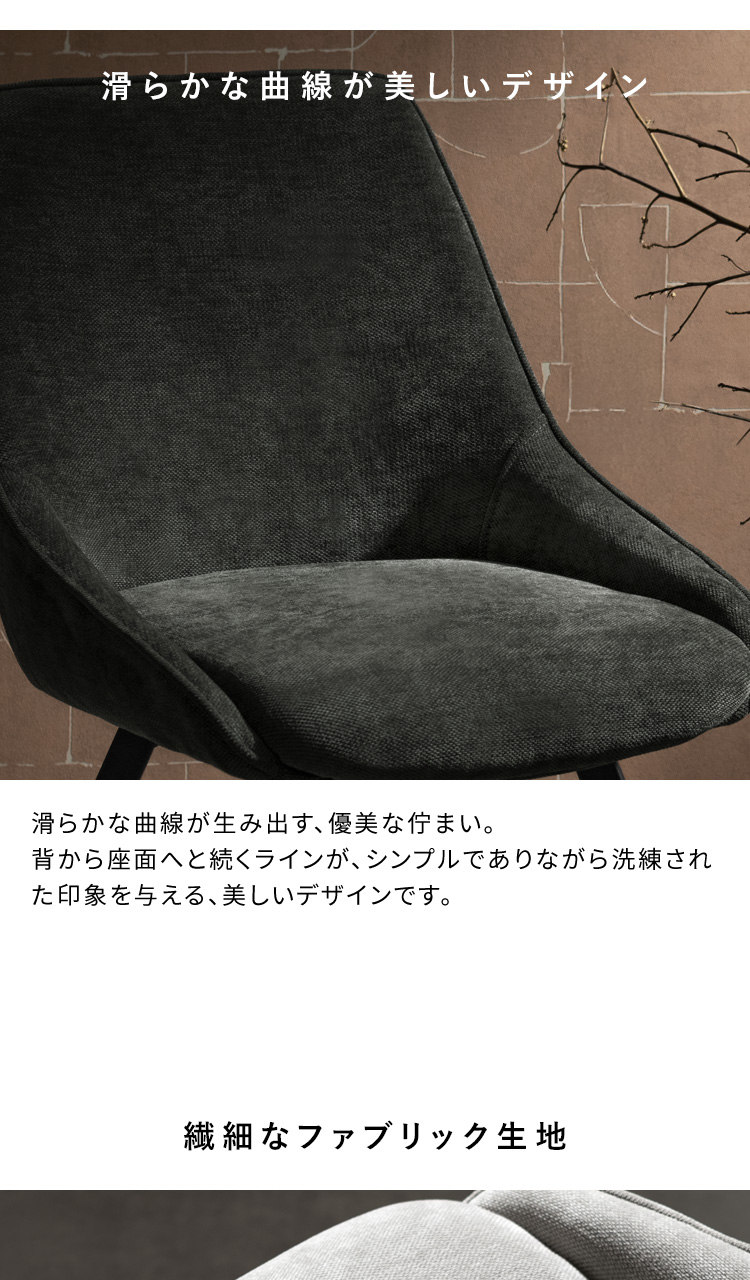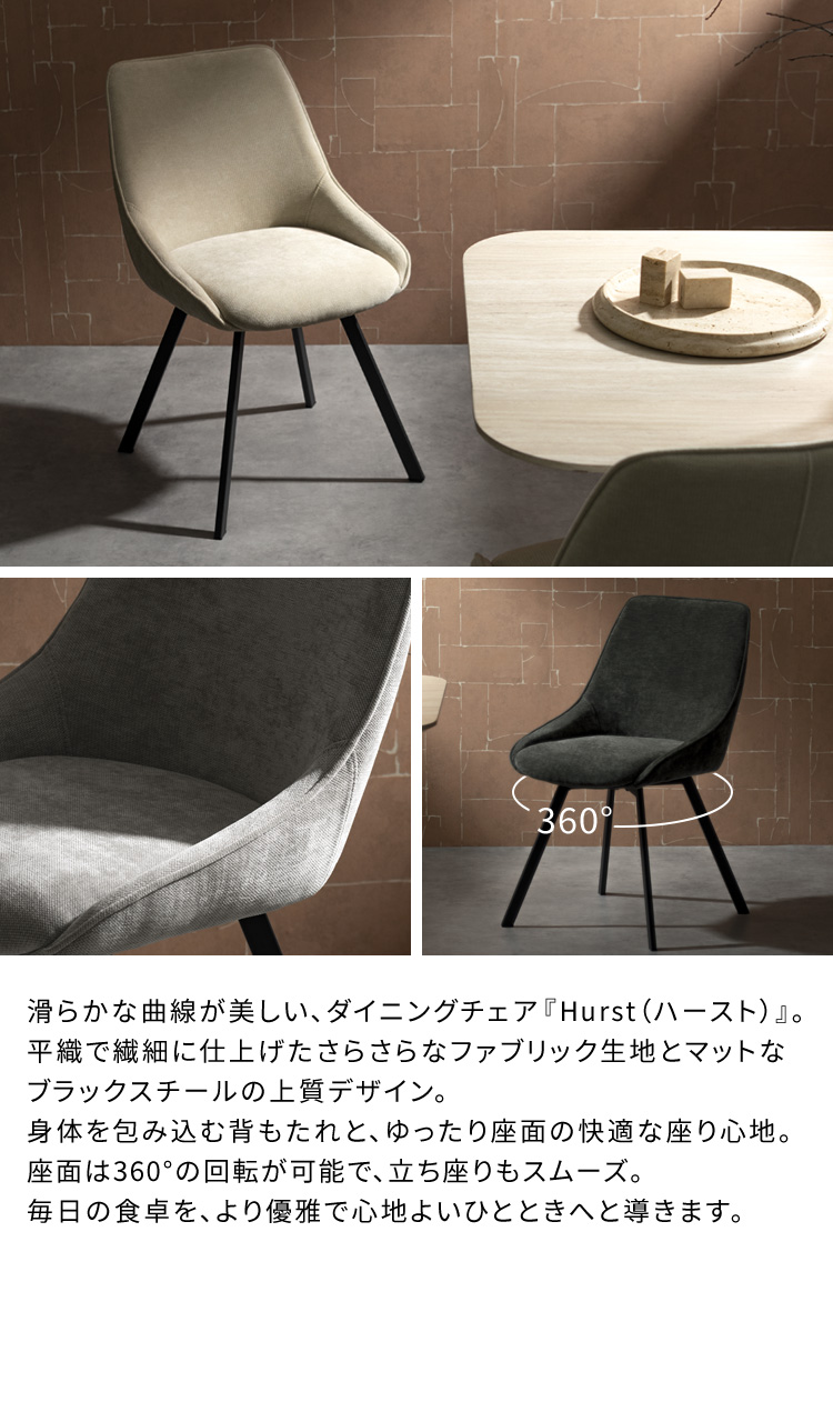回転ダイニングチェア Hurst〔ハースト〕2脚セット/滑らかな曲線が美しい、ダイニングチェア『Hurst(ハースト)』。平織で繊細に仕上げたさらさらなファブリック生地とマットなブラックスチールの上質デザイン。身体を包み込む背もたれと、ゆったり座面の快適な座り心地。座面は360°の回転が可能で、立ち座りもスムーズ。毎日の食卓を、より優雅で心地よいひとときへと導きます。