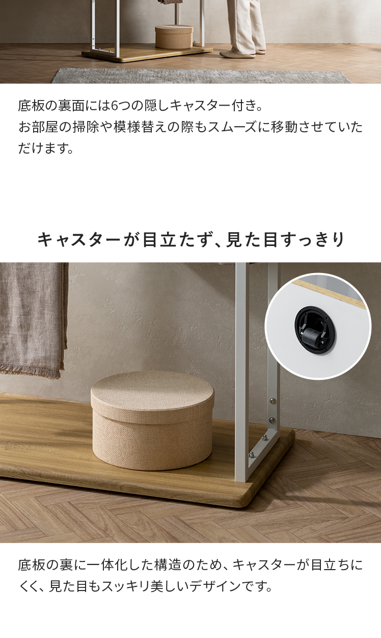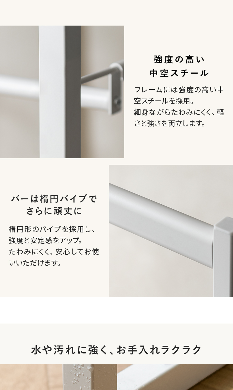 | 耐荷重 | 底板/約10kg、伸縮ハンガーバー/各約30kg、引っ掛けハンガーバー/約10kg |