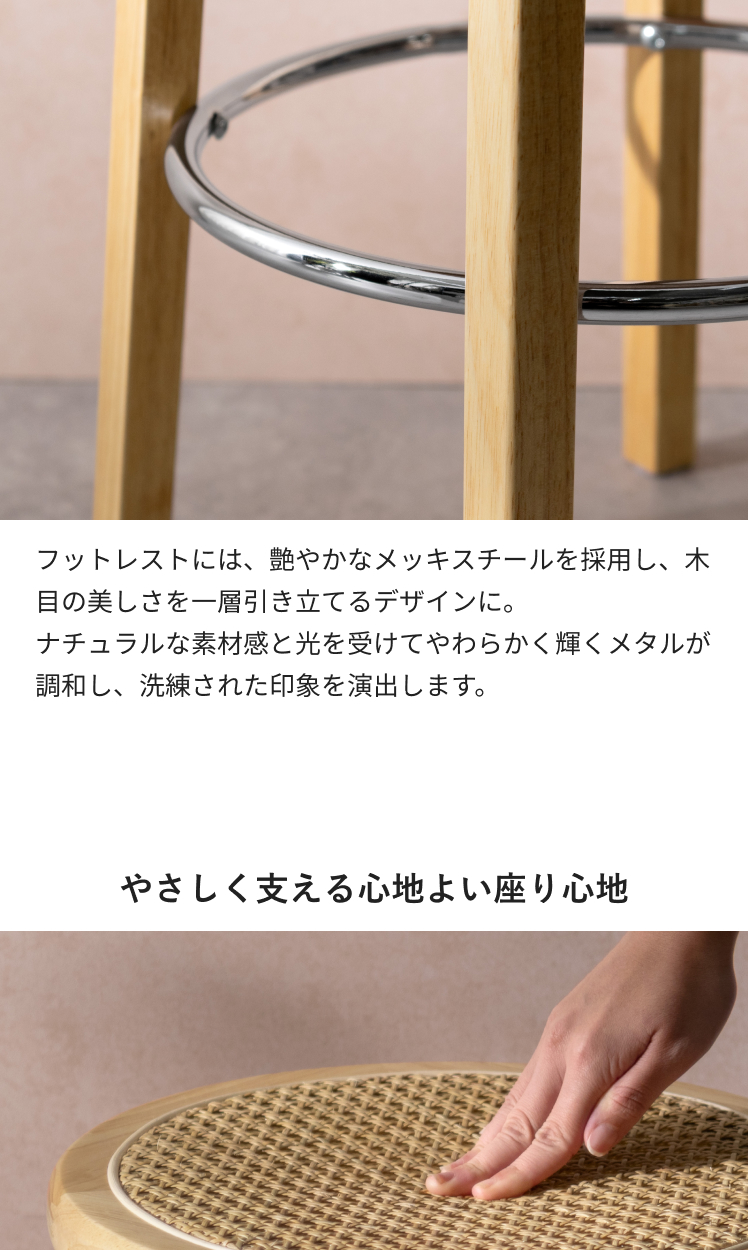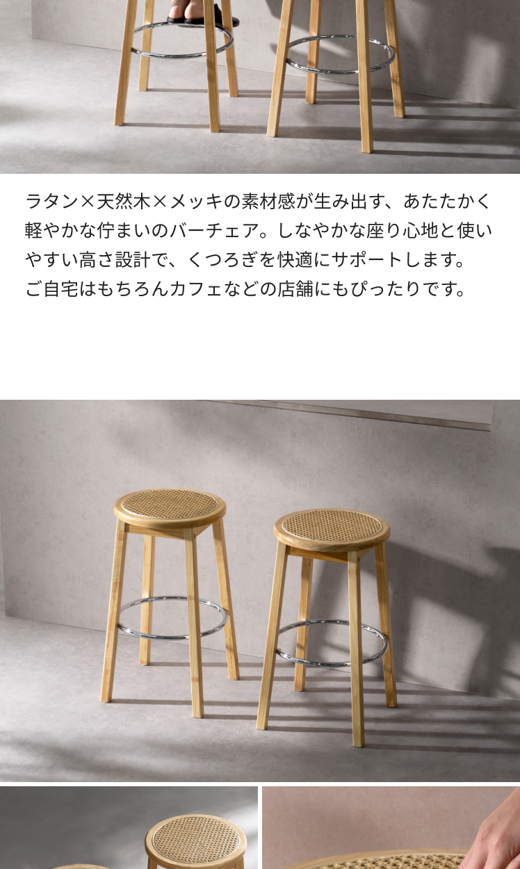 ラタンバーチェア Elmie〔エルミー〕1脚単体/ラタン×天然木×メッキの素材感が生み出す、あたたかく軽やかな佇まいのバーチェア。 しなやかな座り心地と使いやすい高さ設計で、くつろぎを快適にサポートします。ご自宅はもちろんカフェなどの店舗にもぴったりです。