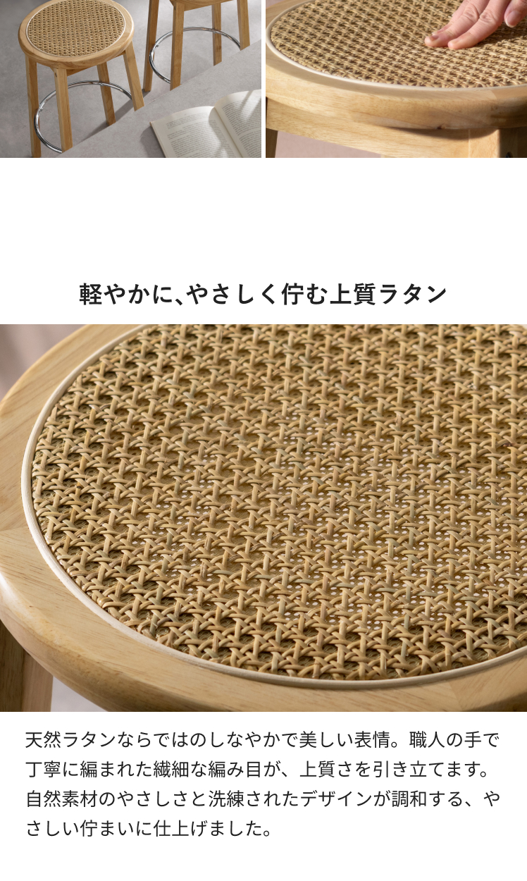| 材質 | 天然木(ラッカー塗装仕上げ)、ラタン、スチール(メッキ仕上げ) |