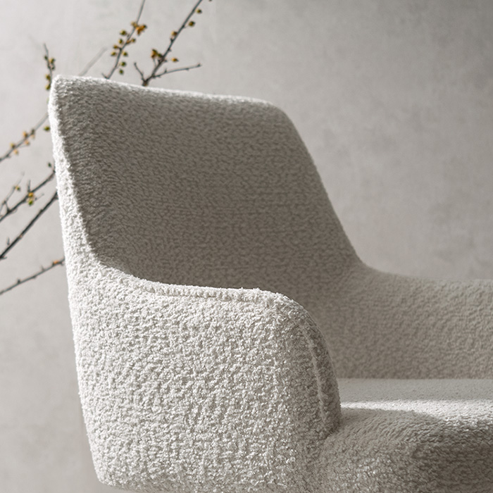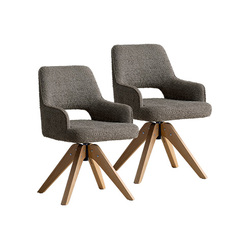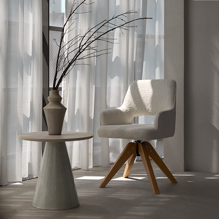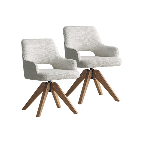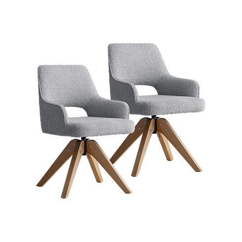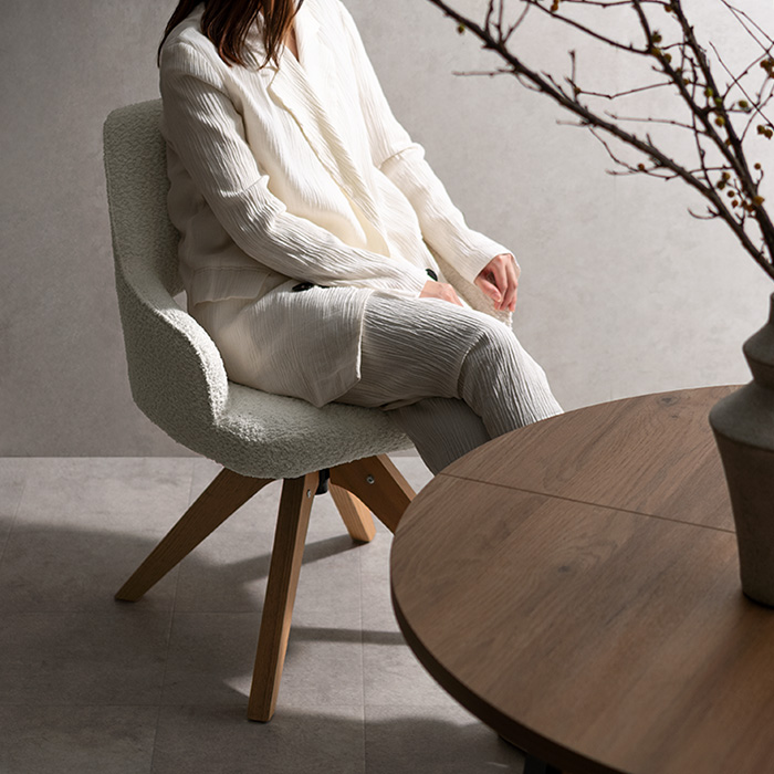 回転ダイニングチェア2脚入り Oria〔オリア〕2脚セット/曲線と直線のバランスが美しい、ダイニングチェア『Oria(オリア)』。光の角度によって表情を変えるブークレ生地と天然木オーク材が、空間に上質な印象を与えます。身体に沿った背もたれと、ゆったり座面の快適な座り心地。座面は360°の回転が可能で、立ち座りもスムーズ。毎日の食卓を、より優雅で心地よいひとときへと導きます。