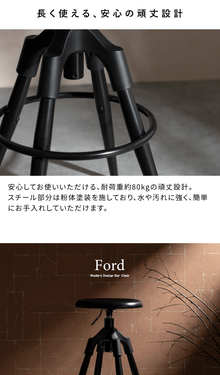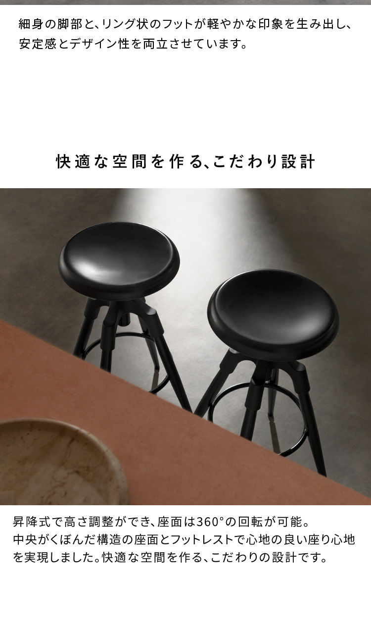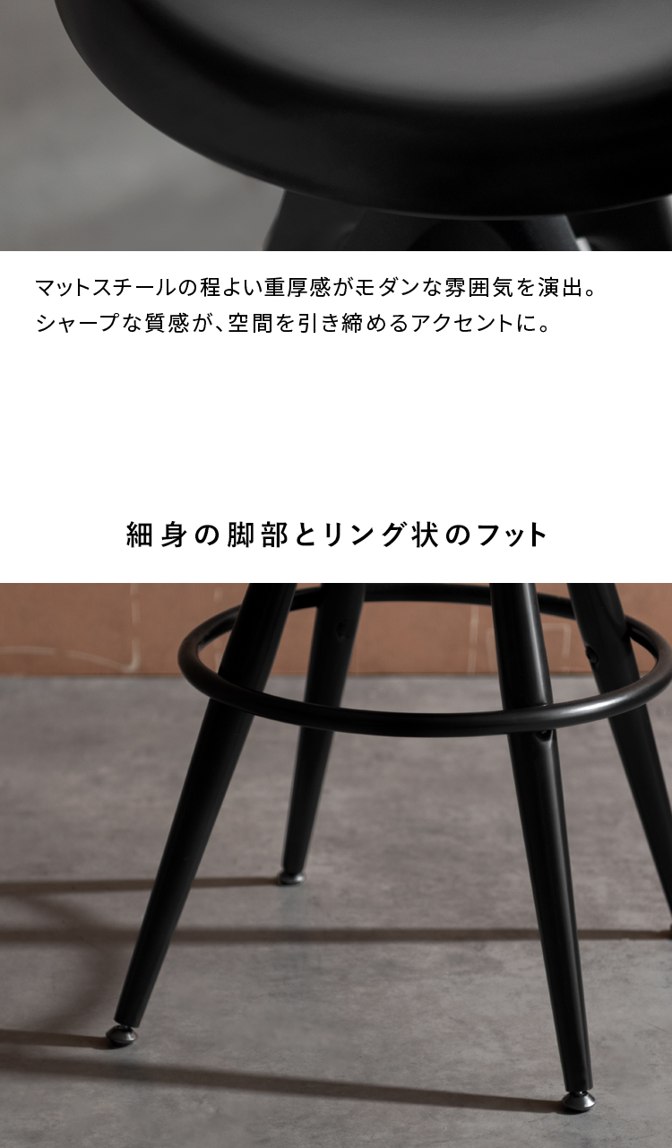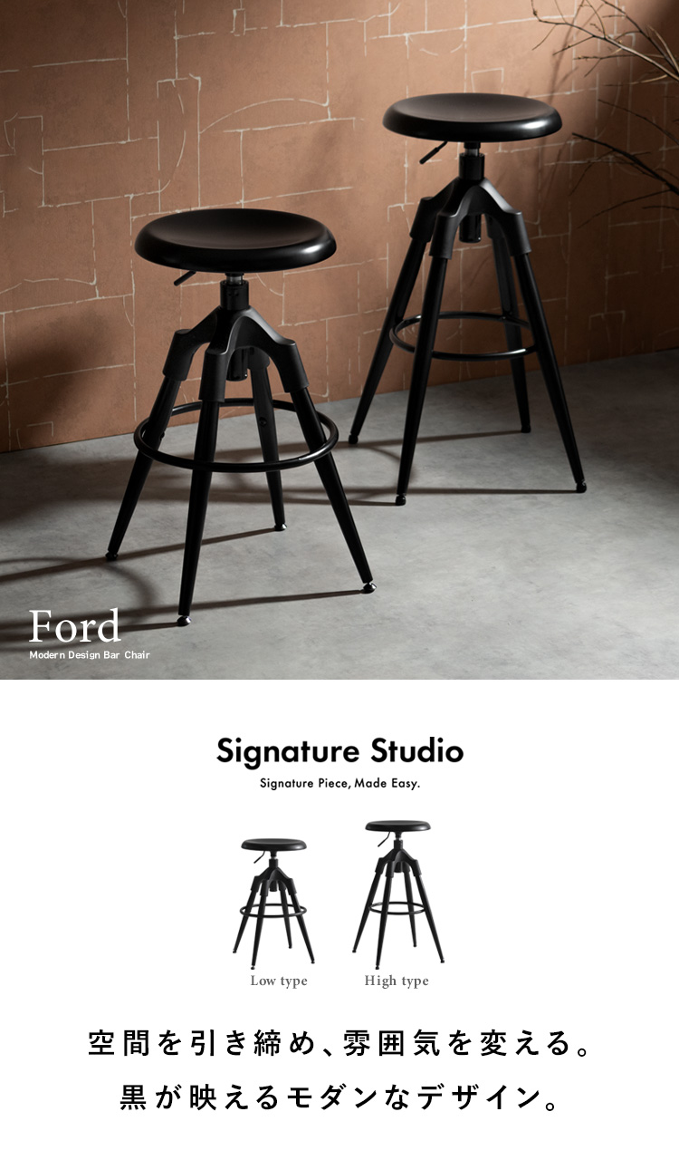 バーチェア Ford〔フォード〕ロータイプ/ブラックスチールが映える、昇降式バーチェア『Ford(フォード)』。インダストリアルな空気感を纏いながら、細身のスチールと繊細なディテールが織りなす、端正で洗練された佇まいです。また、中央がくぼんだ座りやすい座面と、360°回転・昇降機能。デザイン性だけでなく、快適な使い心地にもこだわった設計です。