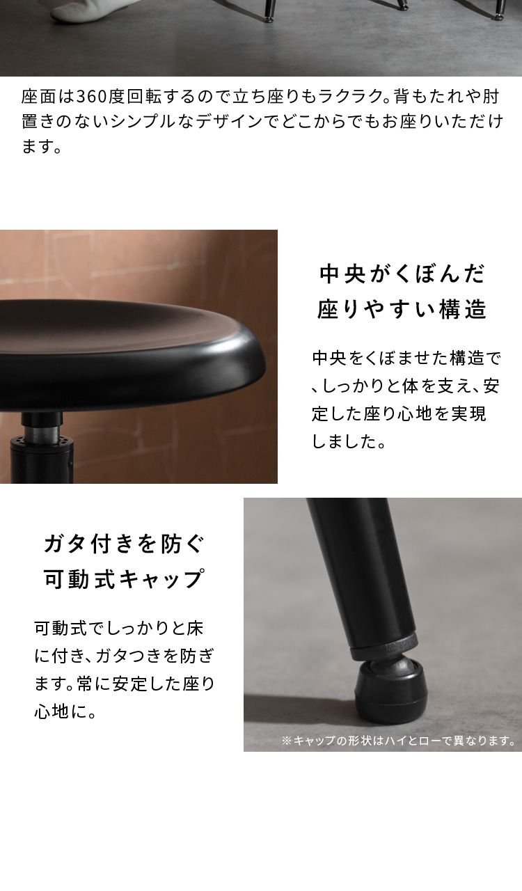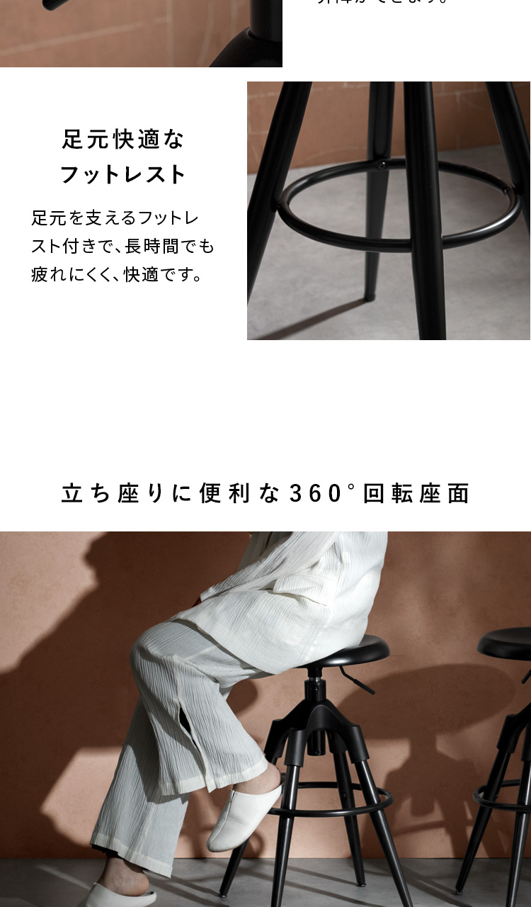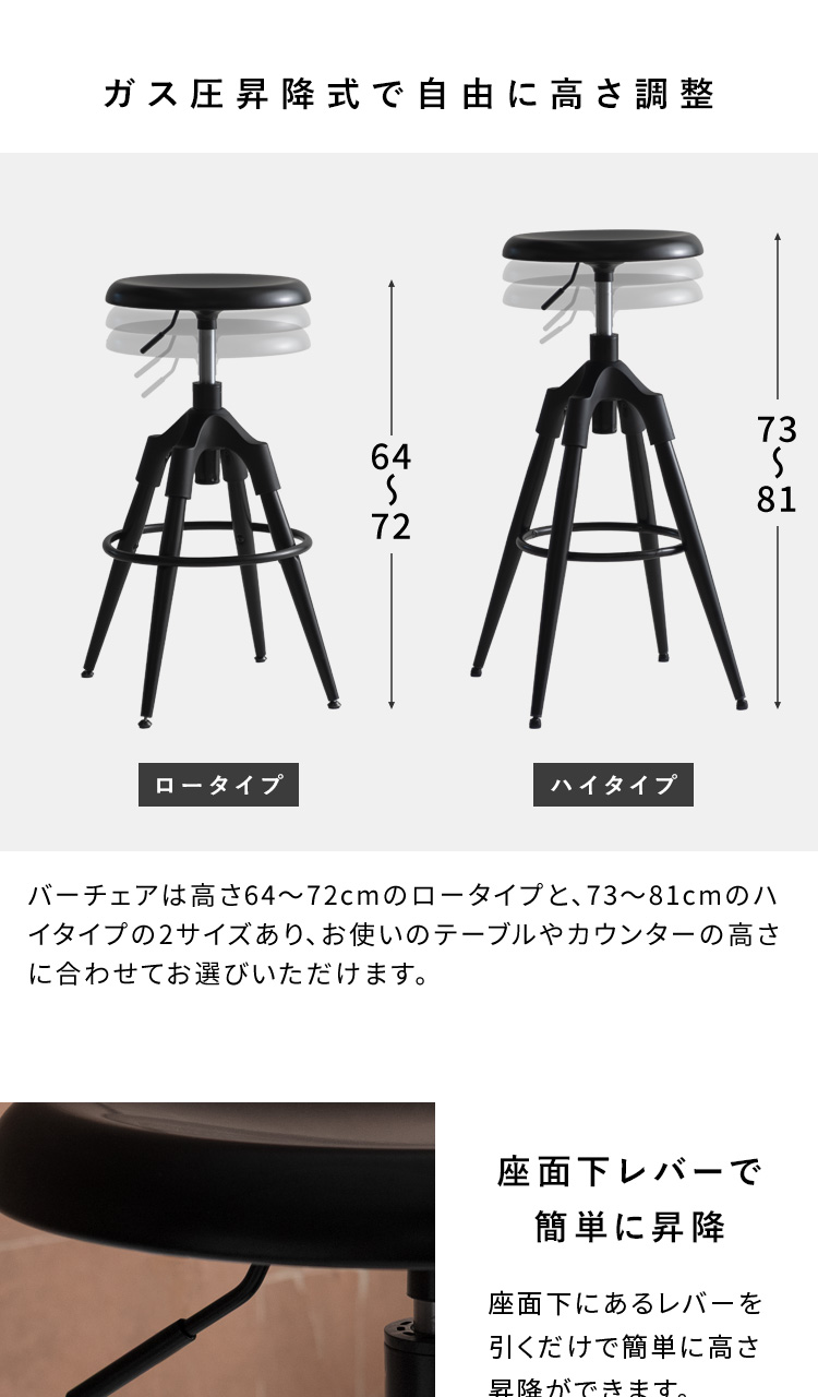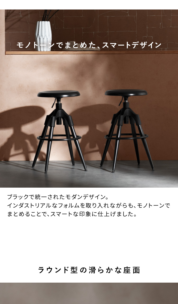 バーチェア Ford〔フォード〕ロータイプ/ブラックスチールが映える、昇降式バーチェア『Ford(フォード)』。インダストリアルな空気感を纏いながら、細身のスチールと繊細なディテールが織りなす、端正で洗練された佇まいです。また、中央がくぼんだ座りやすい座面と、360°回転・昇降機能。デザイン性だけでなく、快適な使い心地にもこだわった設計です。