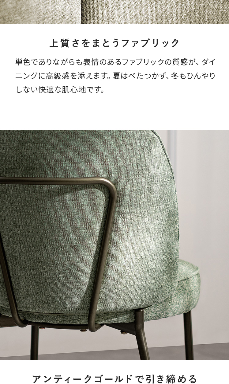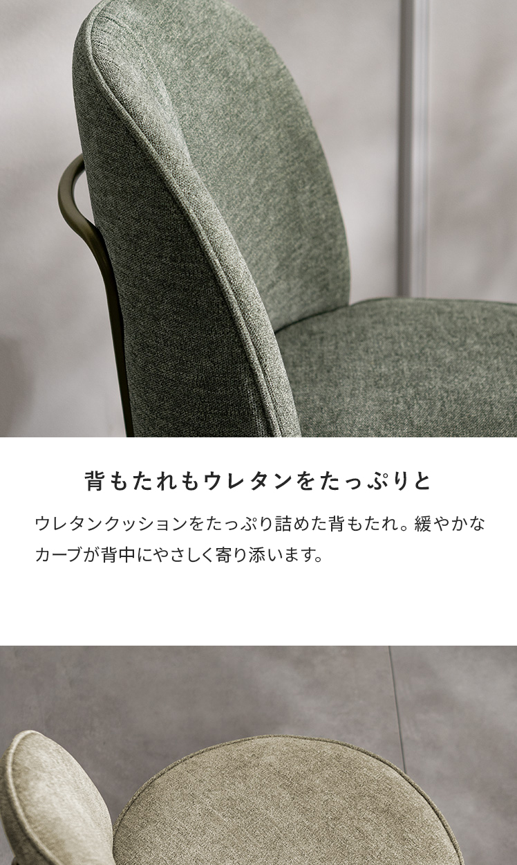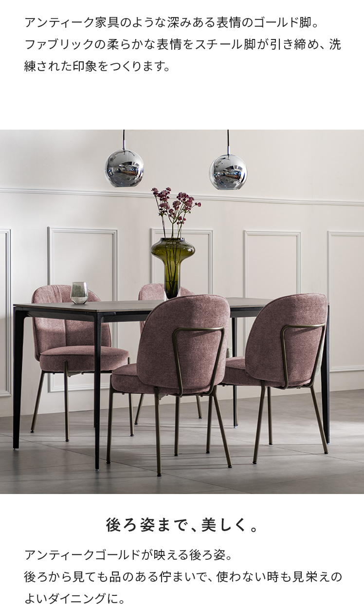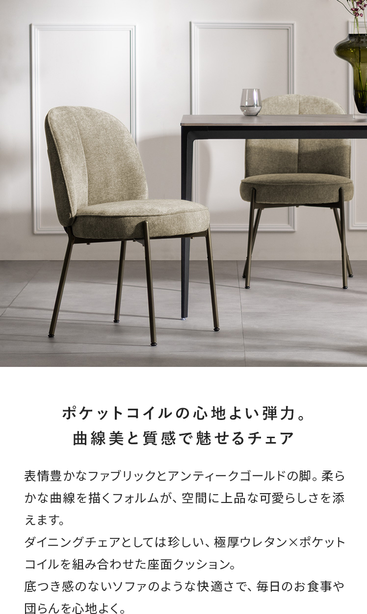 ダイニングチェア mio〔ミオ〕/表情豊かなファブリックとアンティークゴールドの脚。柔らかな曲線を描くフォルムが、空間に上品な可愛らしさを添えます。ダイニングチェアとしては珍しい、極厚ウレタン×ポケットコイルを組み合わせた座面クッション。底つき感のないソファのような快適さで、毎日のお食事や団らんを心地よく。