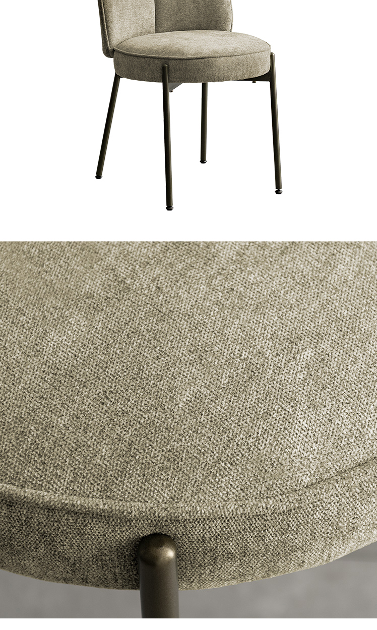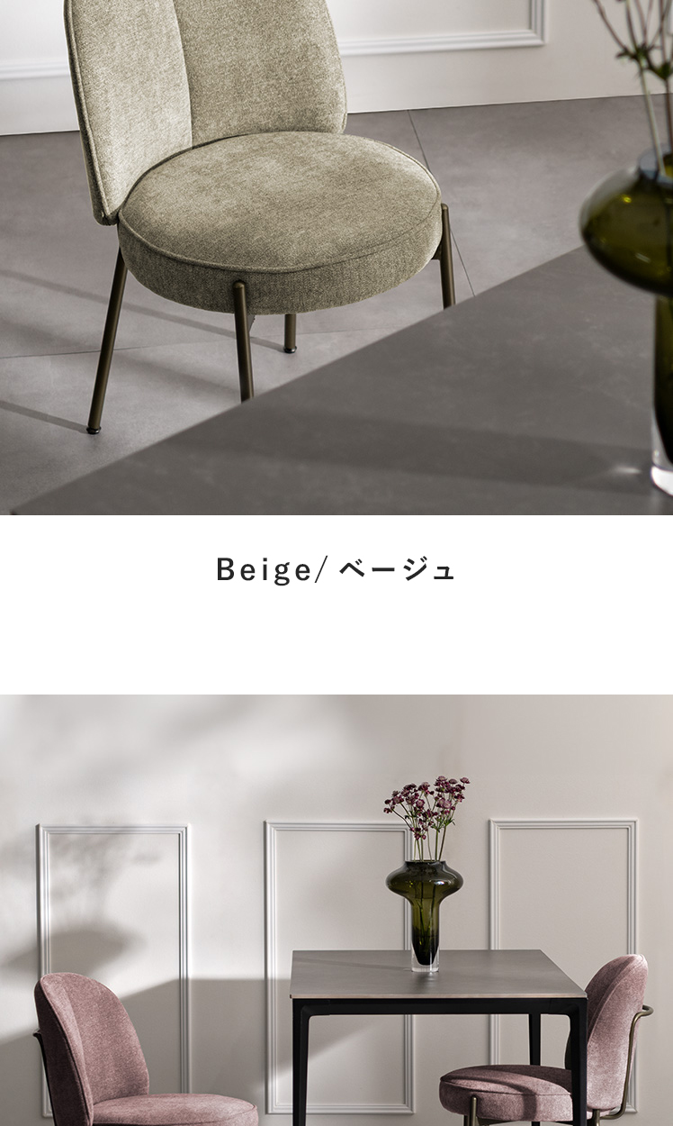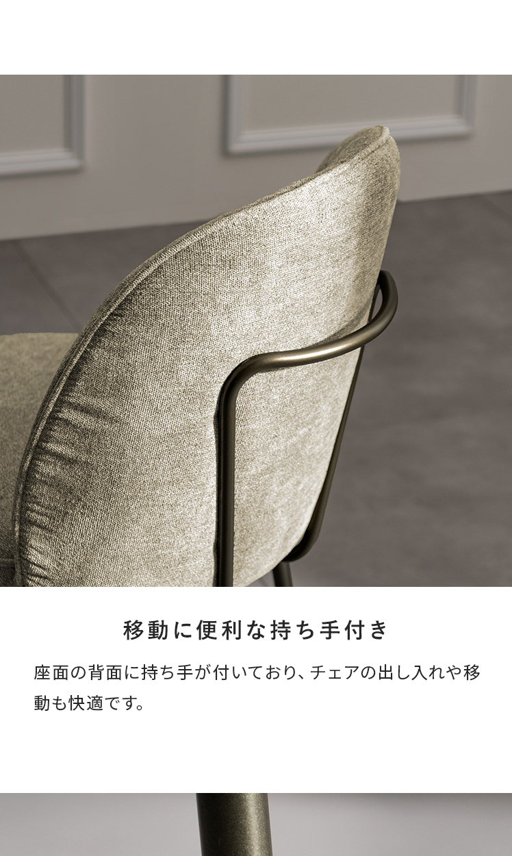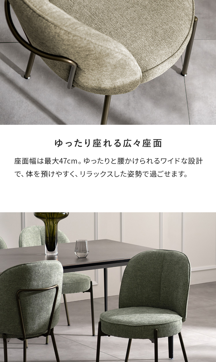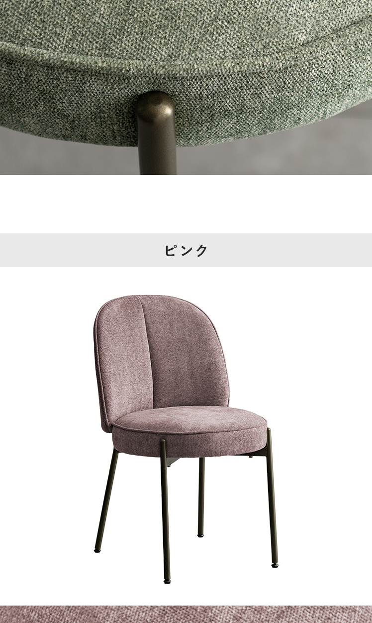 ダイニングチェア mio〔ミオ〕/表情豊かなファブリックとアンティークゴールドの脚。柔らかな曲線を描くフォルムが、空間に上品な可愛らしさを添えます。ダイニングチェアとしては珍しい、極厚ウレタン×ポケットコイルを組み合わせた座面クッション。底つき感のないソファのような快適さで、毎日のお食事や団らんを心地よく。