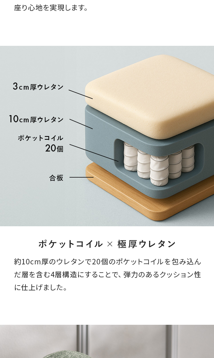 | 材質 | 構造部材:金属(銅)/積層合板 表面加工(脚部):エポキシポリエステル樹脂塗装 張り材:ポリエステル クッション材:ウレタンフォーム |
