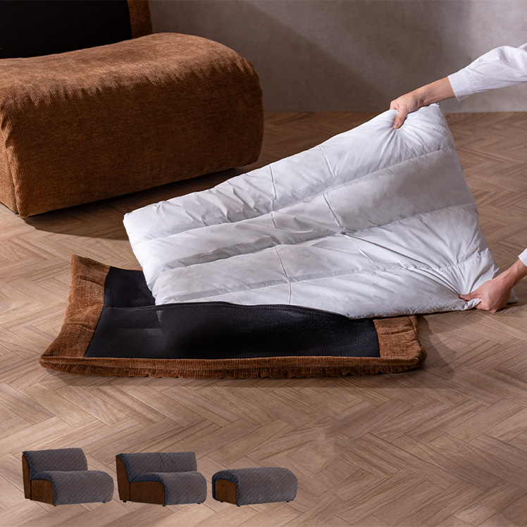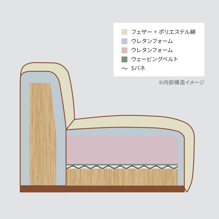 | 材質 | 構造部材/銅製バネ、ウレタン、フェザー、ウェービングベルト 脚/プラスチック 張地/ポリエステル100% クッション材/ウレタンフォーム |