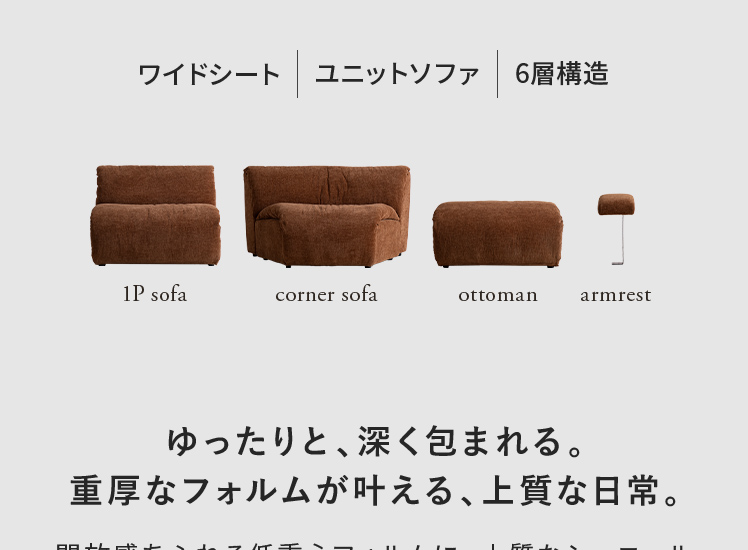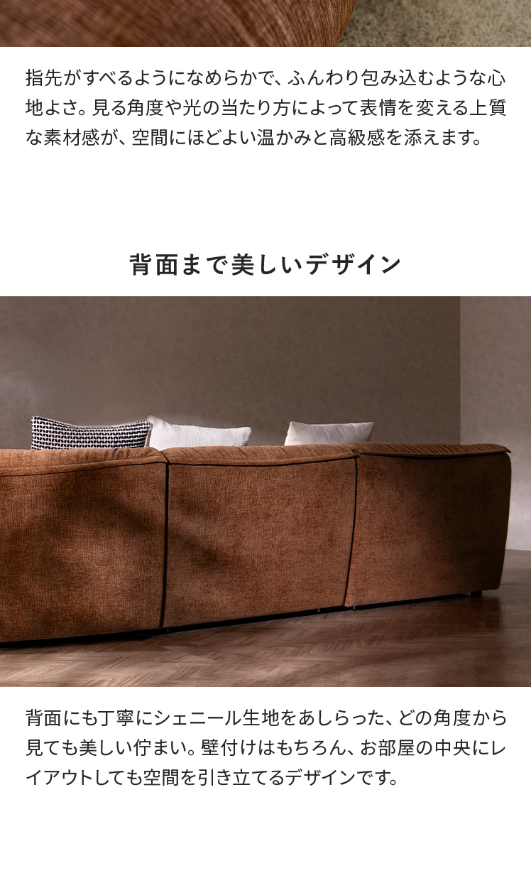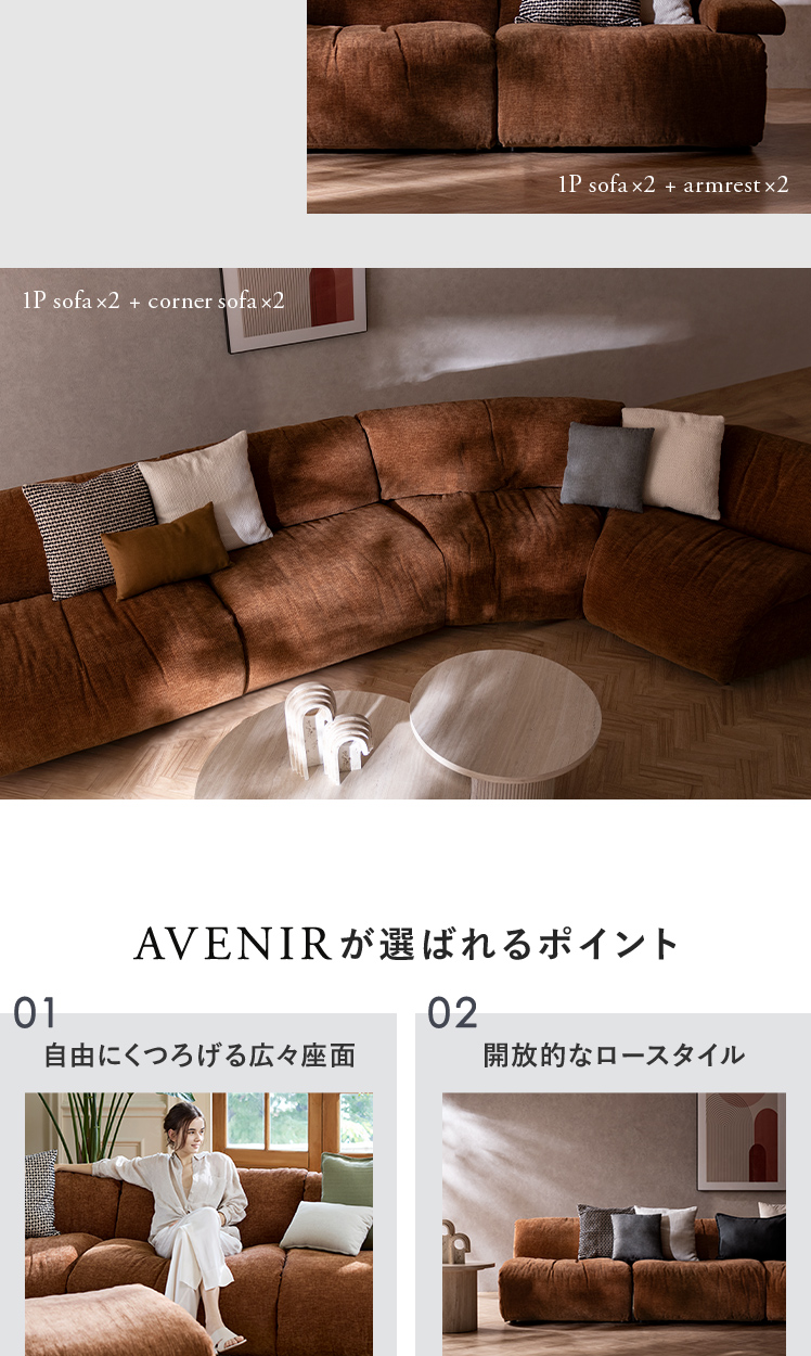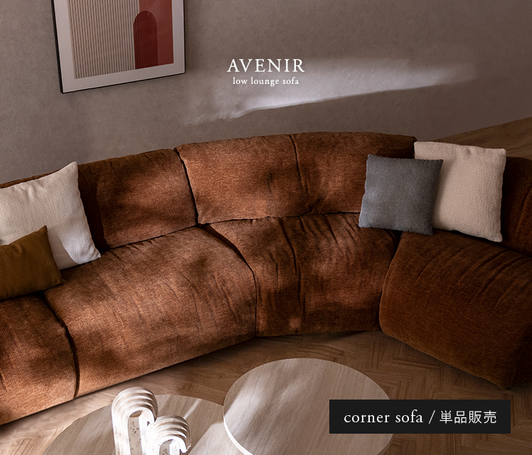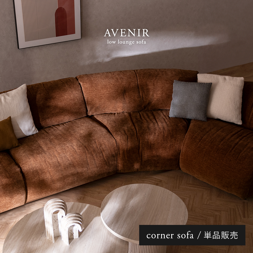 AVENIR〔アヴニール〕 コーナーソファ/開放感あふれる低重心フォルムに、上質なシェニール生地の光沢。忙しい日常に贅沢なひとときをもたらす、くつろぎのための本格ソファです。