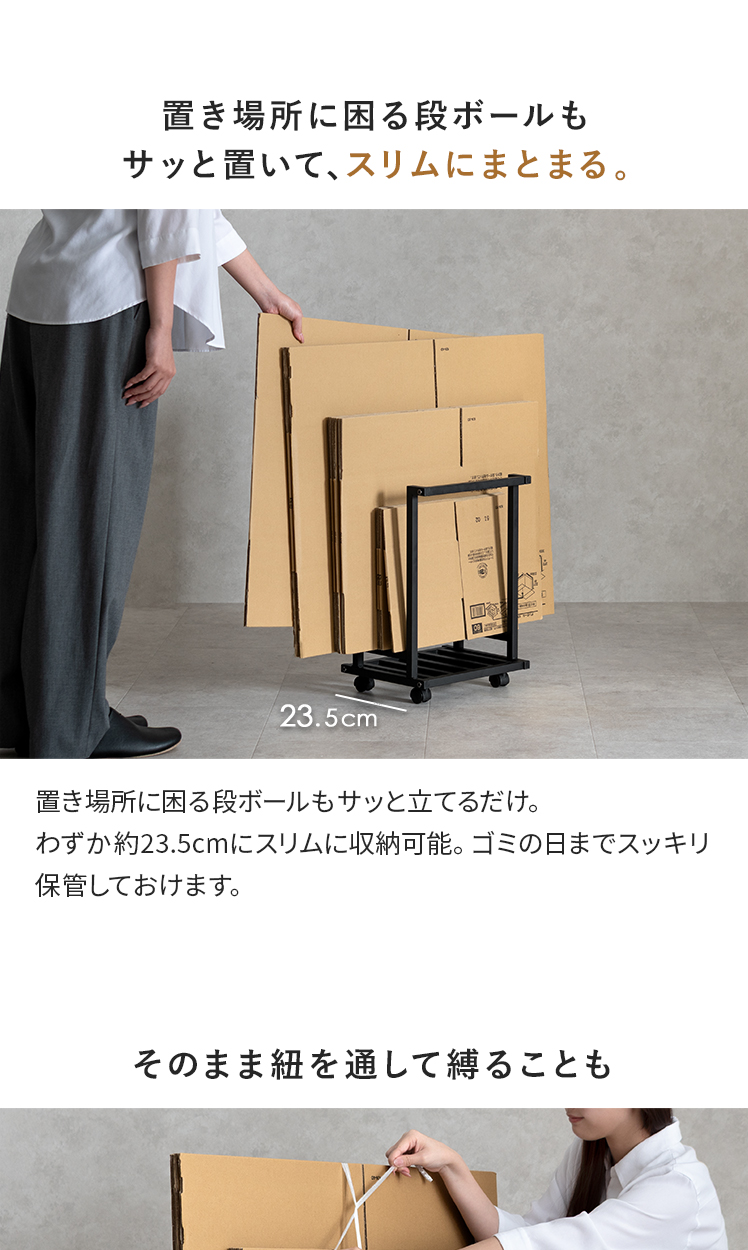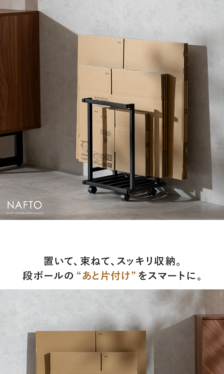 キャスター付き ダンボールストッカー NAFTO〔ナフト〕/置き場所に困る段ボールをまとめて収納できる、ダンボールストッカー“NAFTO(ナフト)” 。キャスター付きで移動もしやすく、収納したまま束ねることもできるので、ストレスフリーで快適にお使いいただけます。