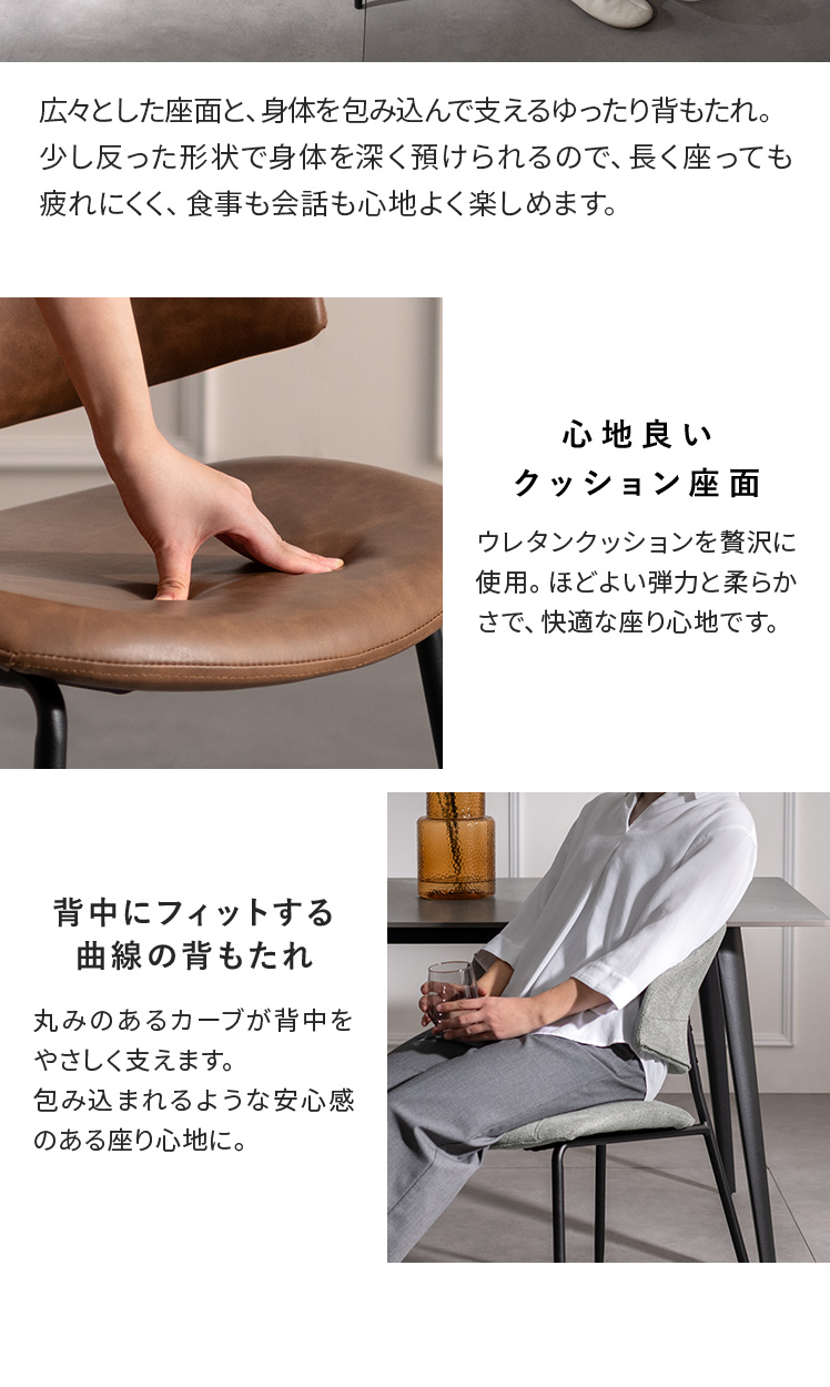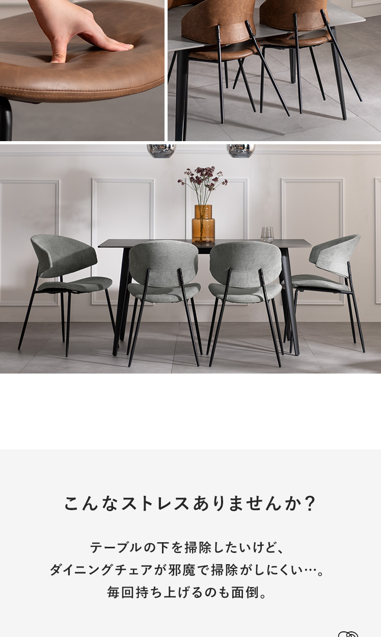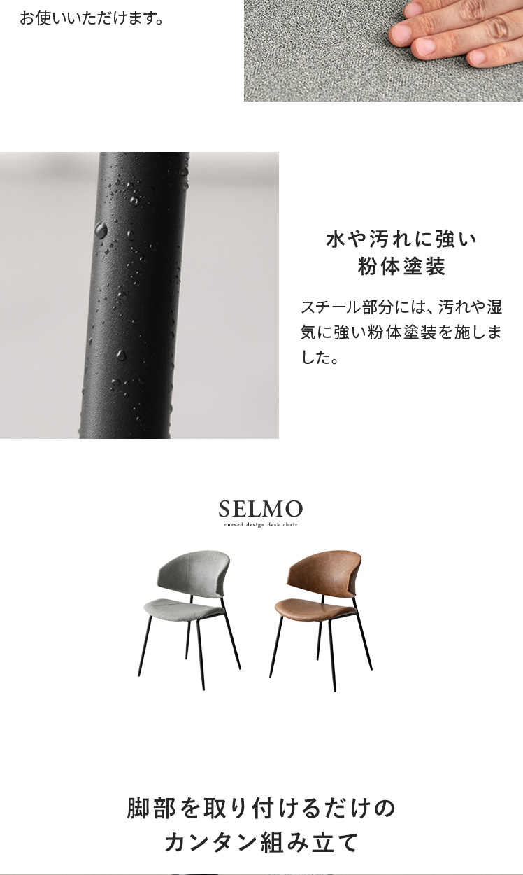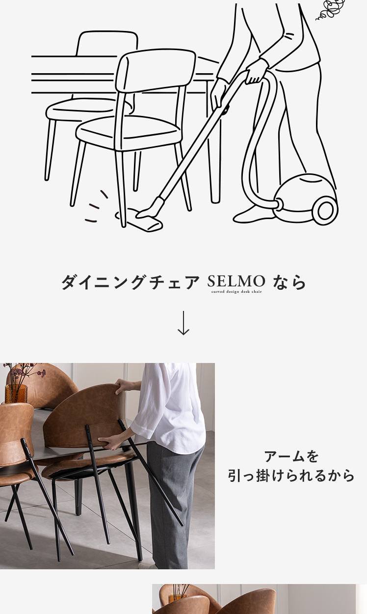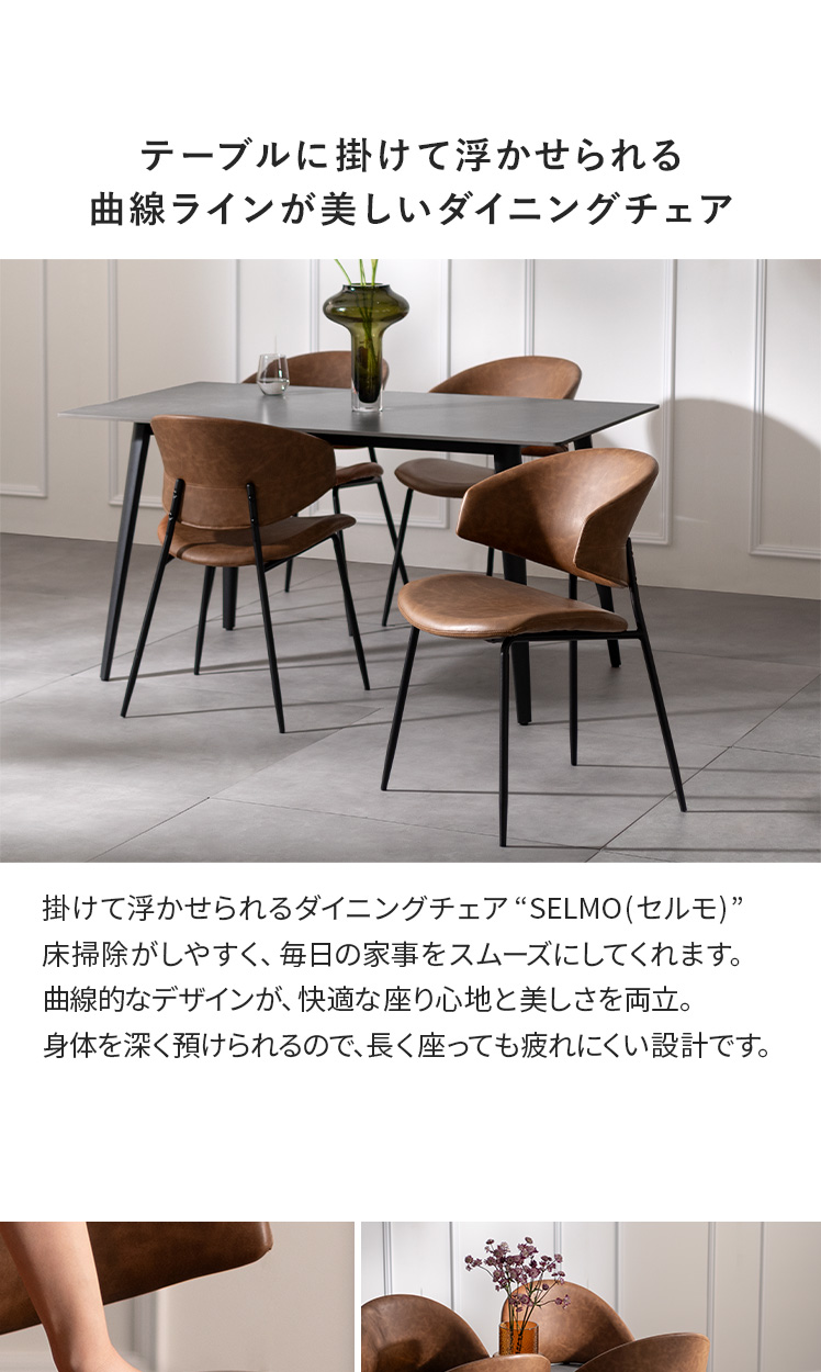ダイニングチェア SELMO〔セルモ〕 2脚セット販売/掛けて浮かせられるダイニングチェア“SELMO(セルモ)” 床掃除がしやすく、毎日の家事をスムーズにしてくれます。曲線的なデザインが、快適な座り心地と美しさを両立。身体を深く預けられるので、長く座っても疲れにくい設計です。