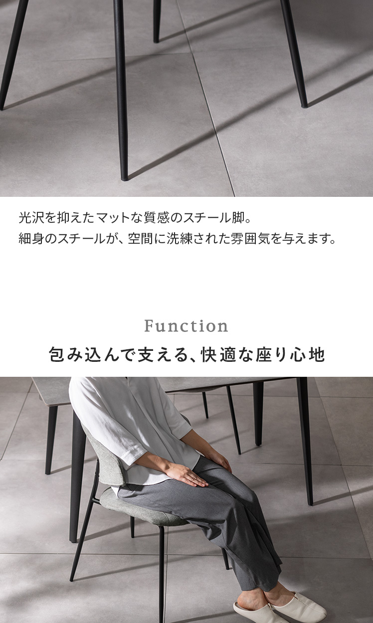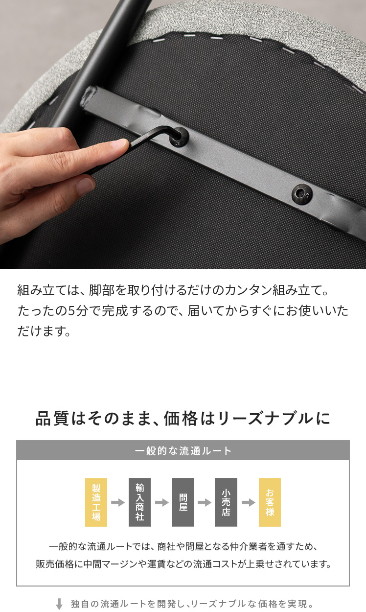 | 材質 | クッション材/ウレタンフォーム、張地/ファブリックタイプ=ポリエステル、 レザータイプ=合成皮皮(ポリウレタン)、脚部/スチール(粉体塗装仕上げ) |