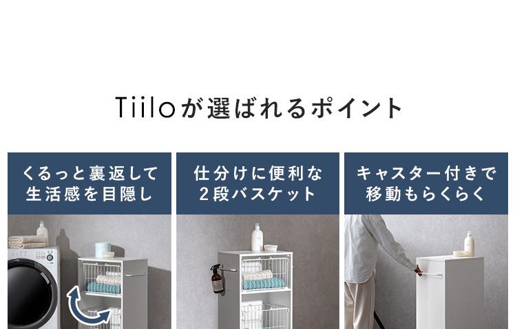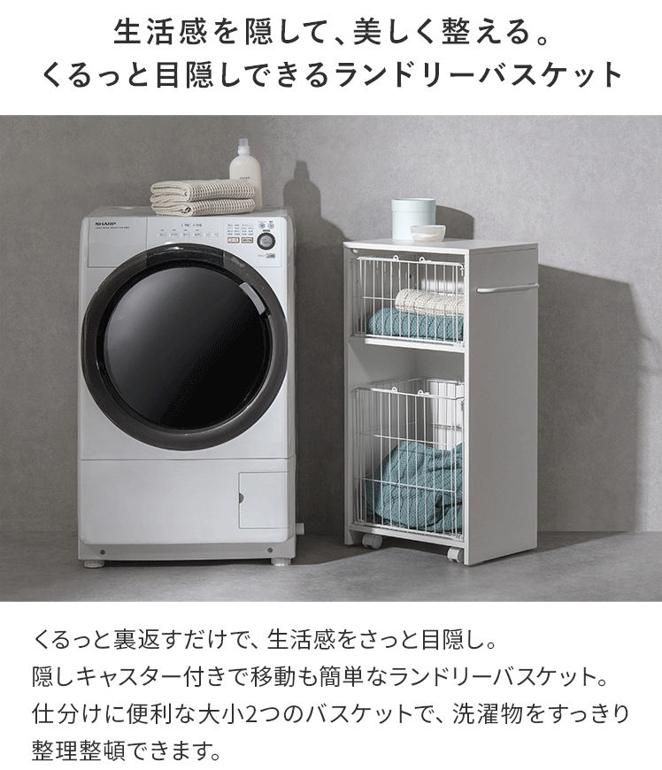 隠せるランドリーバスケット Tiilo〔ティーロ〕/くるっと裏返すだけで、生活感をさっと目隠し。隠しキャスター付きで移動も簡単なランドリーバスケット。仕分けに便利な大小2つのバスケットで、洗濯物をすっきり整理整頓できます。