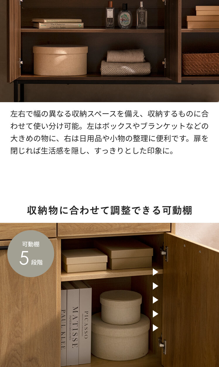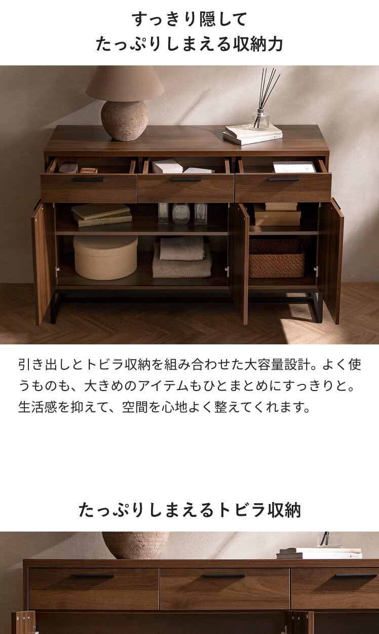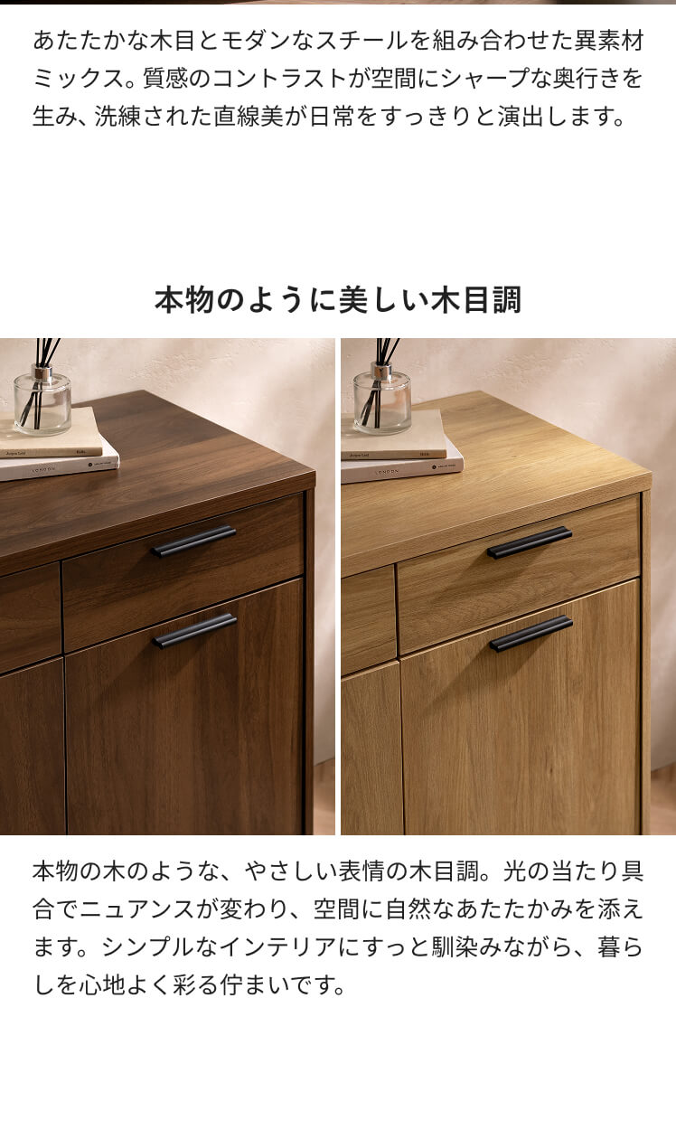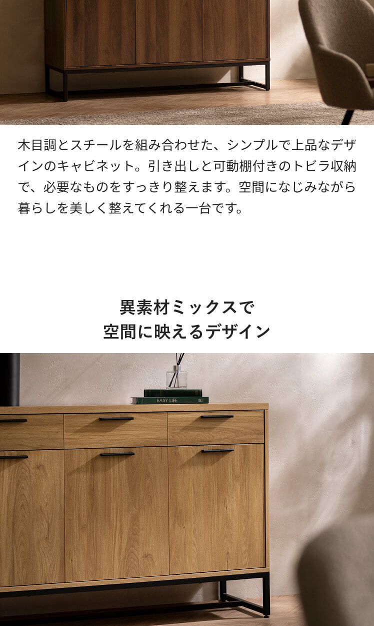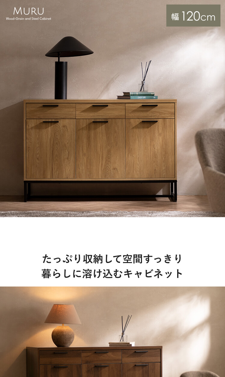 木目調キャビネットMuru〔ムル〕/木目調とスチールを組み合わせた、シンプルで上品なデザインのキャビネット。引き出しと可動棚付きのトビラ収納で、必要なものをすっきり整えます。空間になじみながら暮らしを美しく整えてくれる一台です。