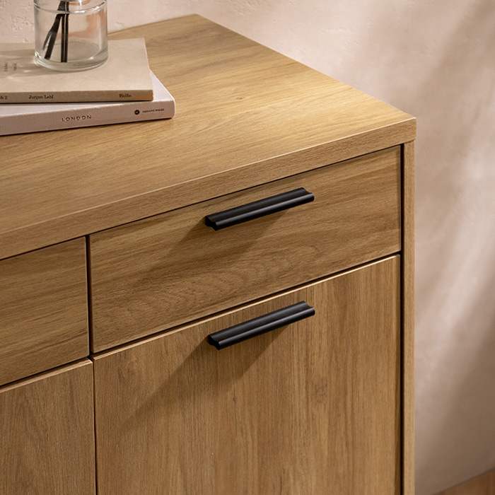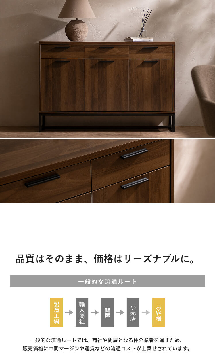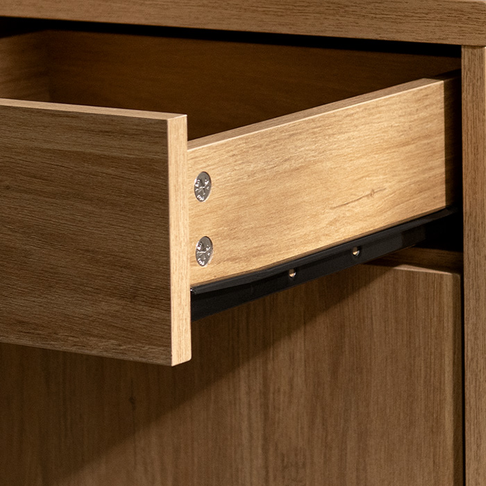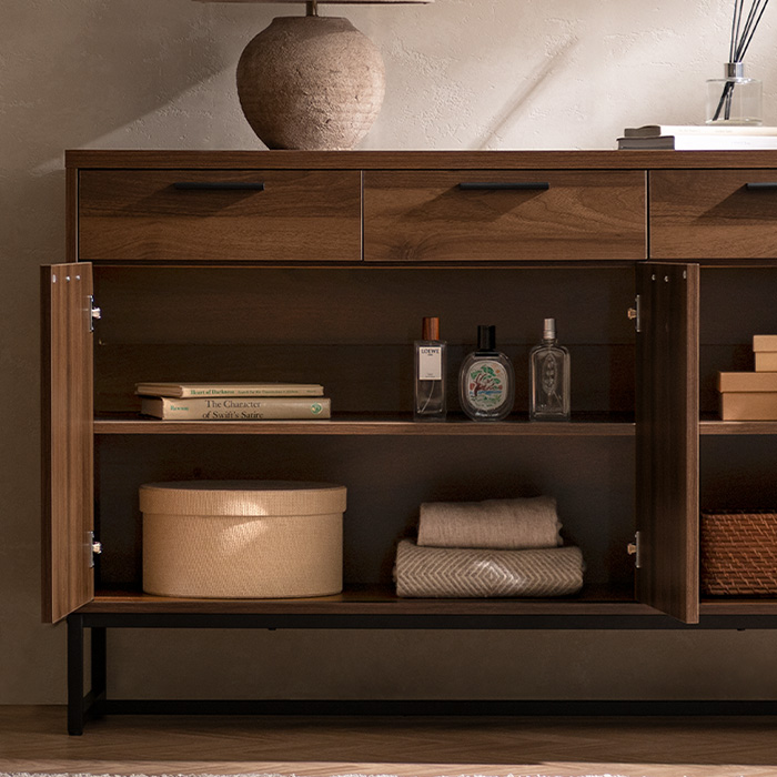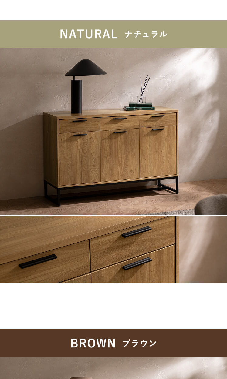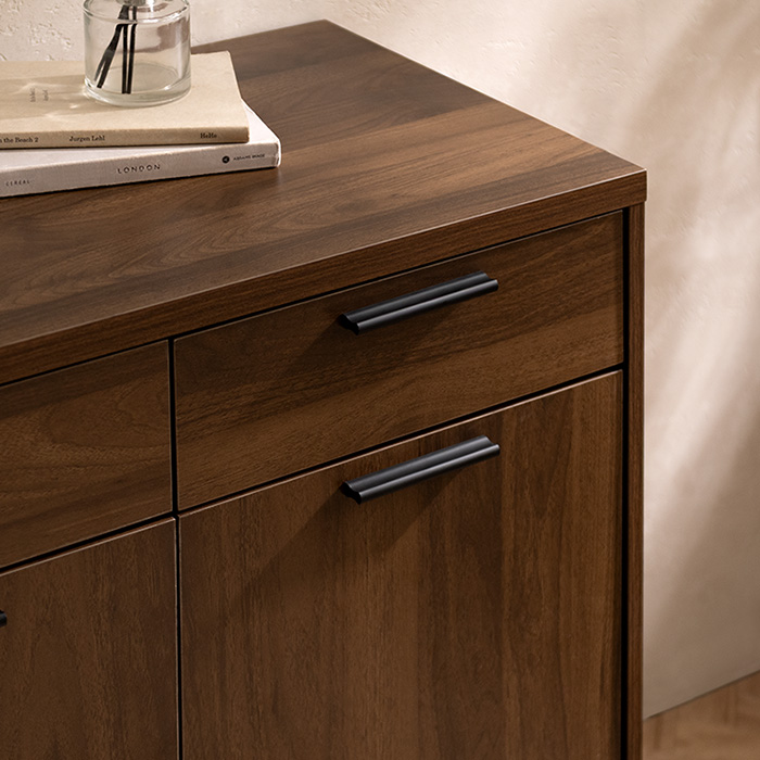 木目調キャビネットMuru〔ムル〕/木目調とスチールを組み合わせた、シンプルで上品なデザインのキャビネット。引き出しと可動棚付きのトビラ収納で、必要なものをすっきり整えます。空間になじみながら暮らしを美しく整えてくれる一台です。