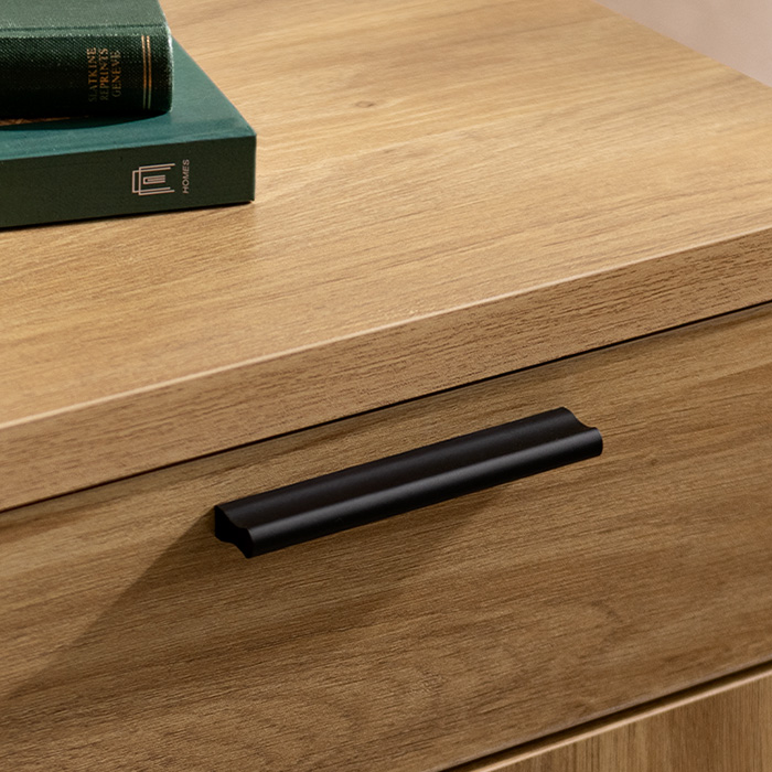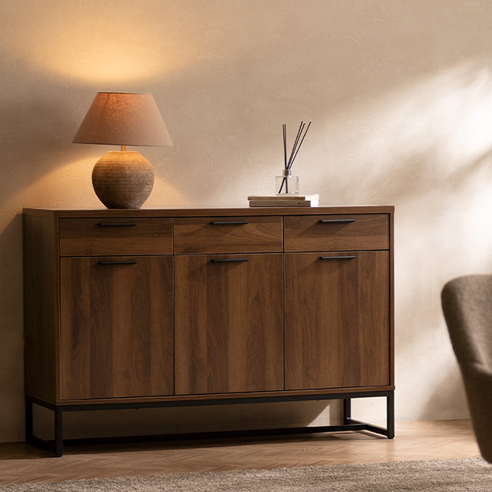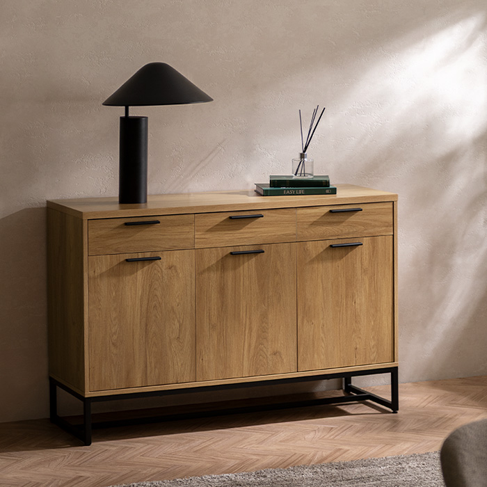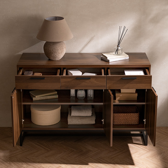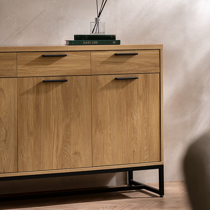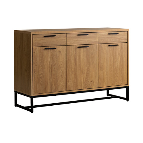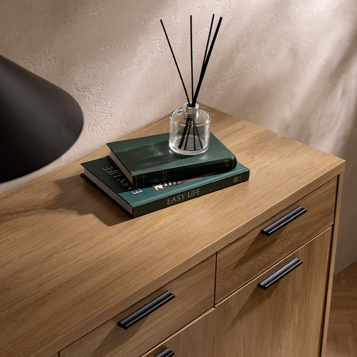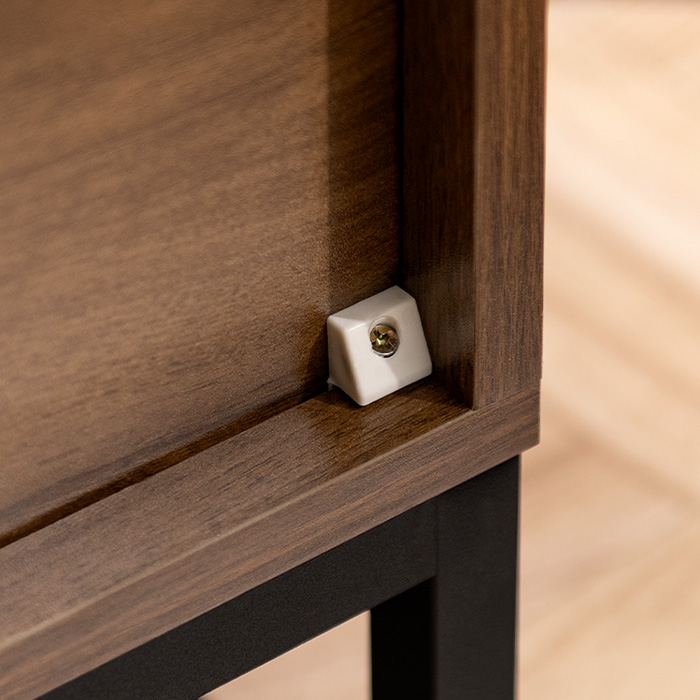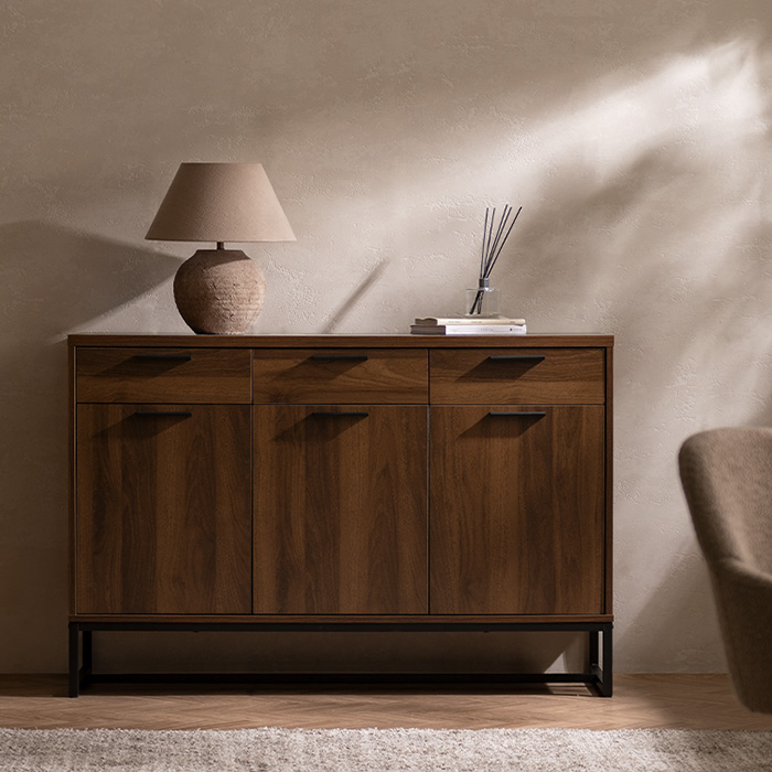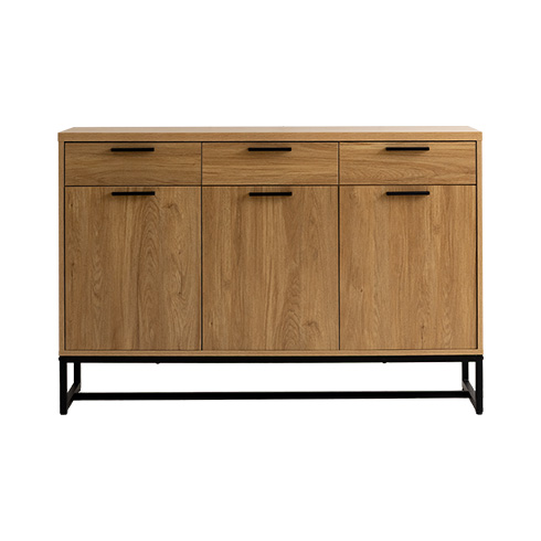 木目調キャビネットMuru〔ムル〕/木目調とスチールを組み合わせた、シンプルで上品なデザインのキャビネット。引き出しと可動棚付きのトビラ収納で、必要なものをすっきり整えます。空間になじみながら暮らしを美しく整えてくれる一台です。