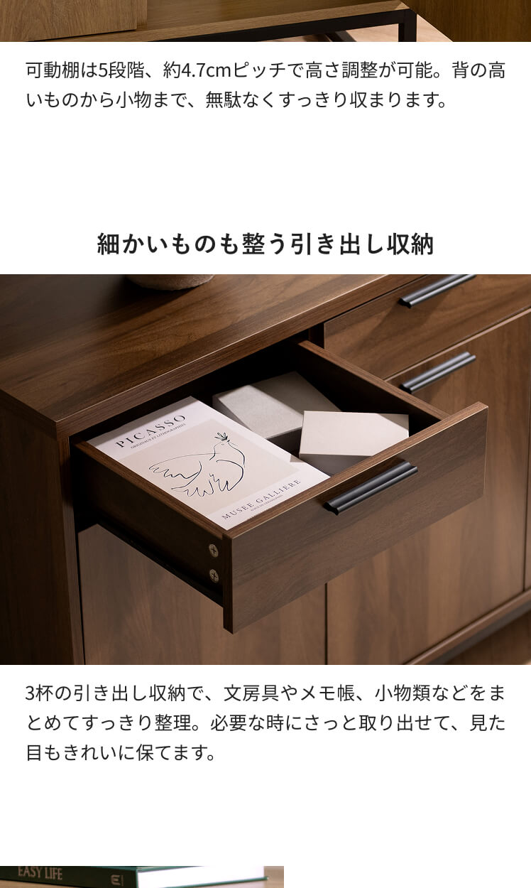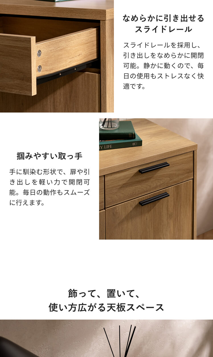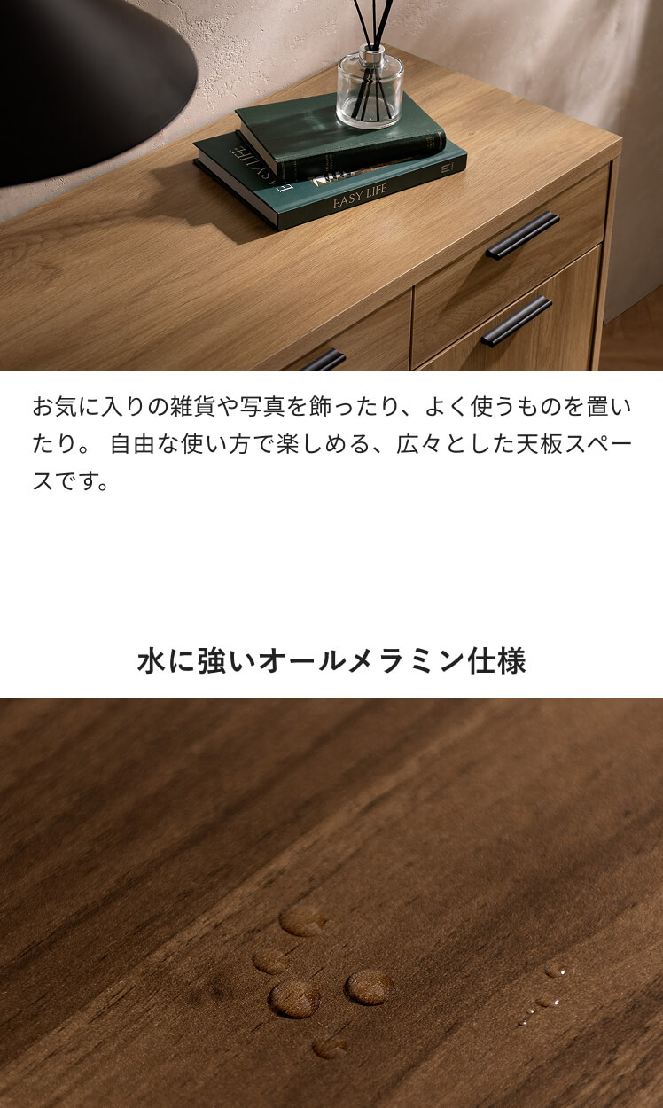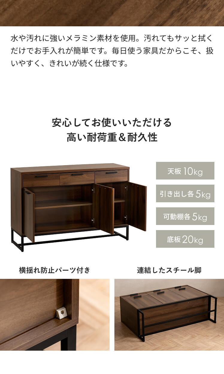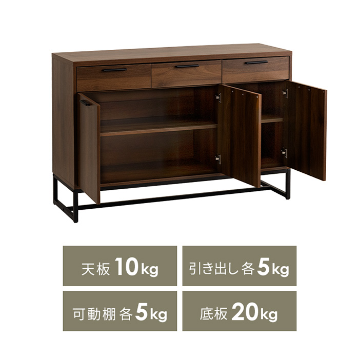 | 耐荷重 | 天板/約10kg、底板/約20kg、可動棚/各5kg、引き出し/各5kg |