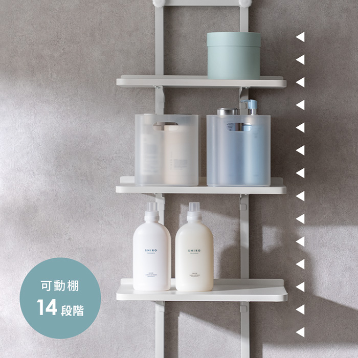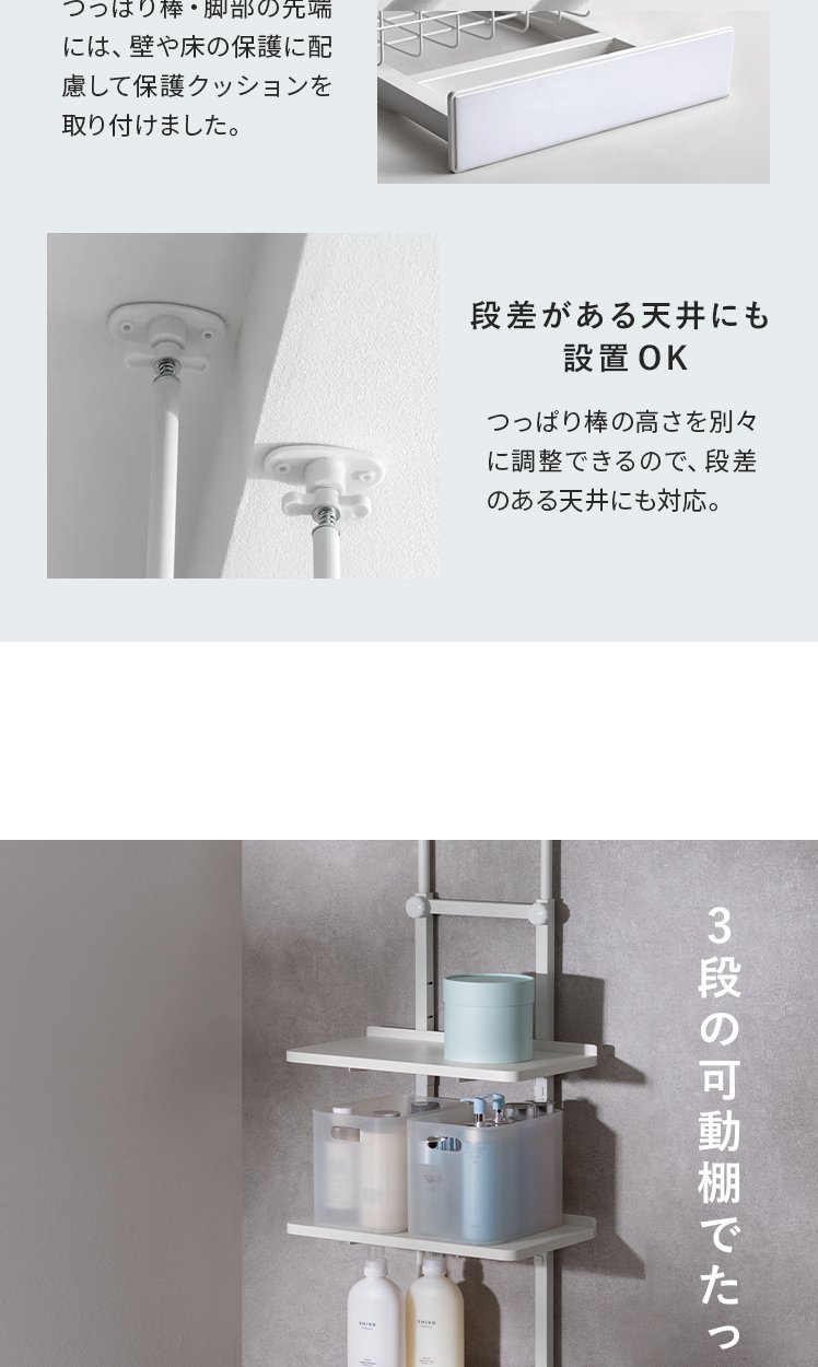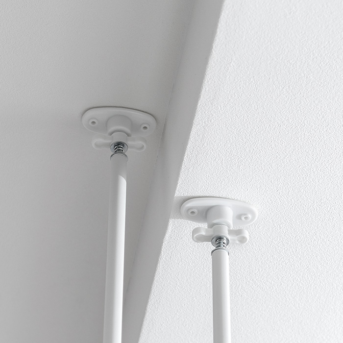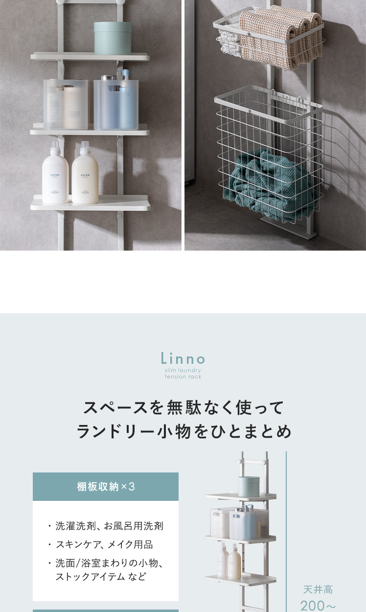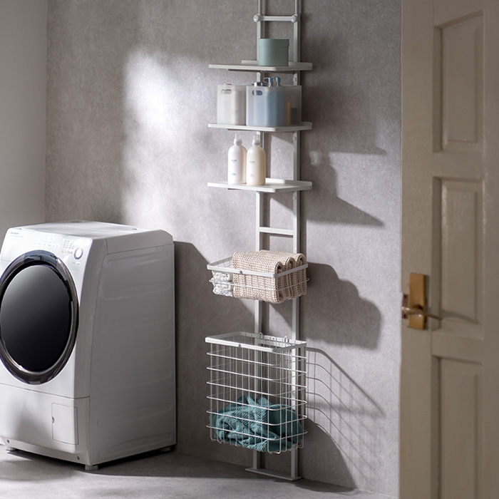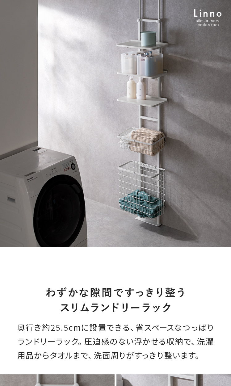 つっぱりランドリーラック Linno〔リンノ〕/奥行き約25.5cmに設置できる、省スペースなつっぱりランドリーラック。圧迫感のない浮かせる収納で、洗濯用品からタオルまで、洗面周りがすっきり整います。