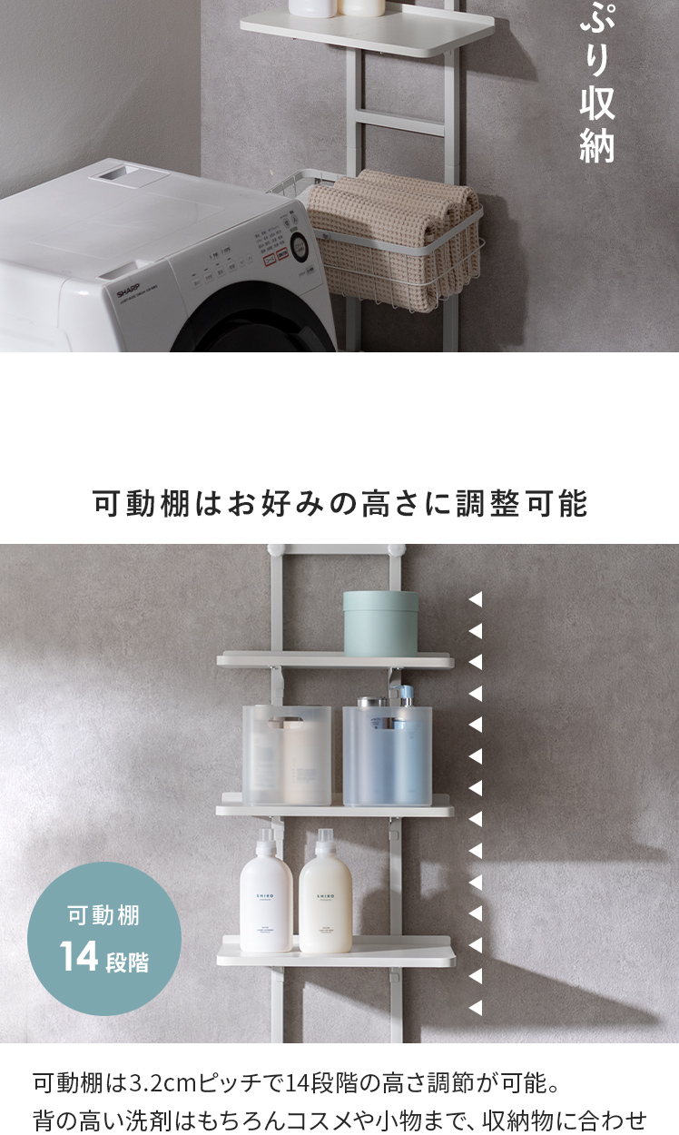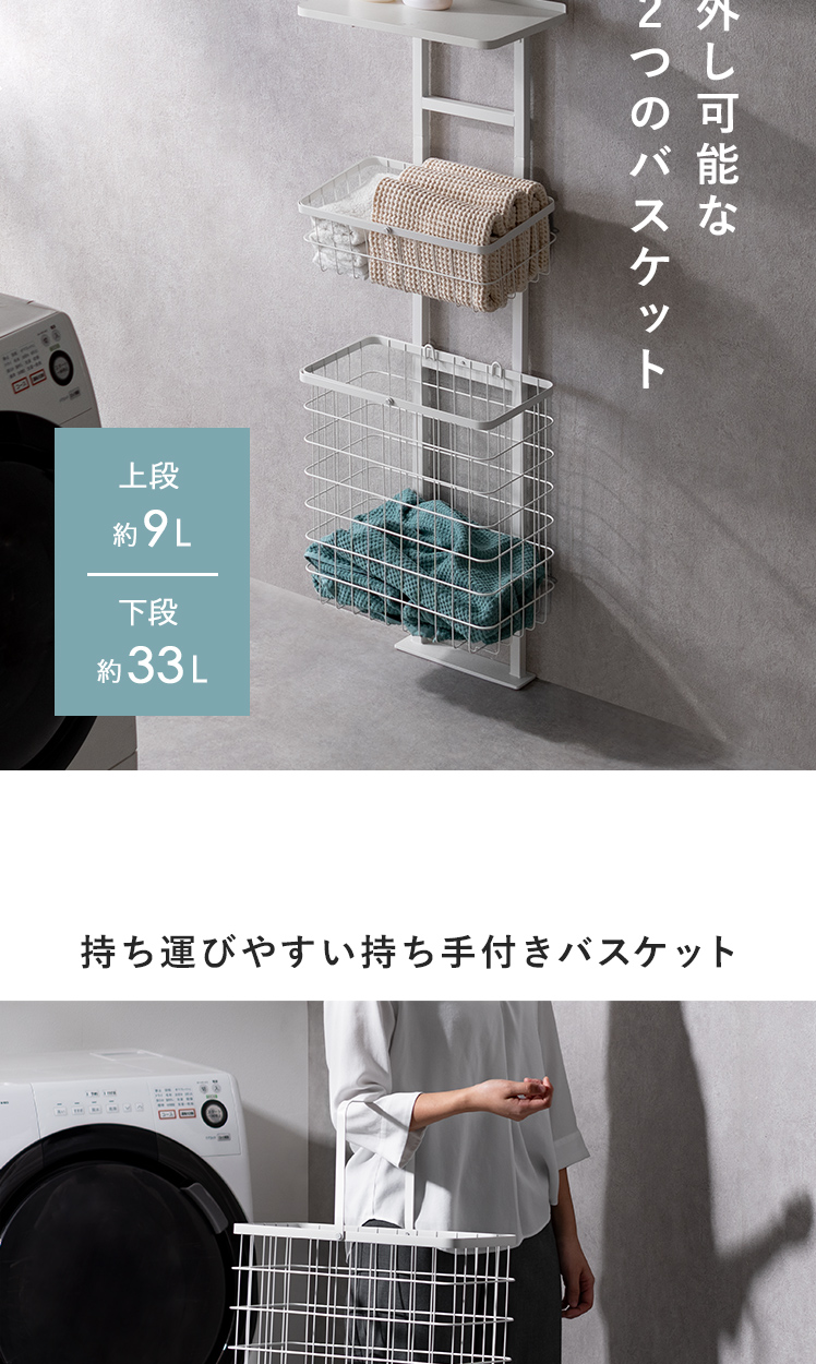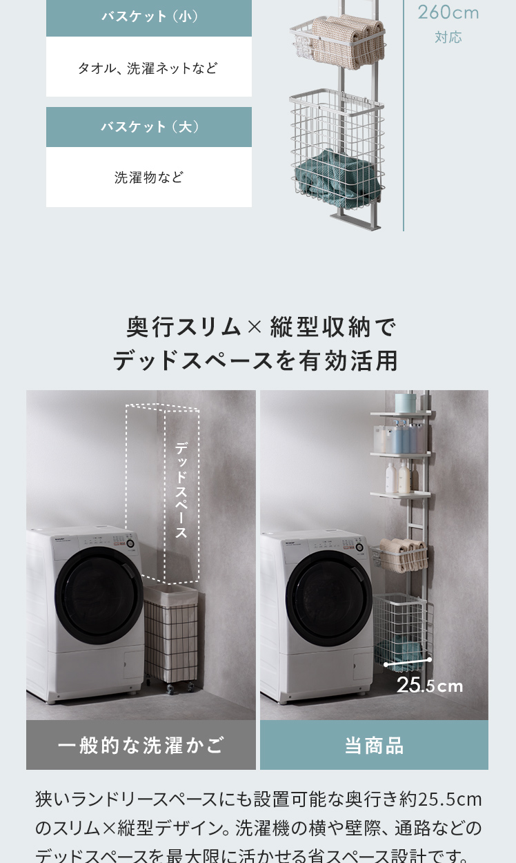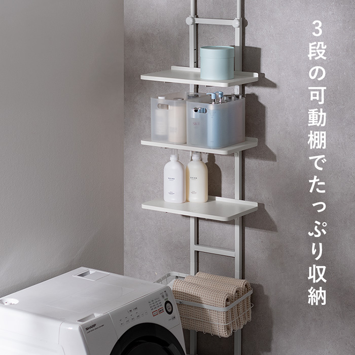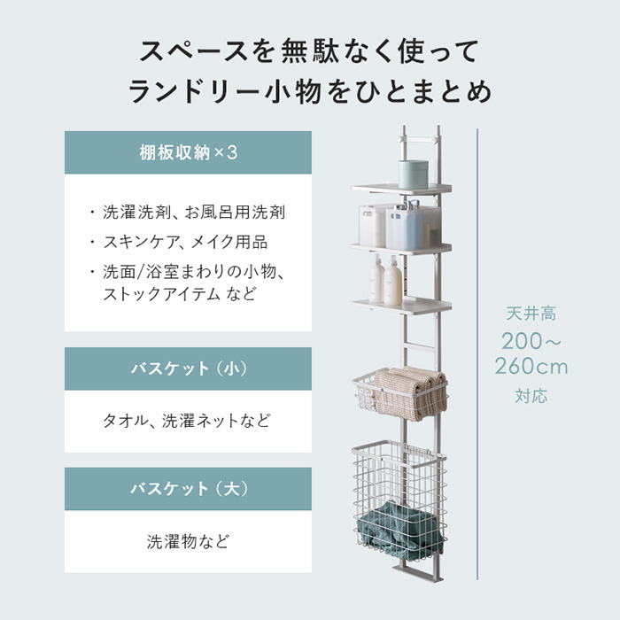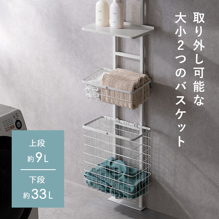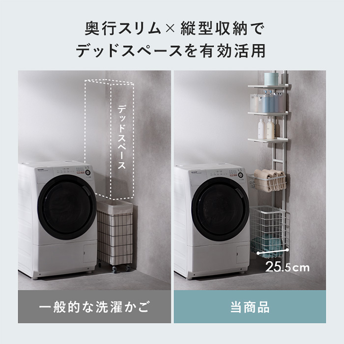 ランドリーラック 突っ張り スリム 薄型 洗濯機 ラック つっぱり 棚 バスケット付 棚付き 縦型洗濯機 ドラム式対応 防水パン 設置 つっぱり棚 洗濯かご カゴ付 おしゃれ シンプル 隙間 省スペース 収納 洗濯機収納 デッドスペース 突っ張り式ランドリーラック ホワイト 白