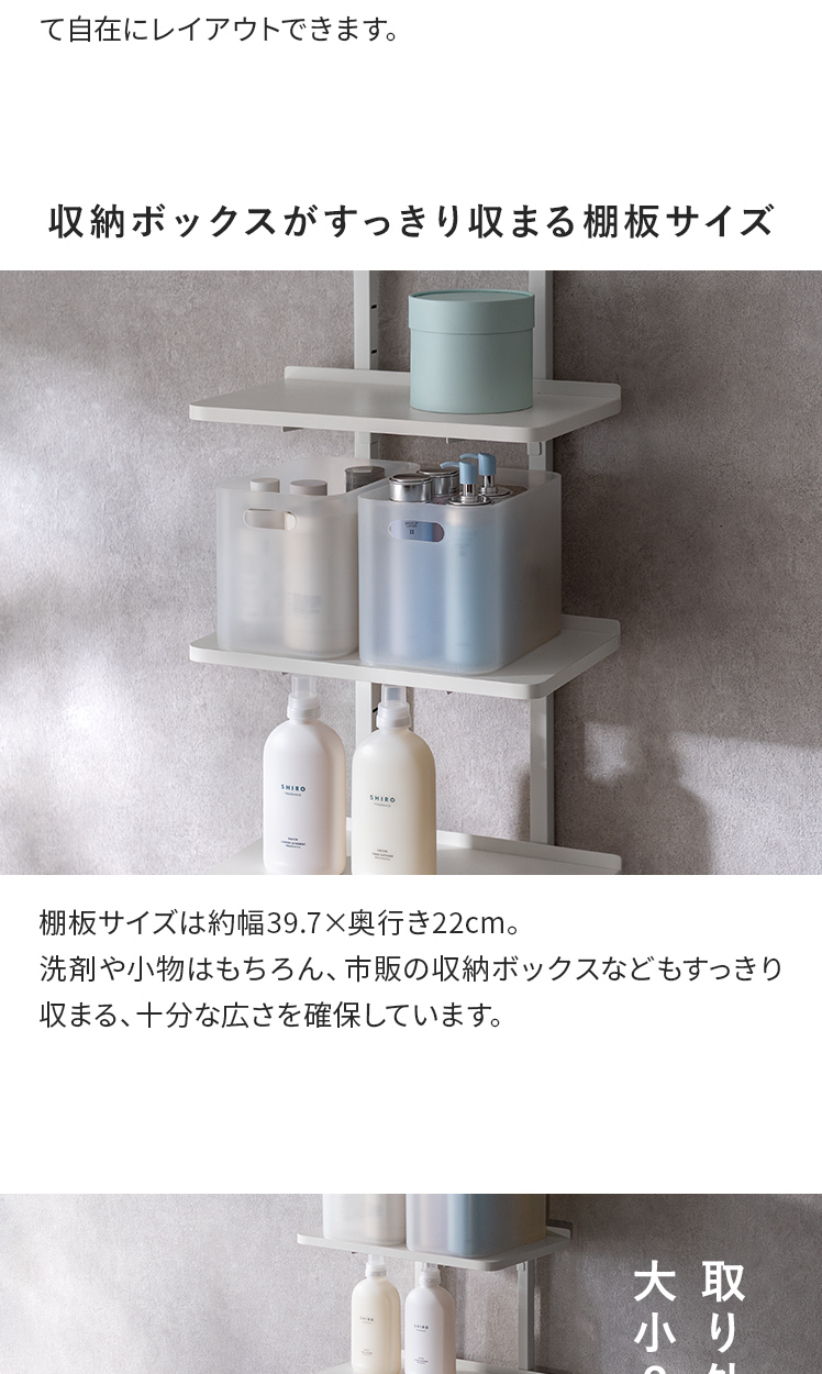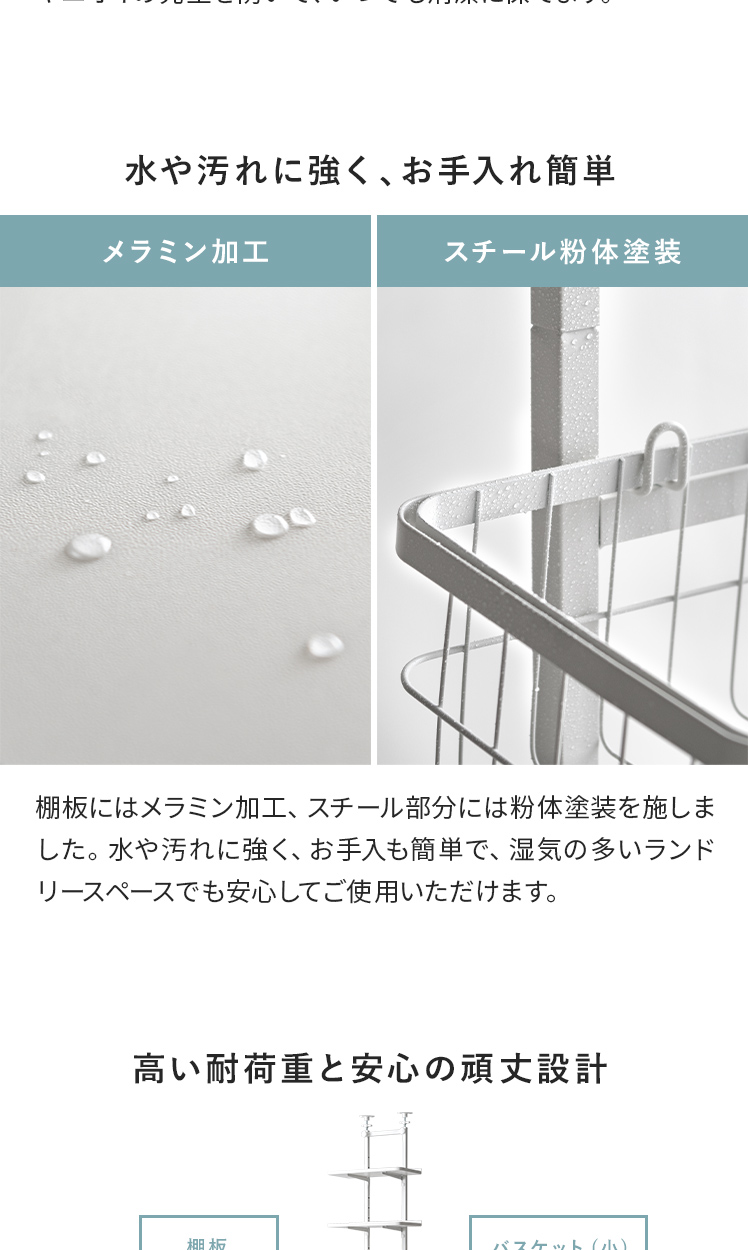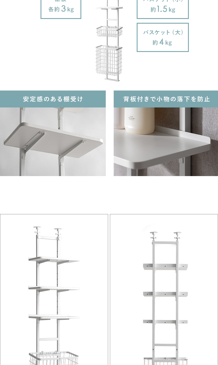 | 耐荷重 | 棚板/各3kg、バスケット(小)/1.5kg、バスケット(大)/4kg |