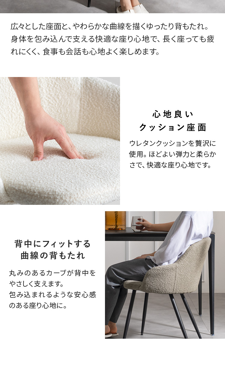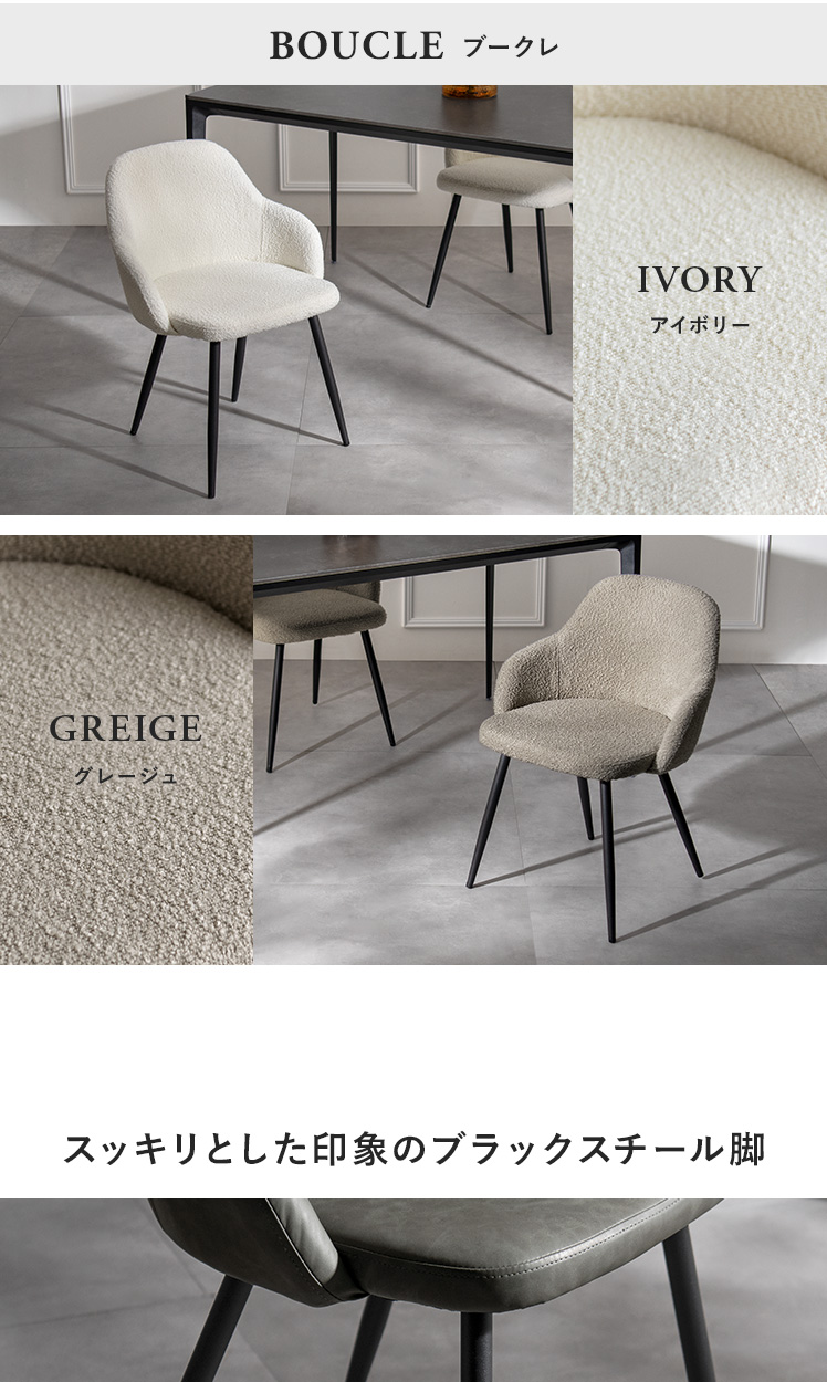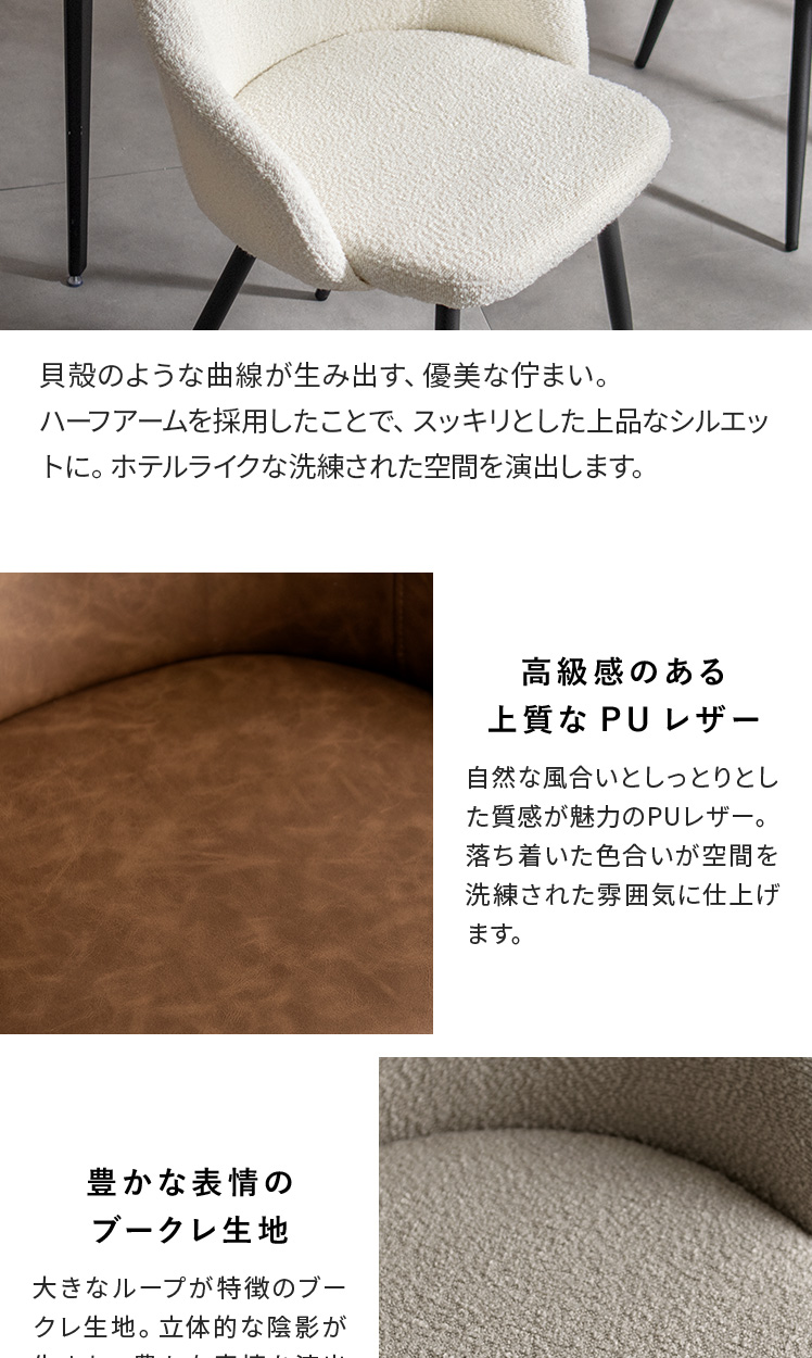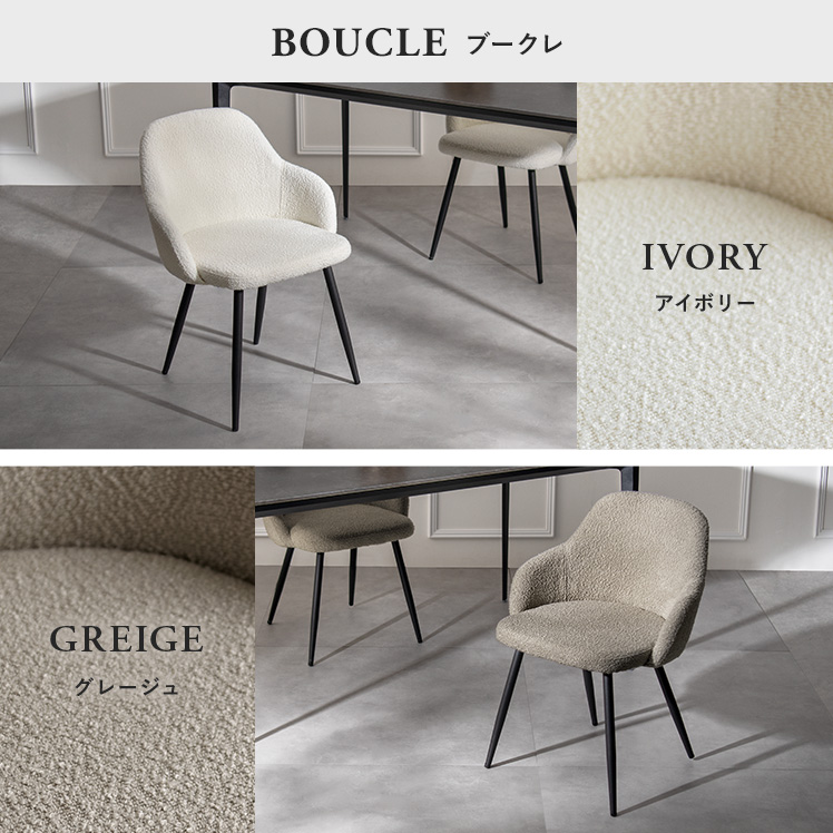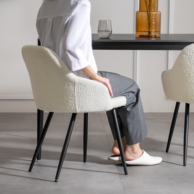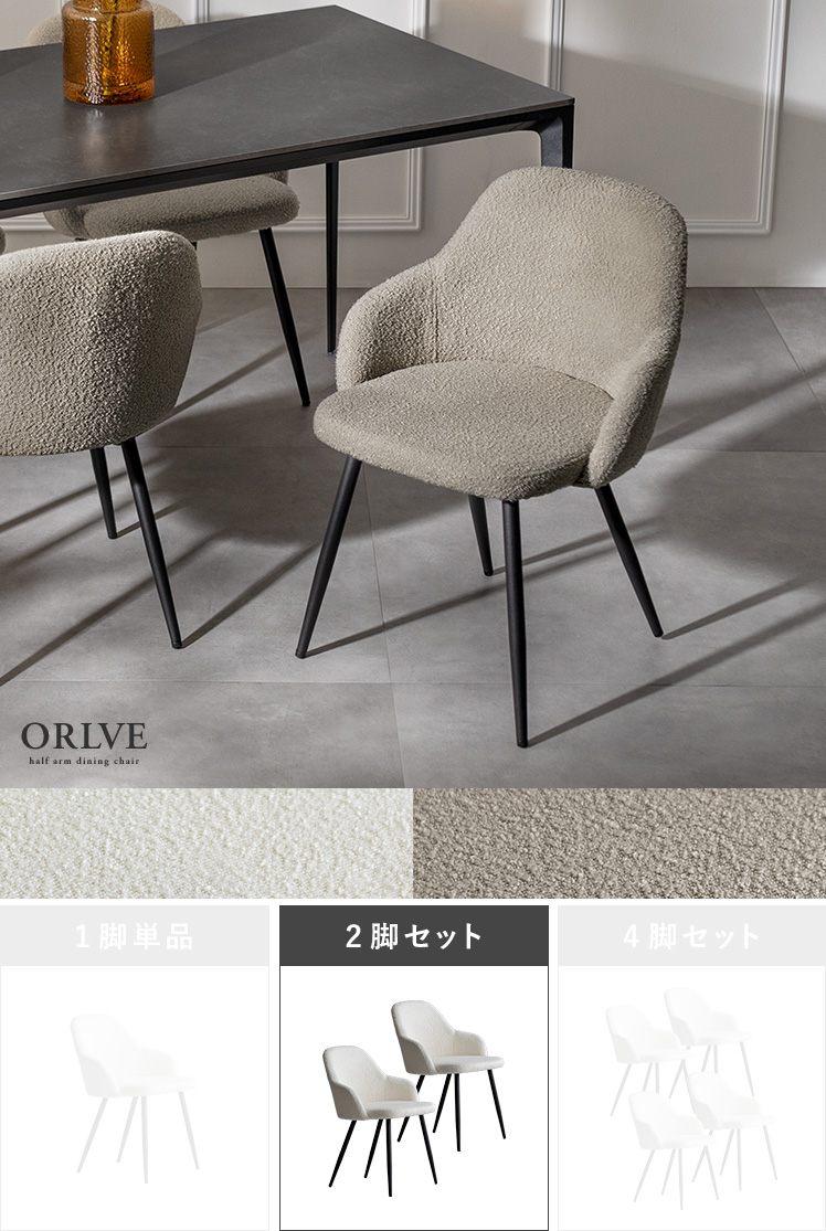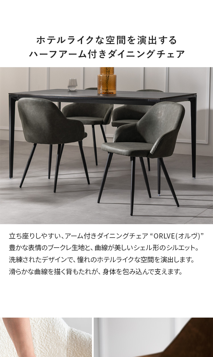 ハーフアーム付きダイニングチェア ORLVE〔オルブ〕ブークレタイプ 2脚セット販売/立ち座りしやすい、アーム付きダイニングチェア“ORLVE(オルヴ)”豊かな表情のブークレ生地と、曲線が美しいシェル形のシルエット。洗練されたデザインで、憧れのホテルライクな空間を演出します。滑らかな曲線を描く背もたれが、身体を包み込んで支えます。