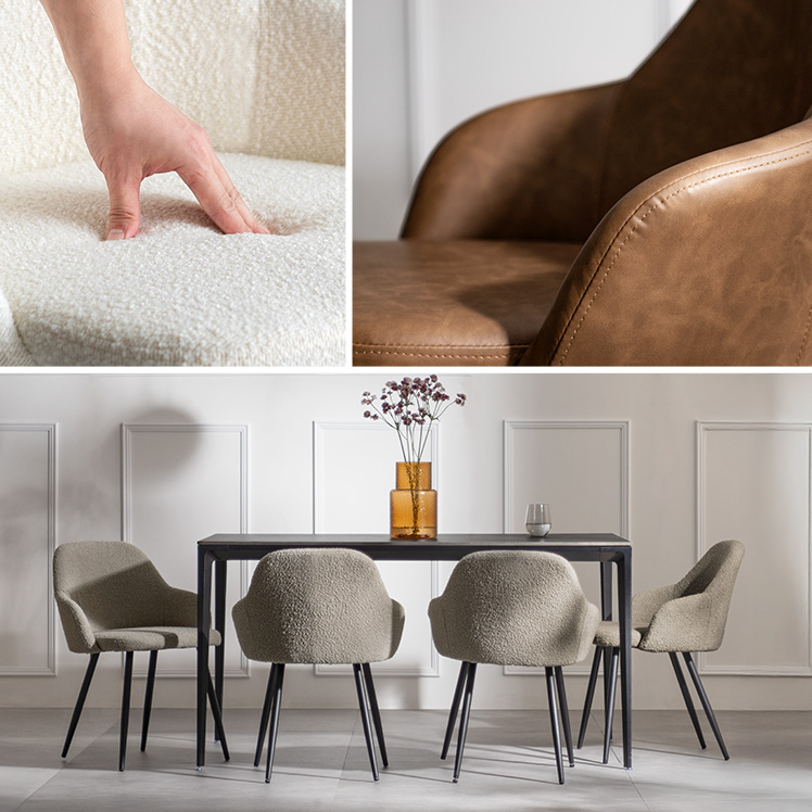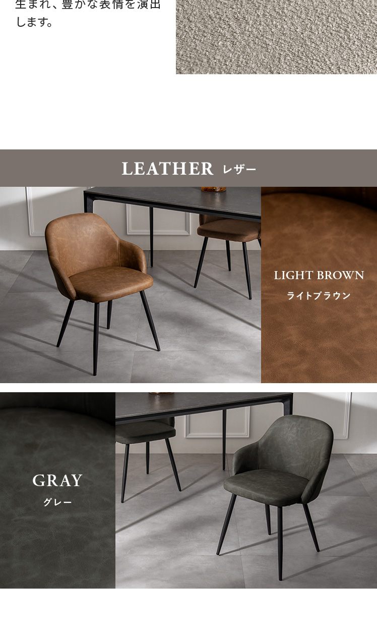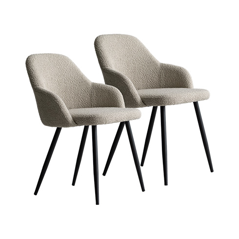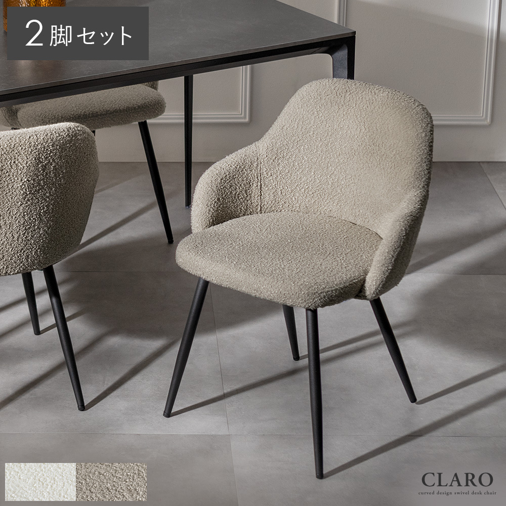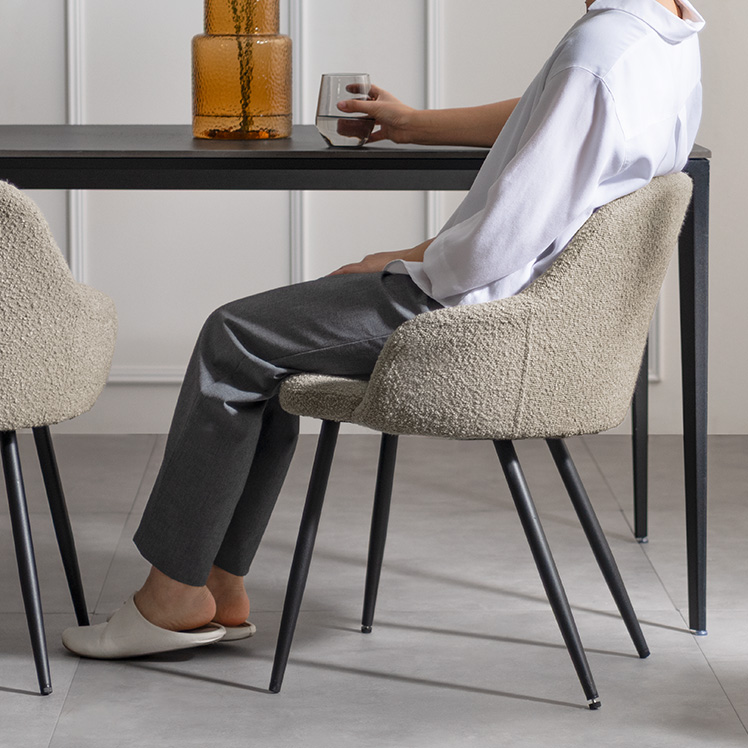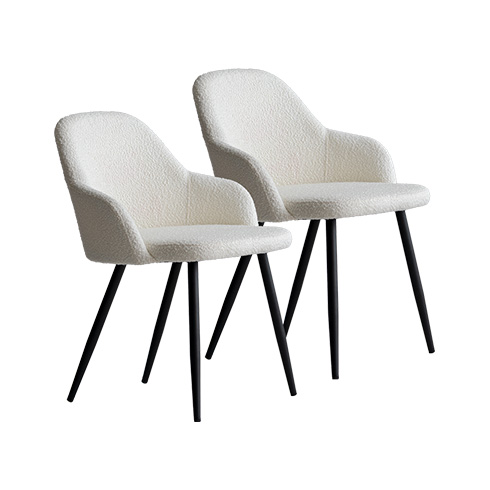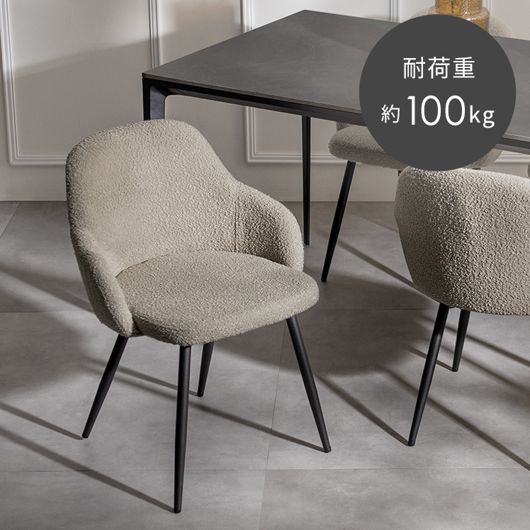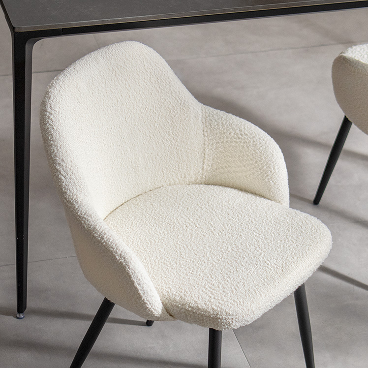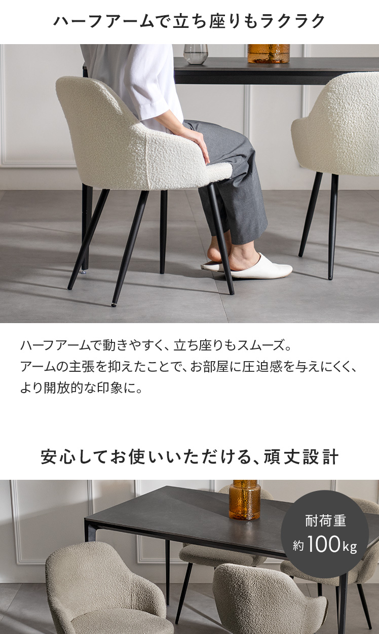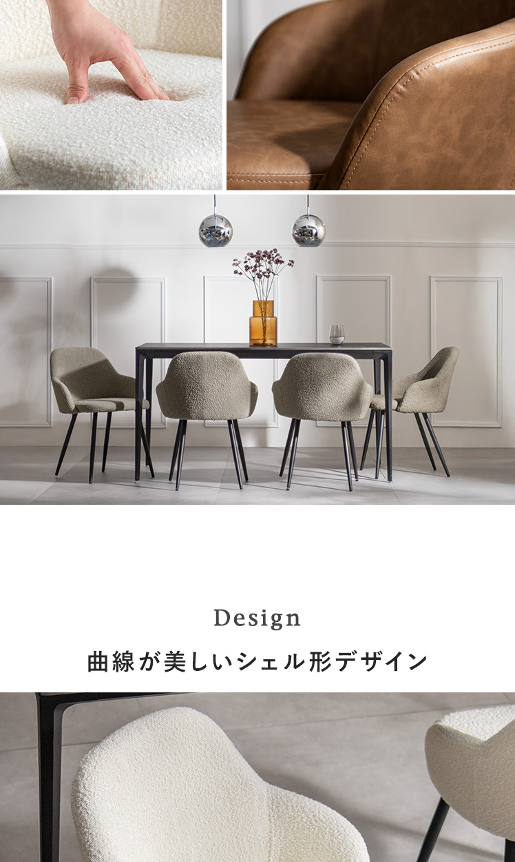ハーフアーム付きダイニングチェア ORLVE〔オルブ〕ブークレタイプ 2脚セット販売/立ち座りしやすい、アーム付きダイニングチェア“ORLVE(オルヴ)”豊かな表情のブークレ生地と、曲線が美しいシェル形のシルエット。洗練されたデザインで、憧れのホテルライクな空間を演出します。滑らかな曲線を描く背もたれが、身体を包み込んで支えます。