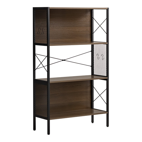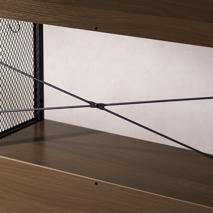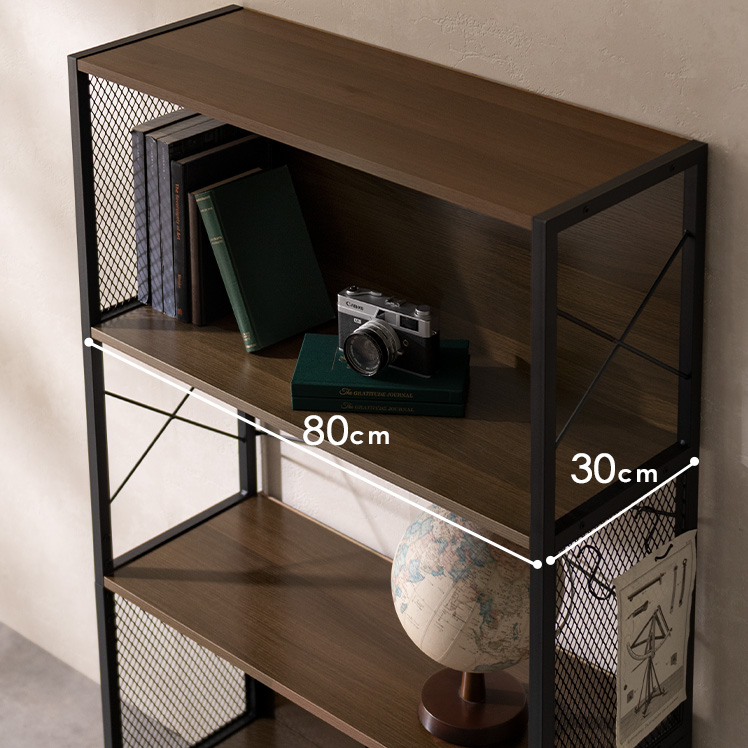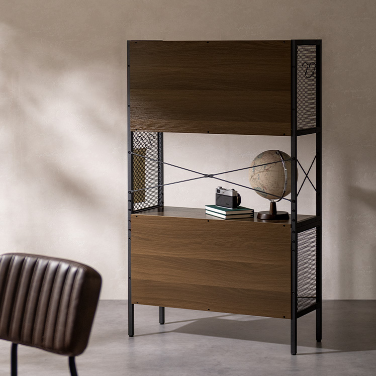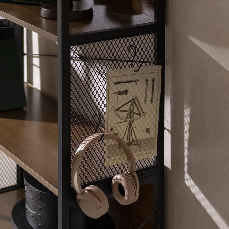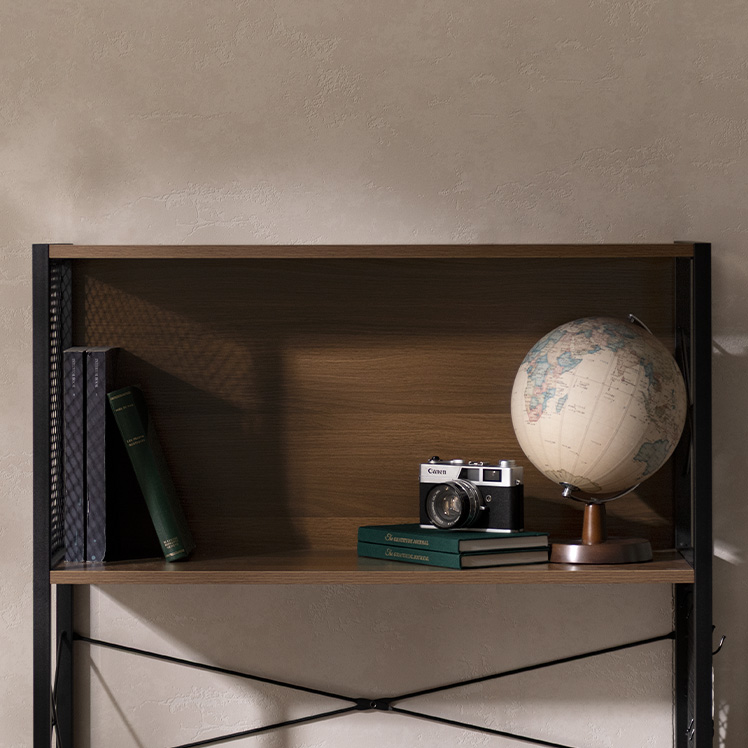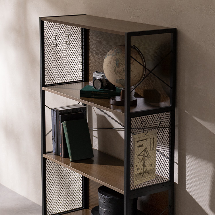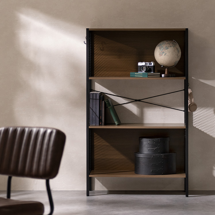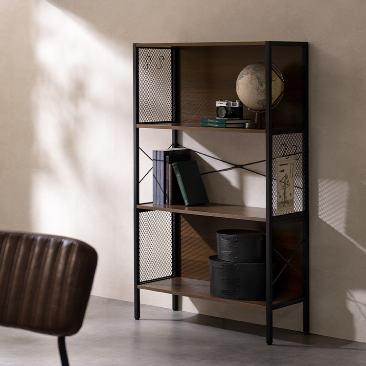 メッシュオープンラック Forge〔フォージ〕/メッシュと木目、ブラックフレームを組み合わせた存在感のある佇まい。程よく無骨で、インダストリアルな雰囲気を自然に演出します。見せる収納として置くだけで空間が引き締まる、飾る楽しさを広げるデザインラックです。