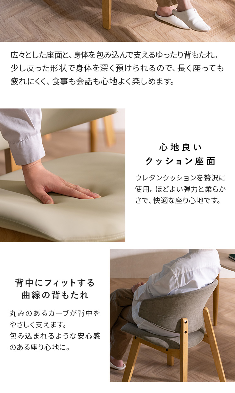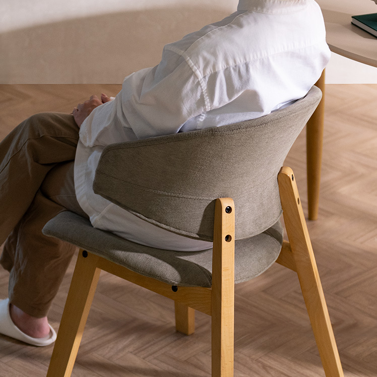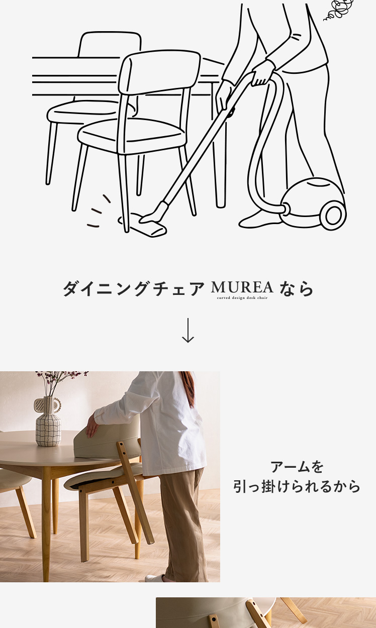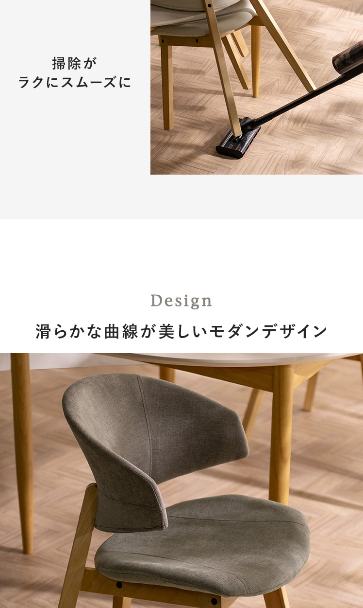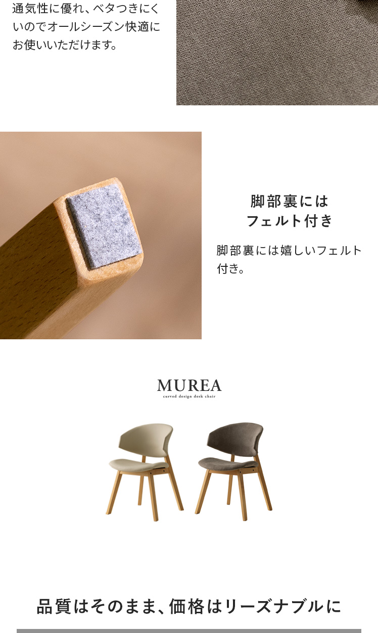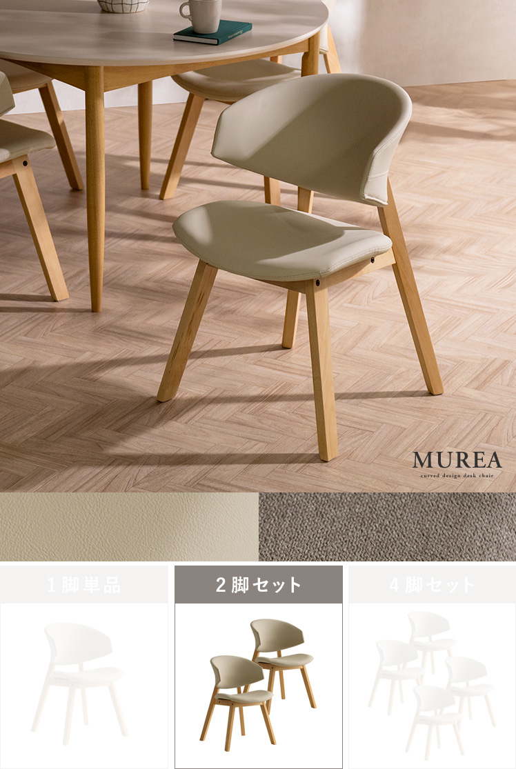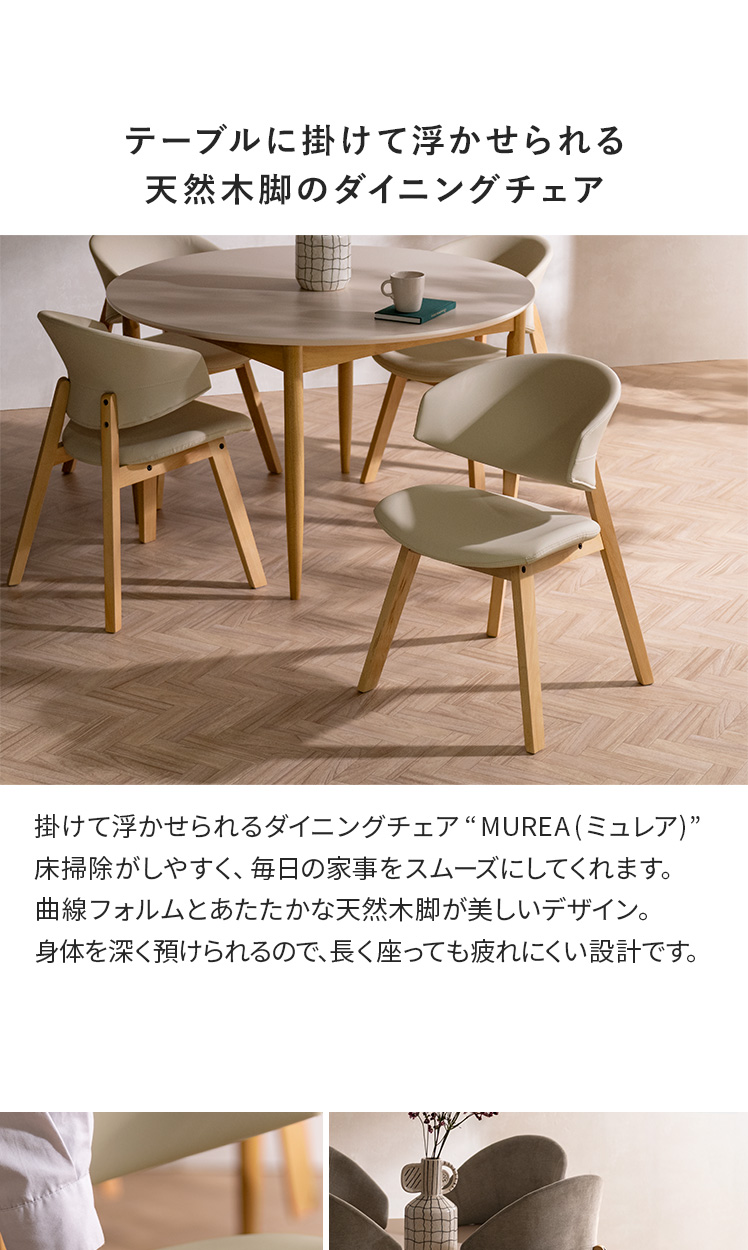 ダイニングチェア MUREA〔ミュレア〕 2脚セット販売/掛けて浮かせられるダイニングチェア“MUREA(ミュレア)” 床掃除がしやすく、毎日の家事をスムーズにしてくれます。曲線フォルムとあたたかな天然木脚が美しいデザイン。身体を深く預けられるので、長く座っても疲れにくい設計です。