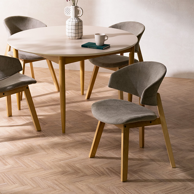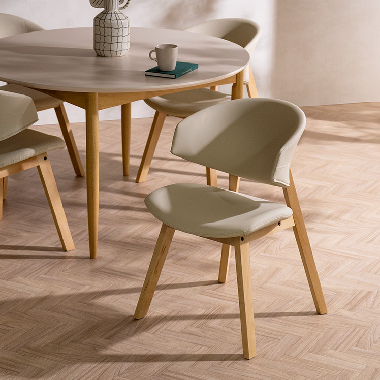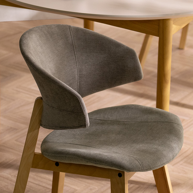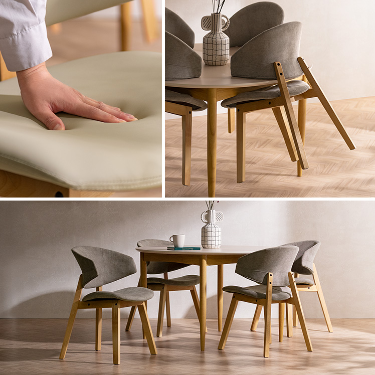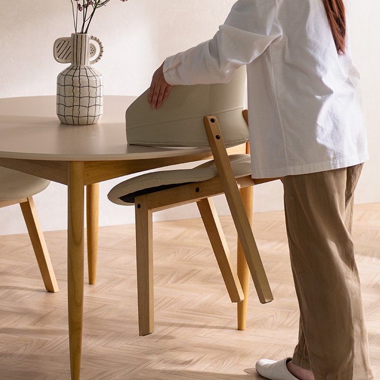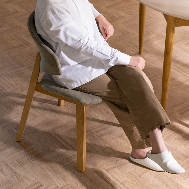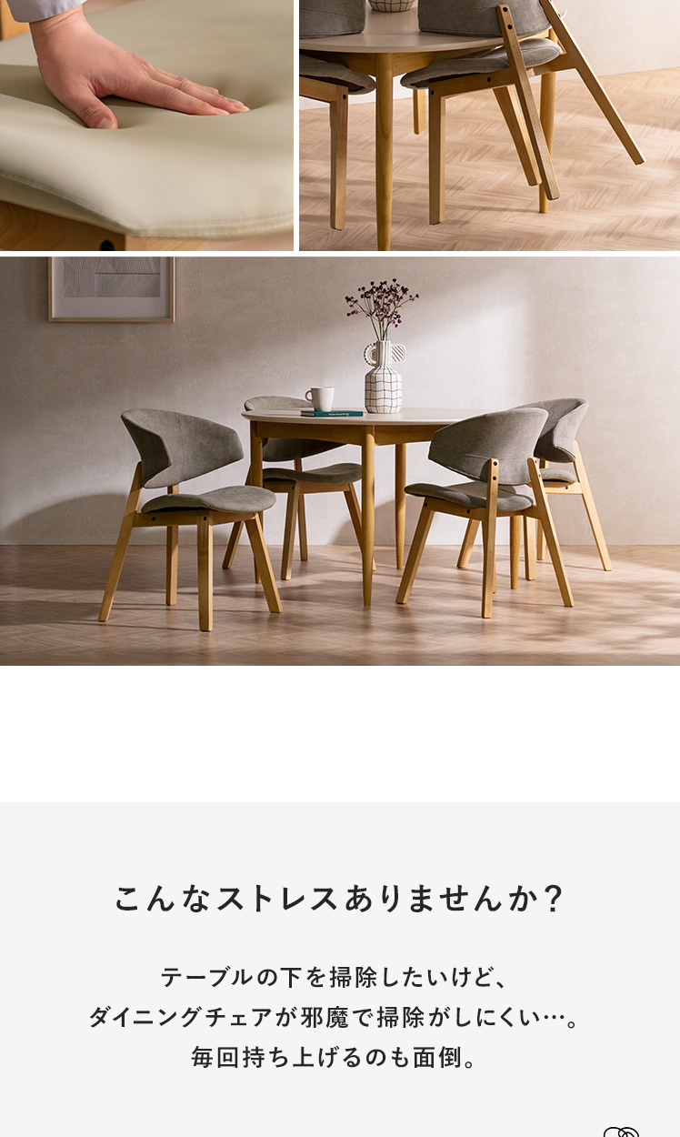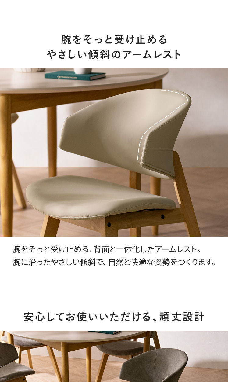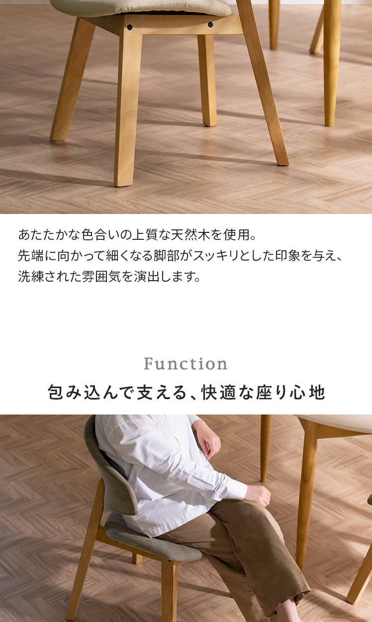 ダイニングチェア MUREA〔ミュレア〕 2脚セット販売/掛けて浮かせられるダイニングチェア“MUREA(ミュレア)” 床掃除がしやすく、毎日の家事をスムーズにしてくれます。曲線フォルムとあたたかな天然木脚が美しいデザイン。身体を深く預けられるので、長く座っても疲れにくい設計です。