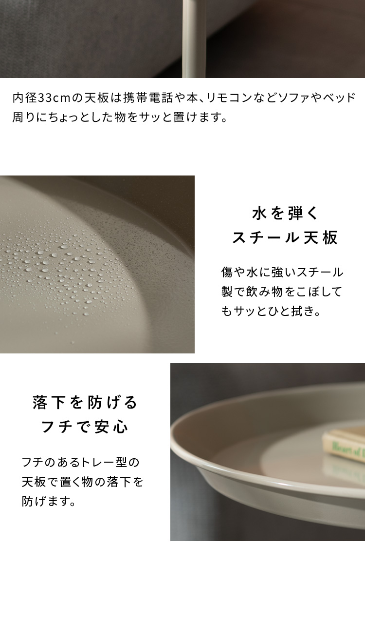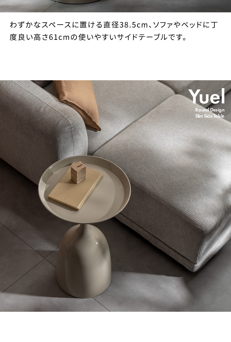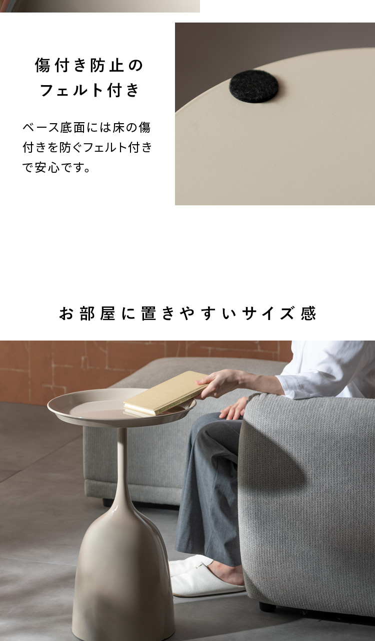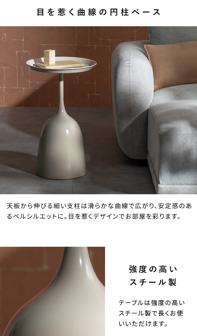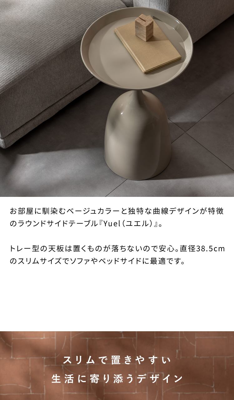 ST-T385 サイドテーブル Yuel〔ユエル〕/お部屋に馴染むベージュカラーと独特な曲線デザインが特徴のラウンドサイドテーブル『Yuel(ユエル)』。トレー型の天板は置くものが落ちないので安心。直径38.5cmのスリムサイズでソファやベッドサイドに最適です。