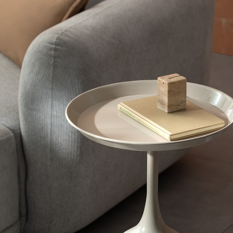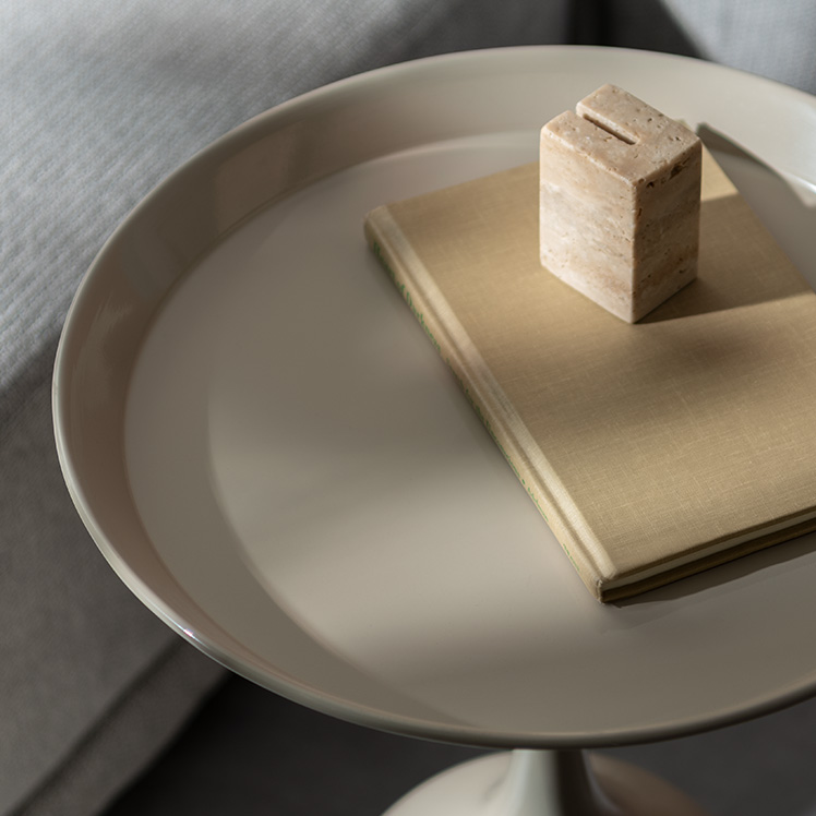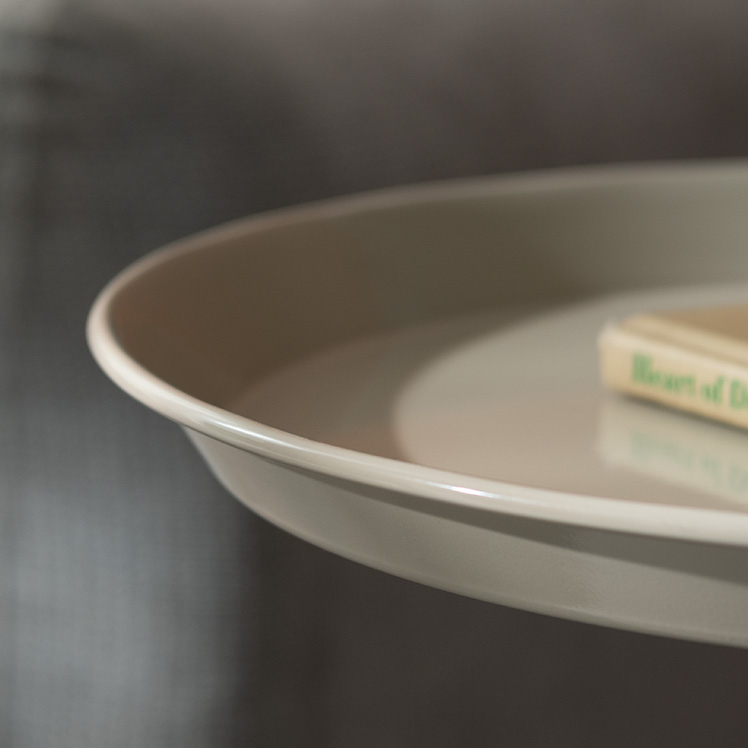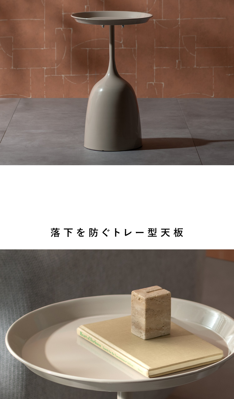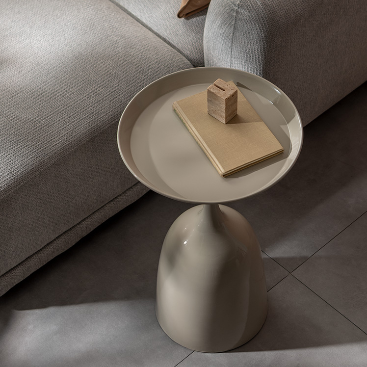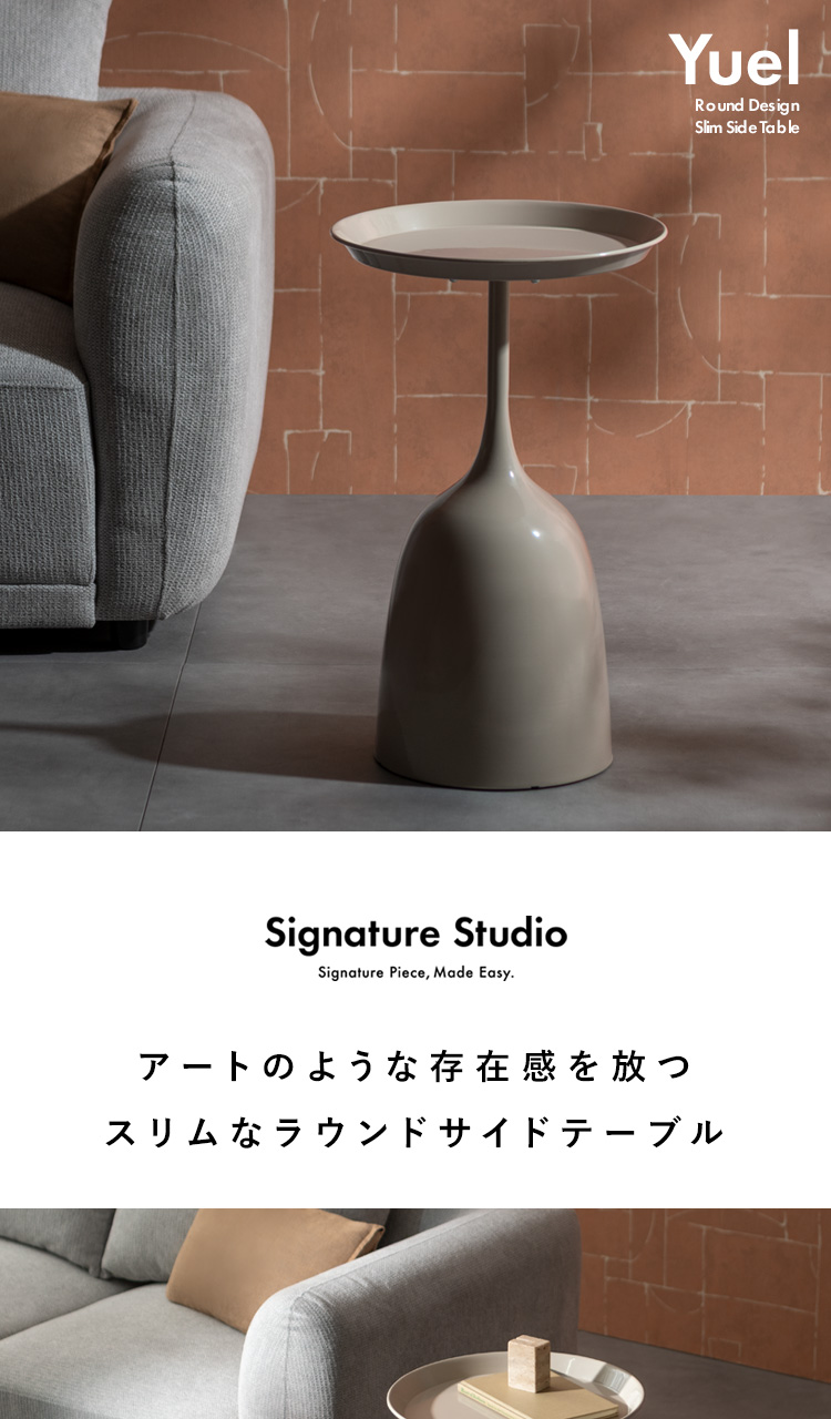 ST-T385 サイドテーブル Yuel〔ユエル〕/お部屋に馴染むベージュカラーと独特な曲線デザインが特徴のラウンドサイドテーブル『Yuel(ユエル)』。トレー型の天板は置くものが落ちないので安心。直径38.5cmのスリムサイズでソファやベッドサイドに最適です。