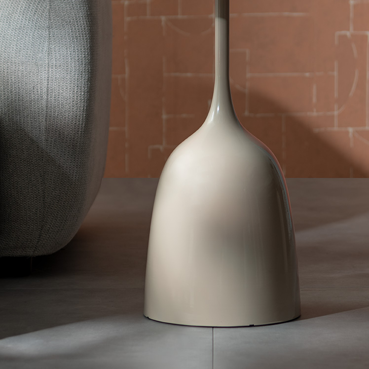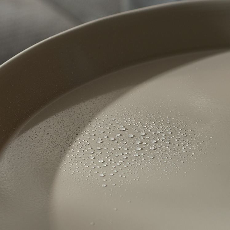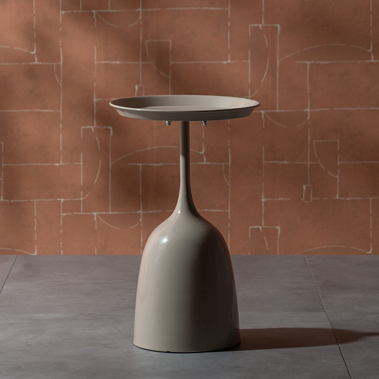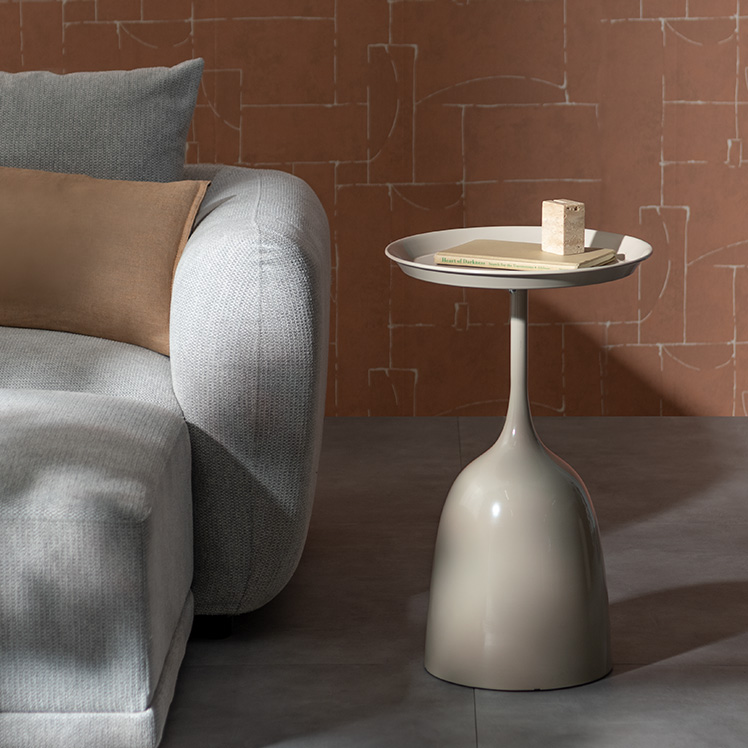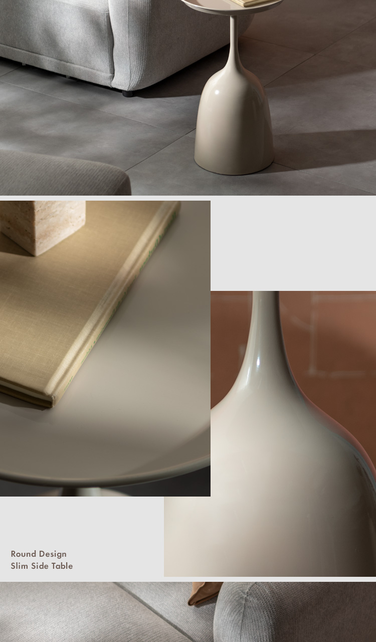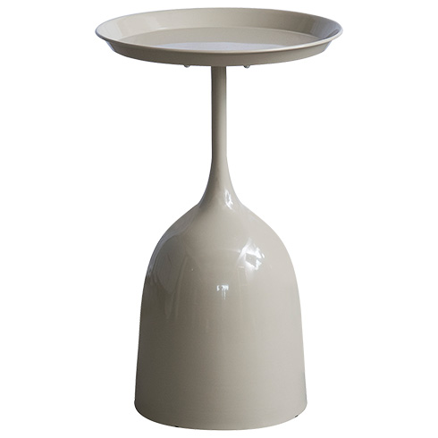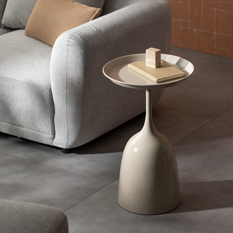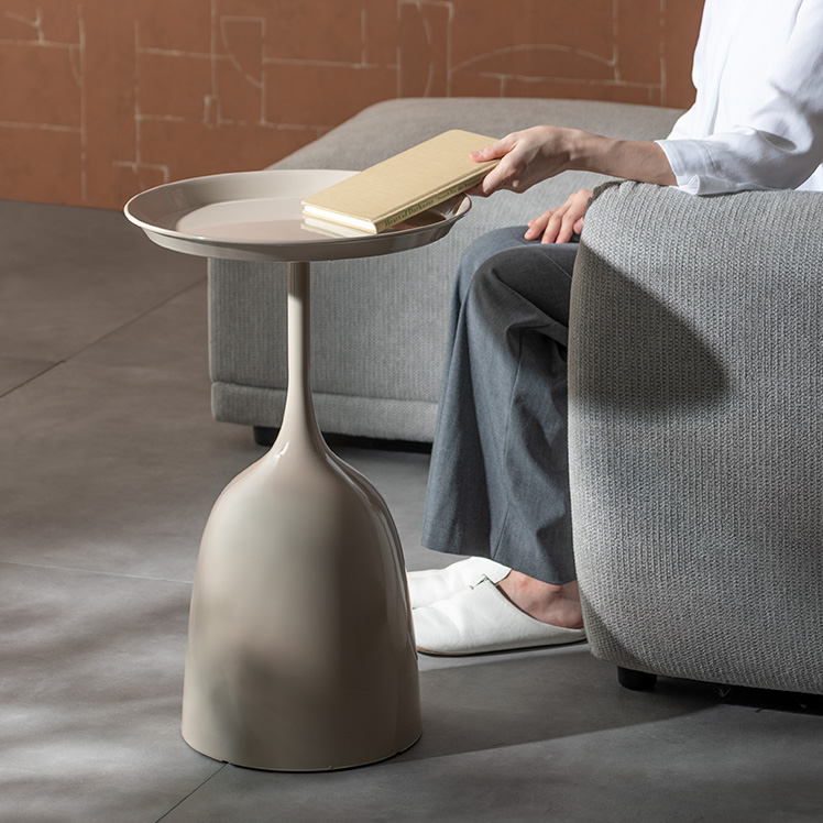 ST-T385 サイドテーブル Yuel〔ユエル〕/お部屋に馴染むベージュカラーと独特な曲線デザインが特徴のラウンドサイドテーブル『Yuel(ユエル)』。トレー型の天板は置くものが落ちないので安心。直径38.5cmのスリムサイズでソファやベッドサイドに最適です。
