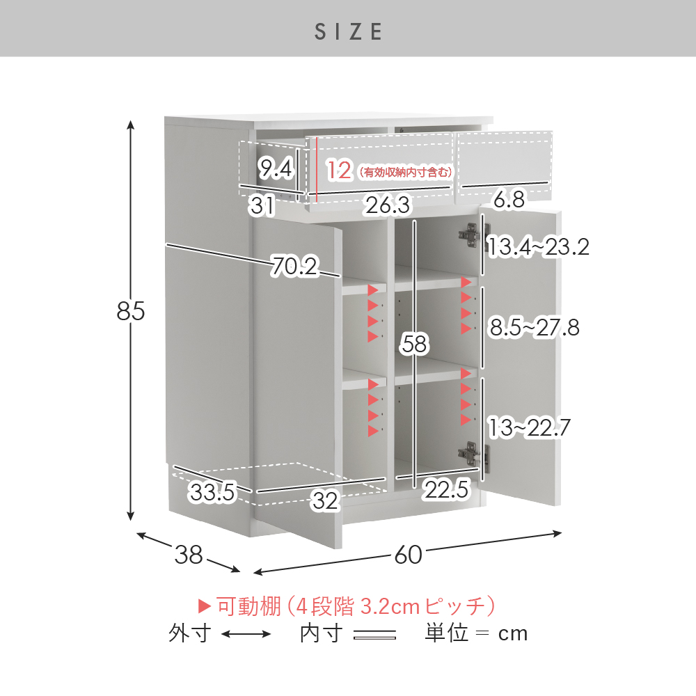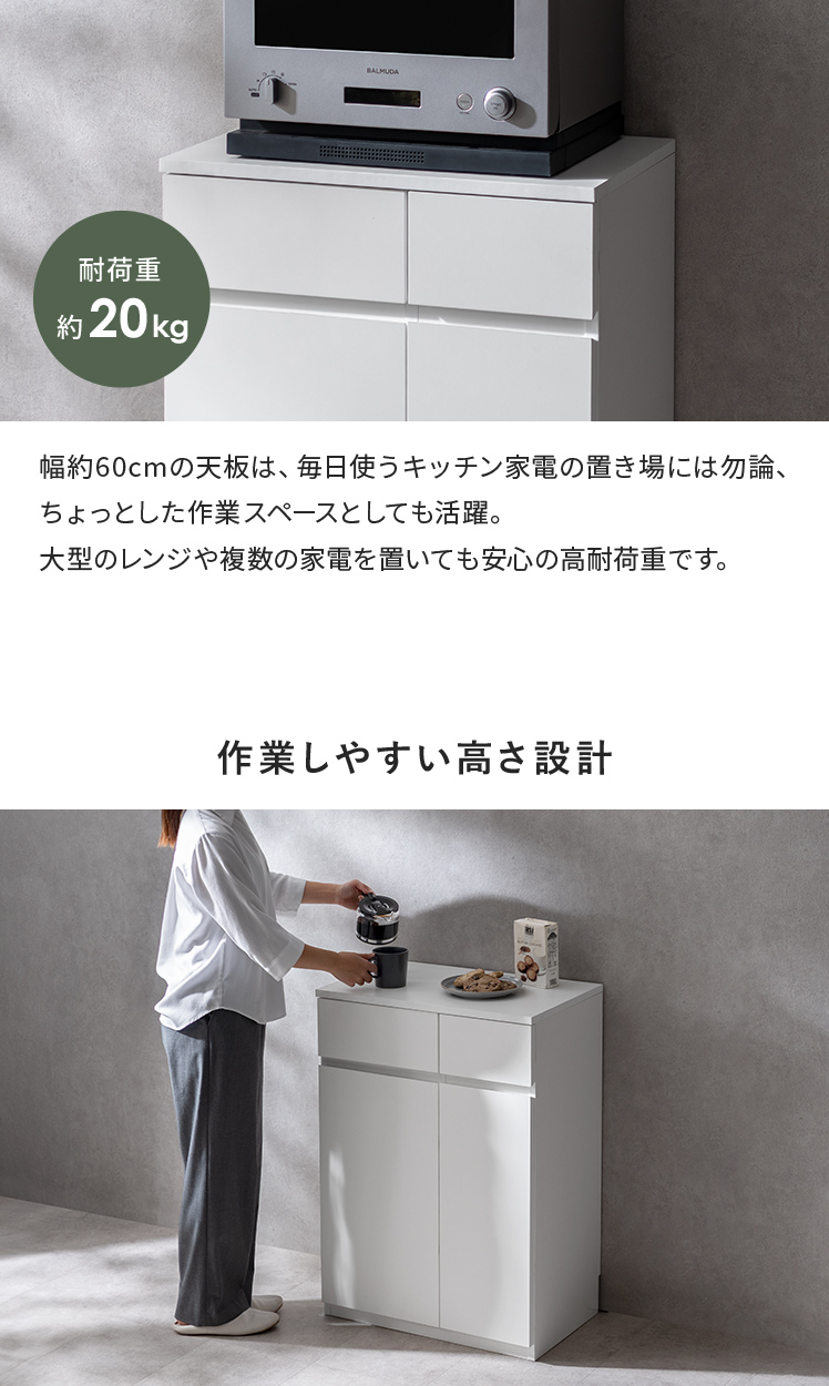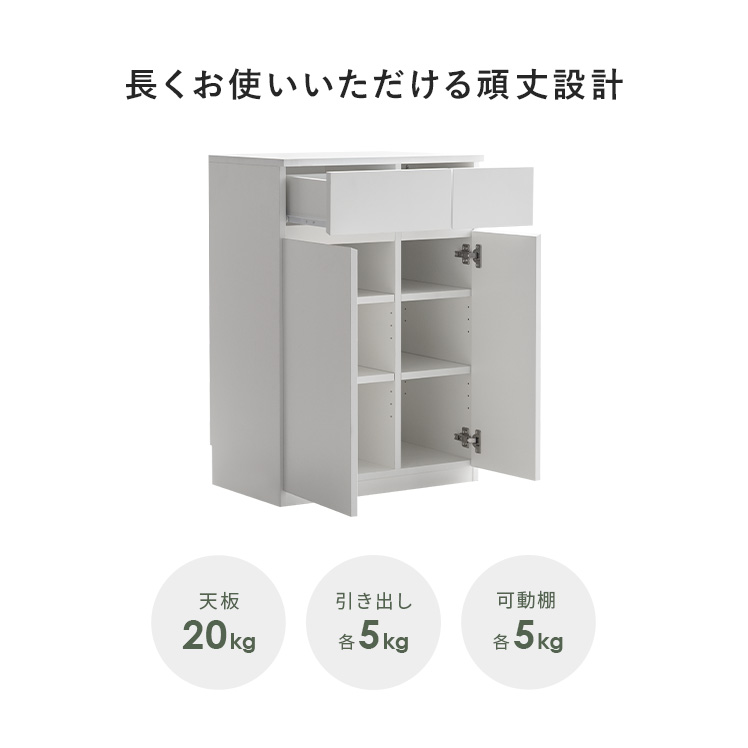 | 耐荷重 | 天板/約20kg、可動棚/約5kg、引き出し/約5kg |