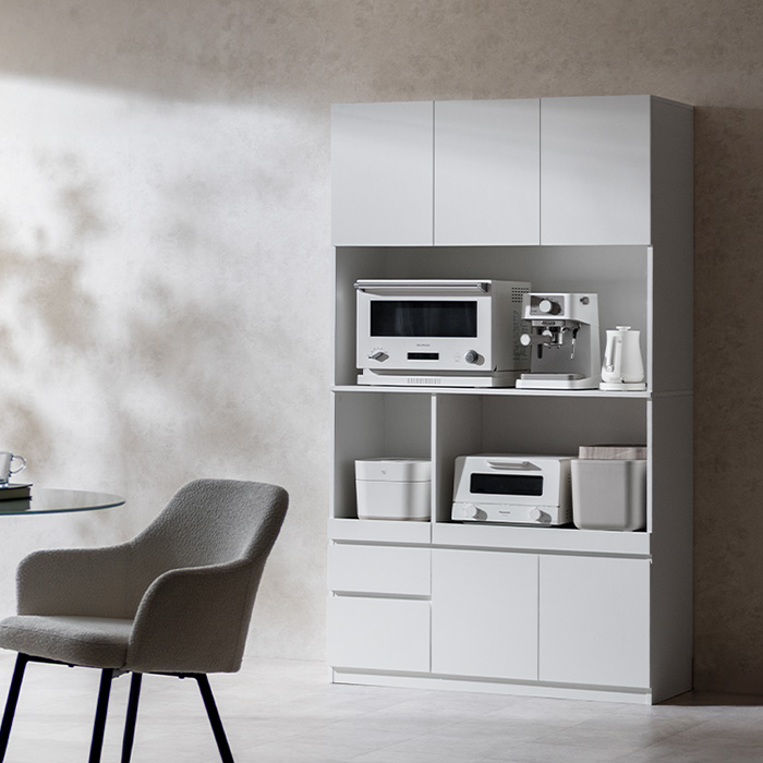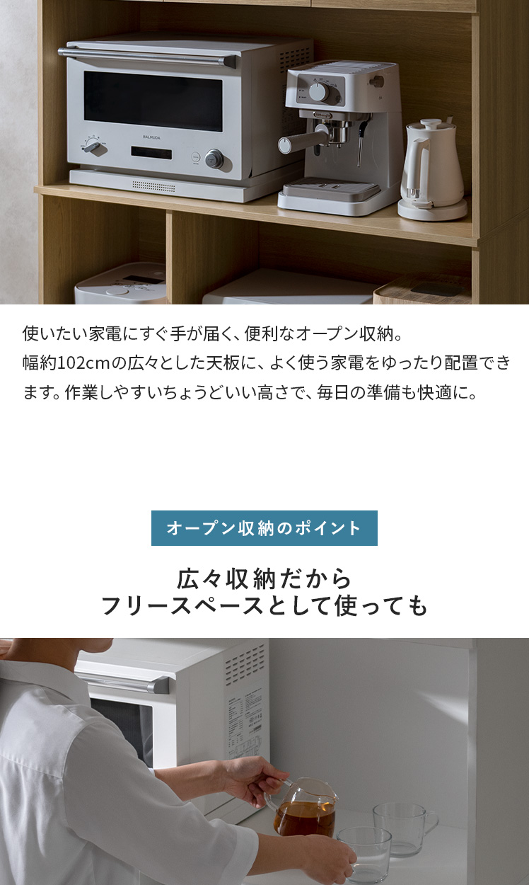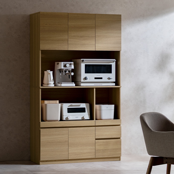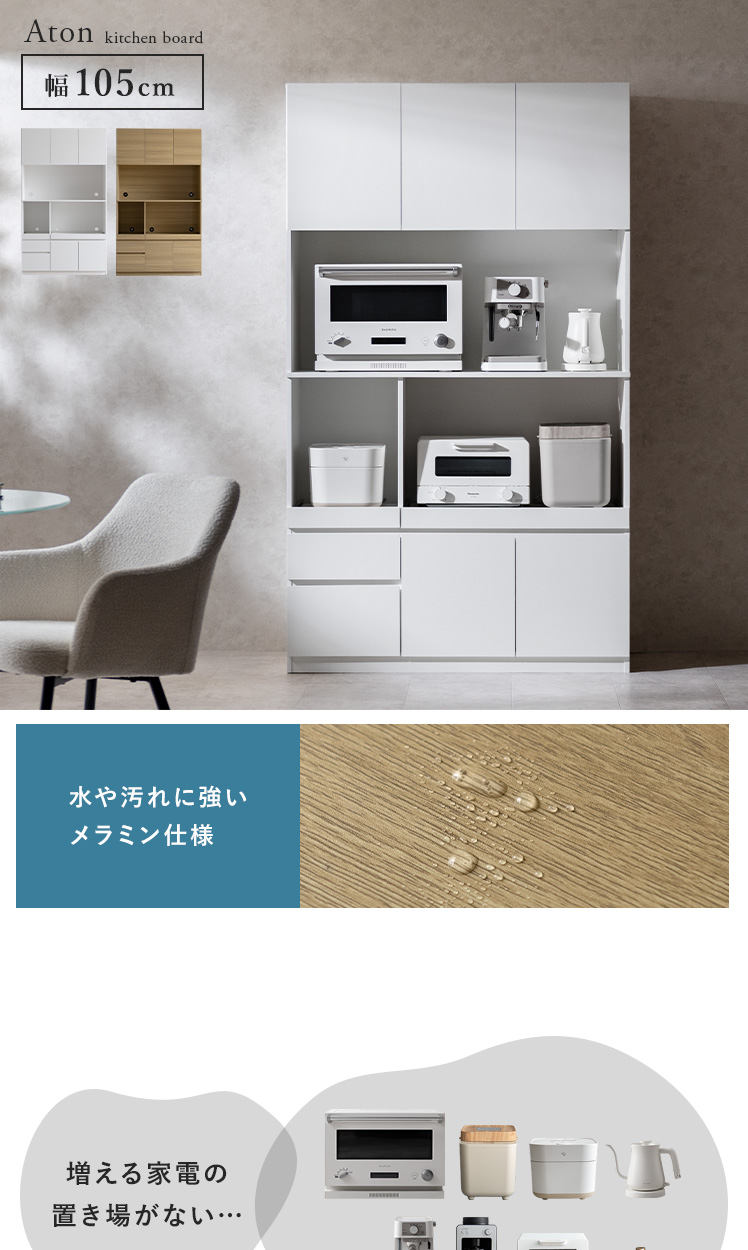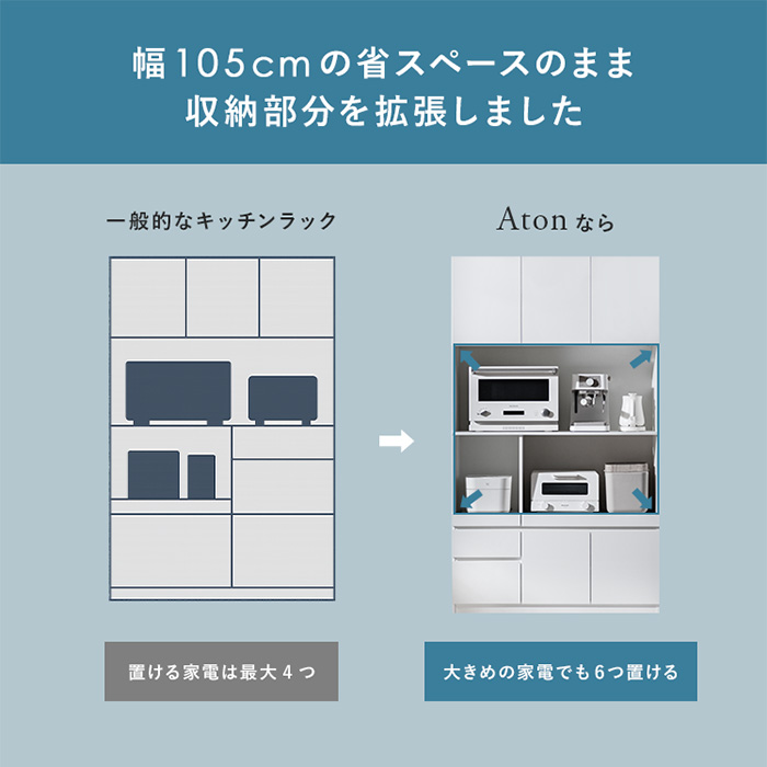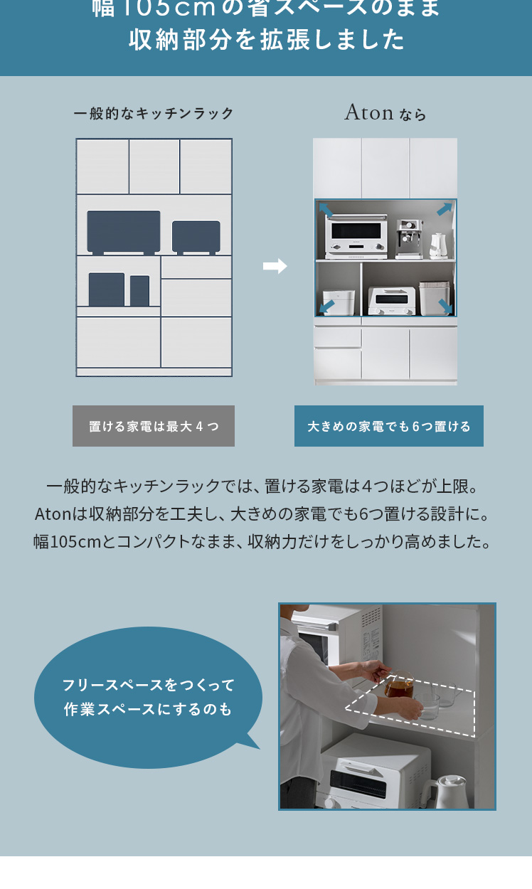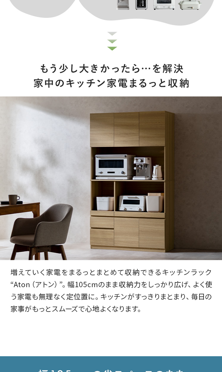 家電がたくさん置けるキッチンラック Aton〔アトン〕幅105cm/増えていく家電をまるっとまとめて収納できるキッチンラック“Aton(アトン)”。幅105cmのまま収納力をしっかり広げ、よく使う家電も無理なく定位置に。キッチンがすっきりまとまり、毎日の家事がもっとスムーズで心地よくなります。