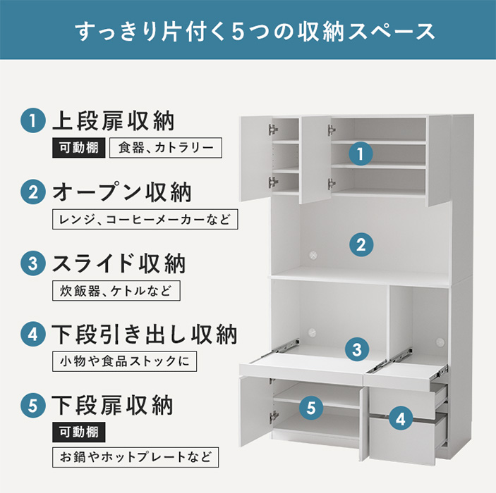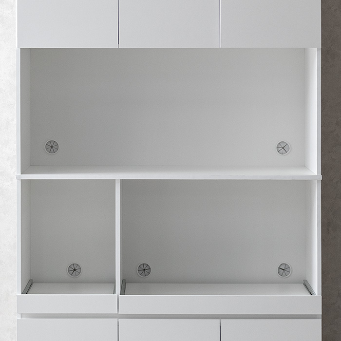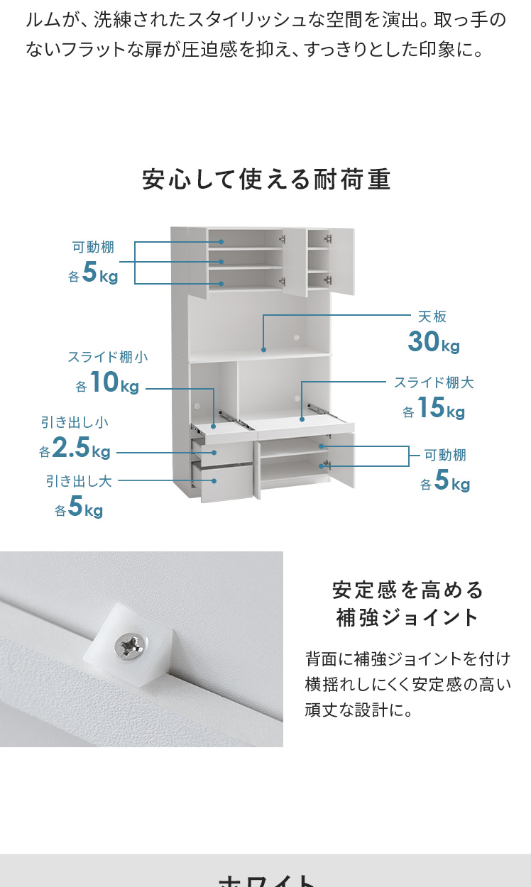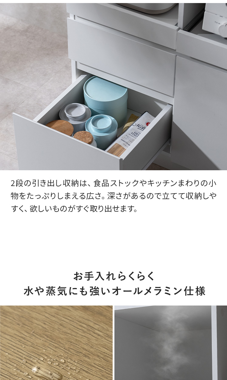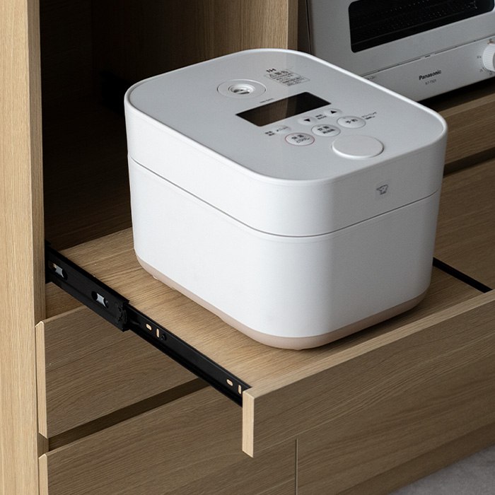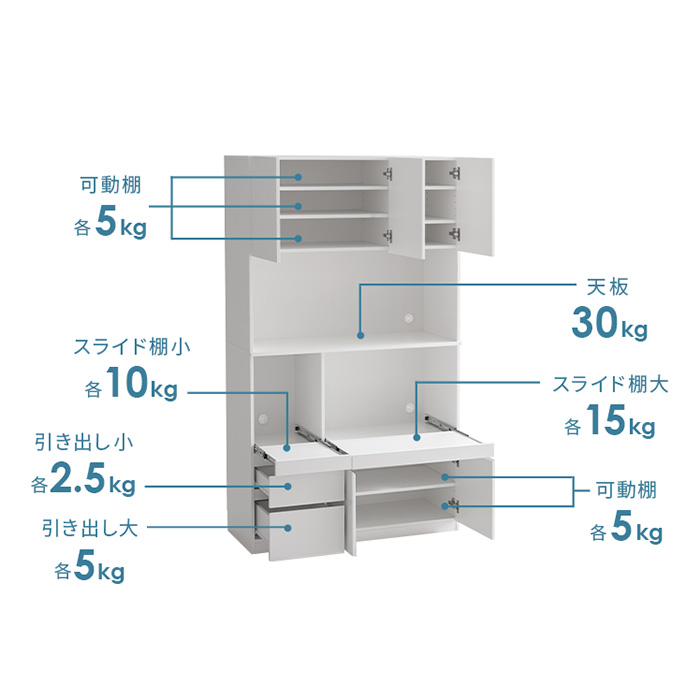 | 耐荷重 | 天板/約30kg、スライド棚(小)/約10kg、スライド棚(大)/約15kg、引出し収納(小)/約2.5kg、引出し収納(大)/約5kg、可動棚/各5kg |