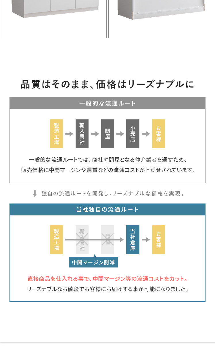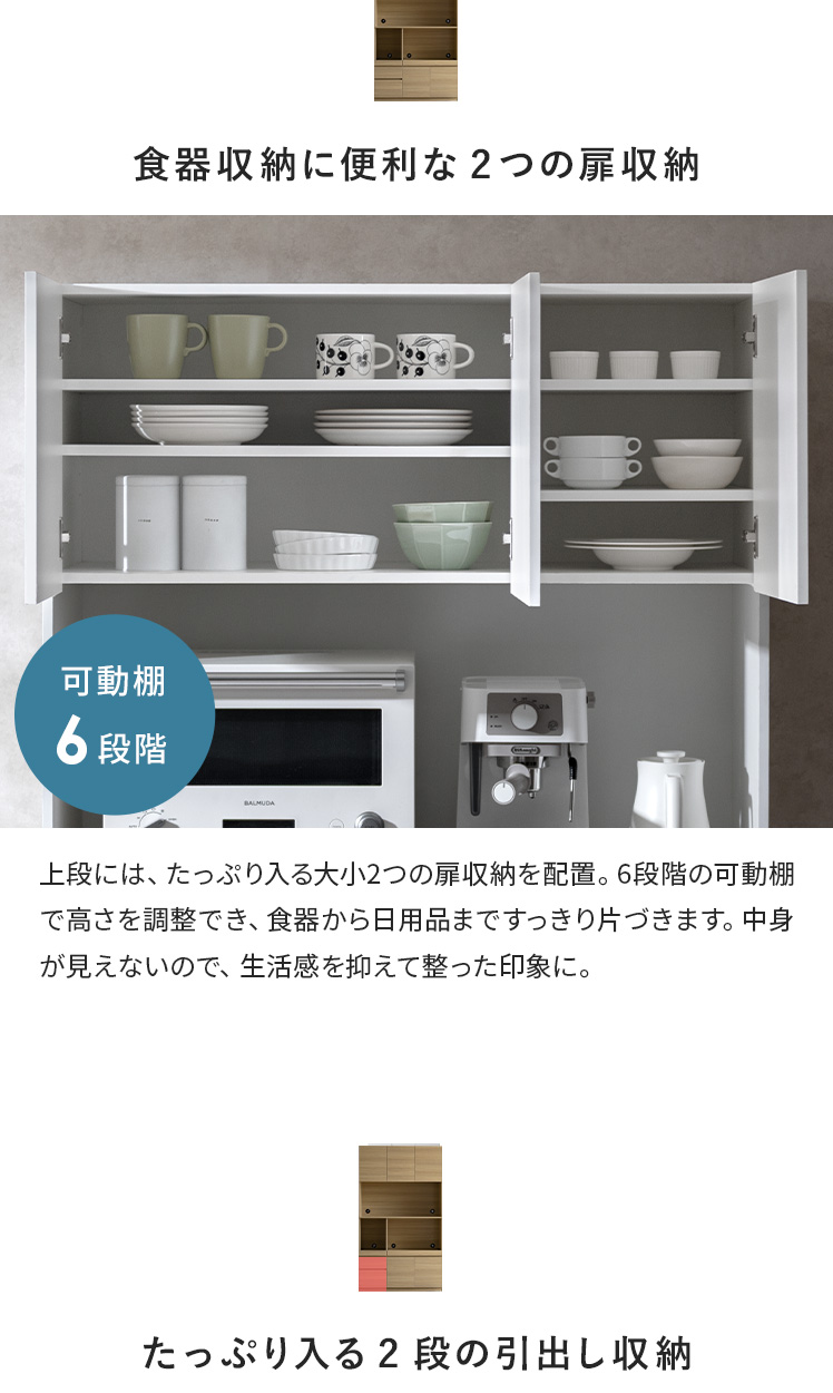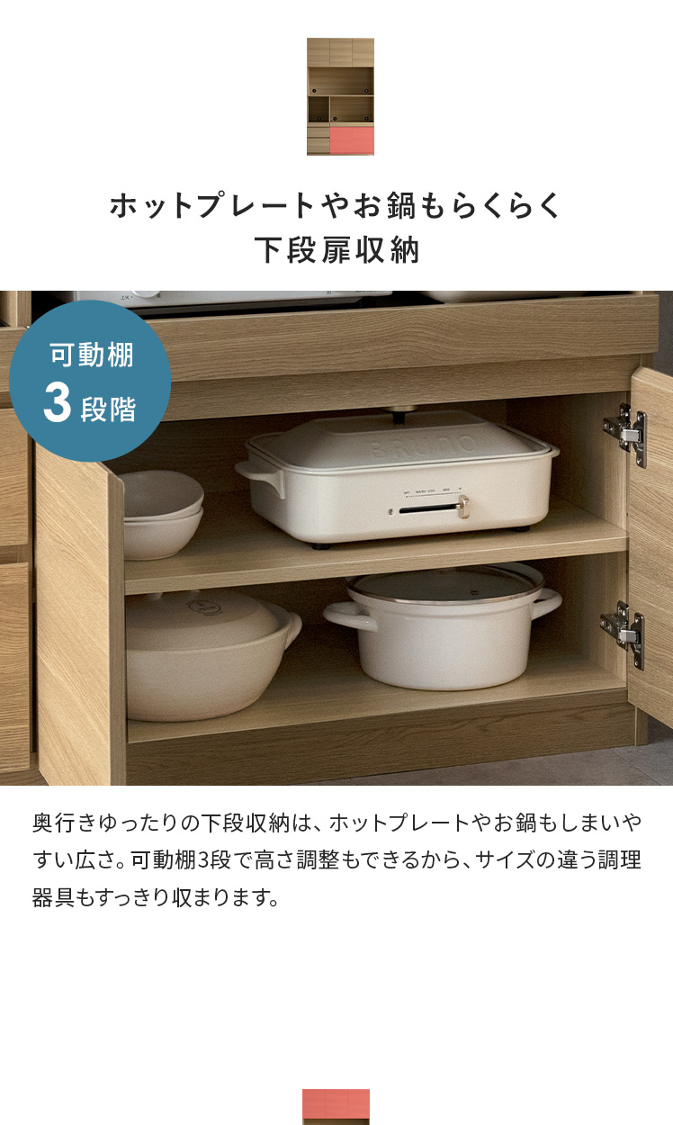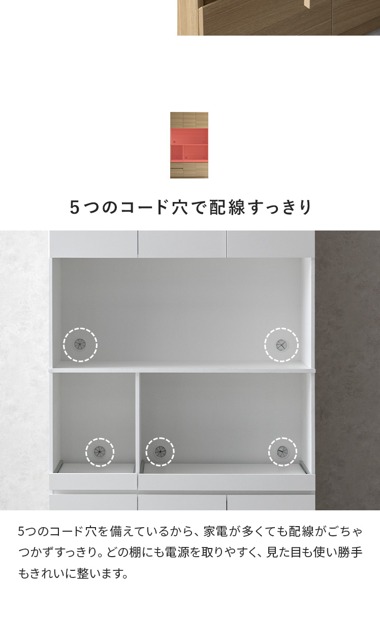 | 耐荷重 | 天板/約30kg、スライド棚(小)/約10kg、スライド棚(大)/約15kg、引出し収納(小)/約2.5kg、引出し収納(大)/約5kg、可動棚/各5kg |