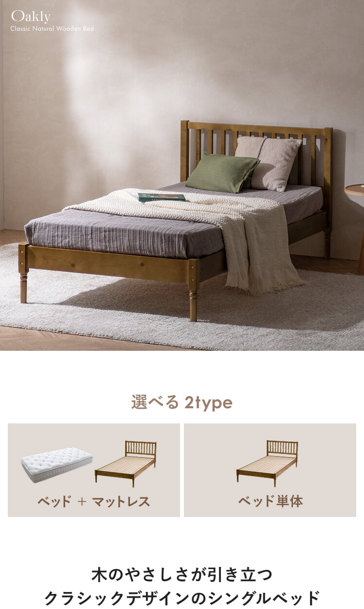 ナチュラルクラシックなベッド Oakly〔オークリー〕ベッドフレーム+マットレスセット/天然木の落ち着いた風合いと縦格子のクラシカルなフレームが、お部屋を一気に憧れのアンティーク空間へと引き上げるシングルベッド。 通気性の良いすのこ仕様で、見た目だけでなく使い心地にもこだわった一台です。