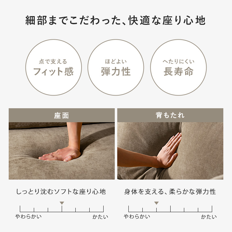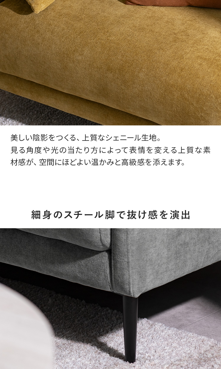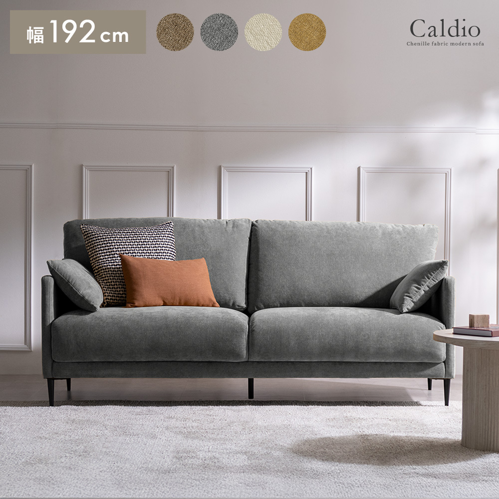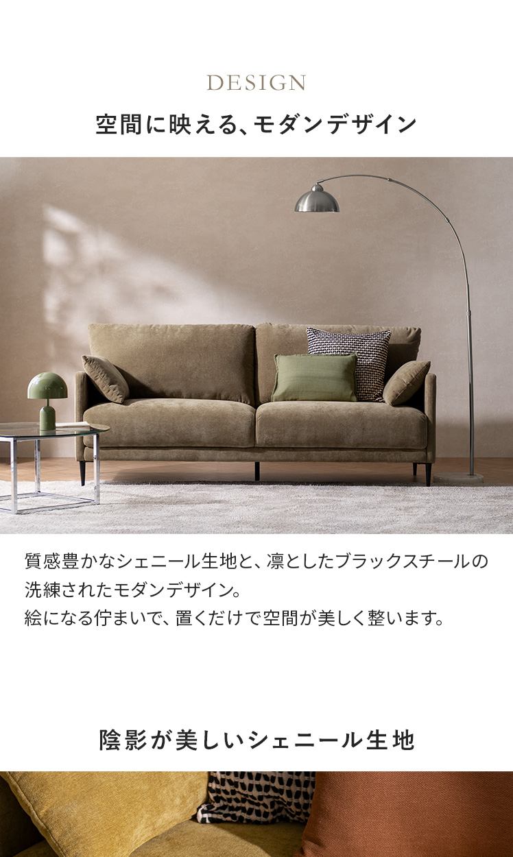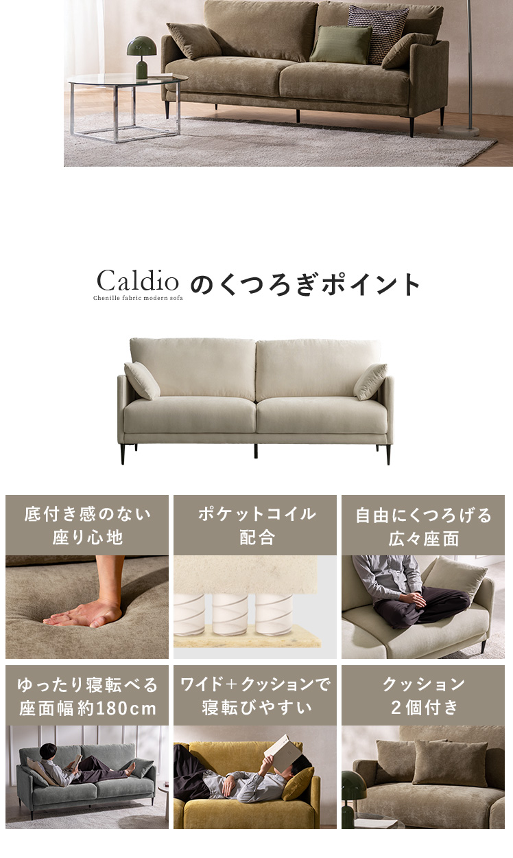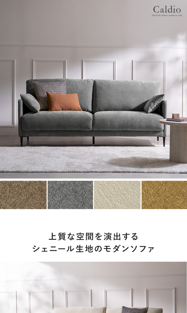 クッション付きモダンソファ Caldio〔カルディオ〕/表情豊かなシェニール生地が上質な空間を演出する、クッション付きモダンソファ“Caldio(カルディオ)”。ポケットコイルの弾力と極厚ウレタンの適度な沈み込みが身体を心地よく支え、贅沢なくつろぎ時間をもたらします。
