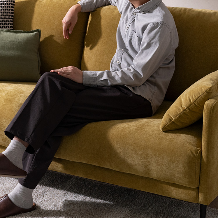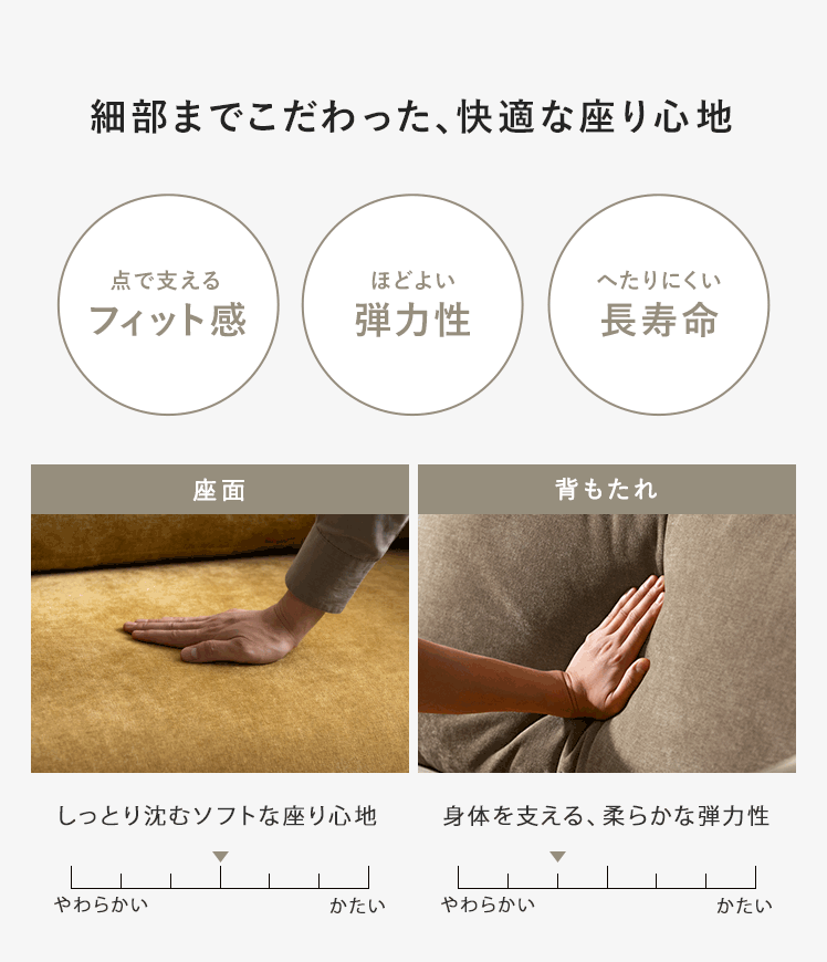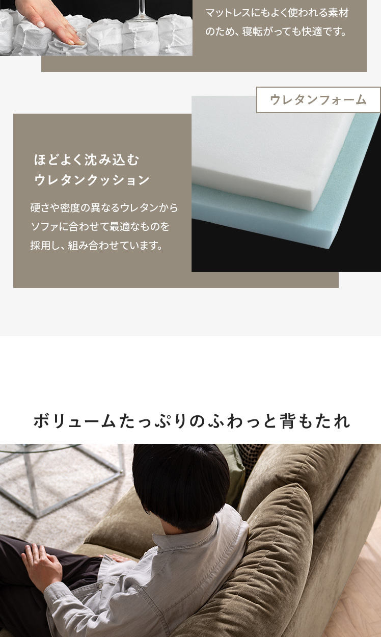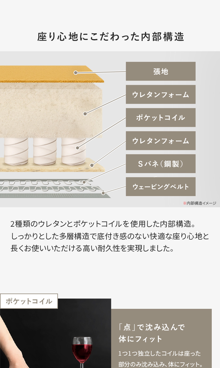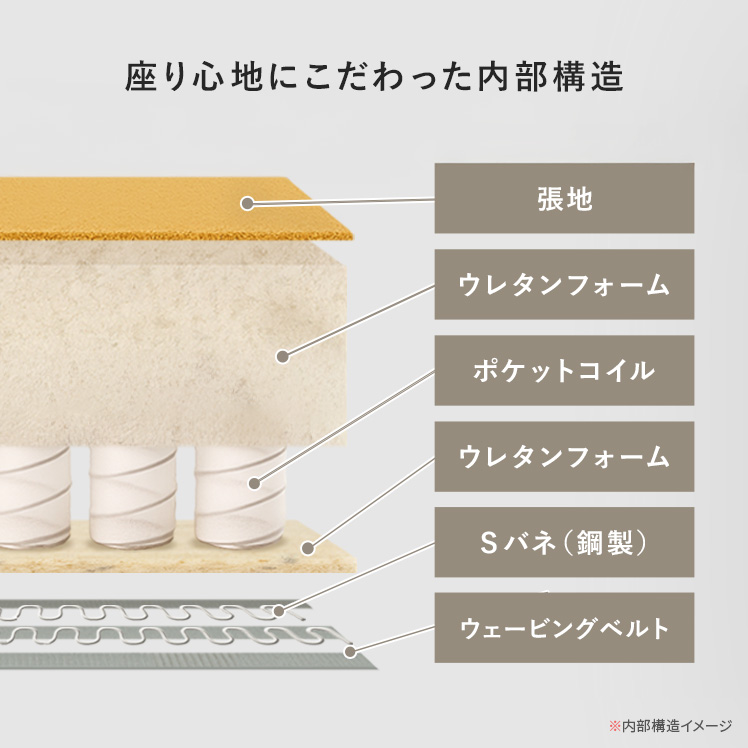 | 材質 | 本体/銅製バネ、ウレタン、ポケットコイル、ウェービングベルト 脚/スチール(粉体塗装仕上げ) 張地/ポリエステル100% クッション材/ウレタンフォーム |